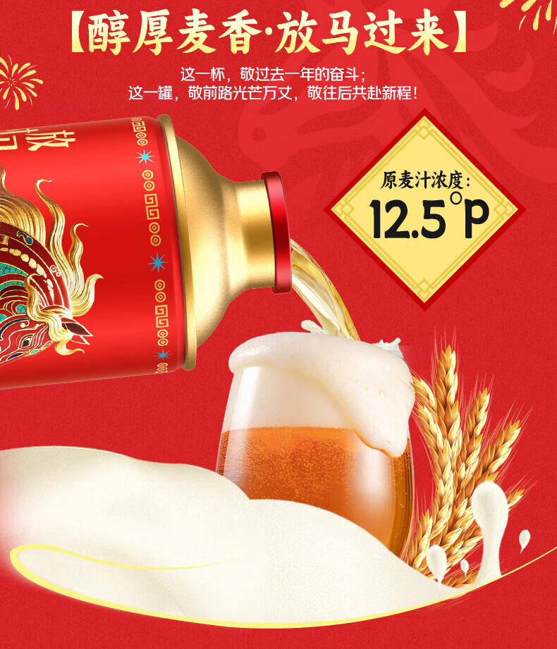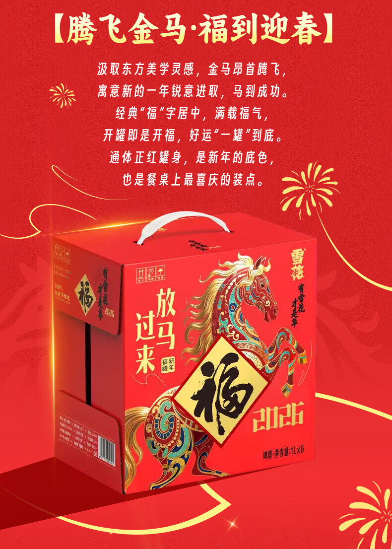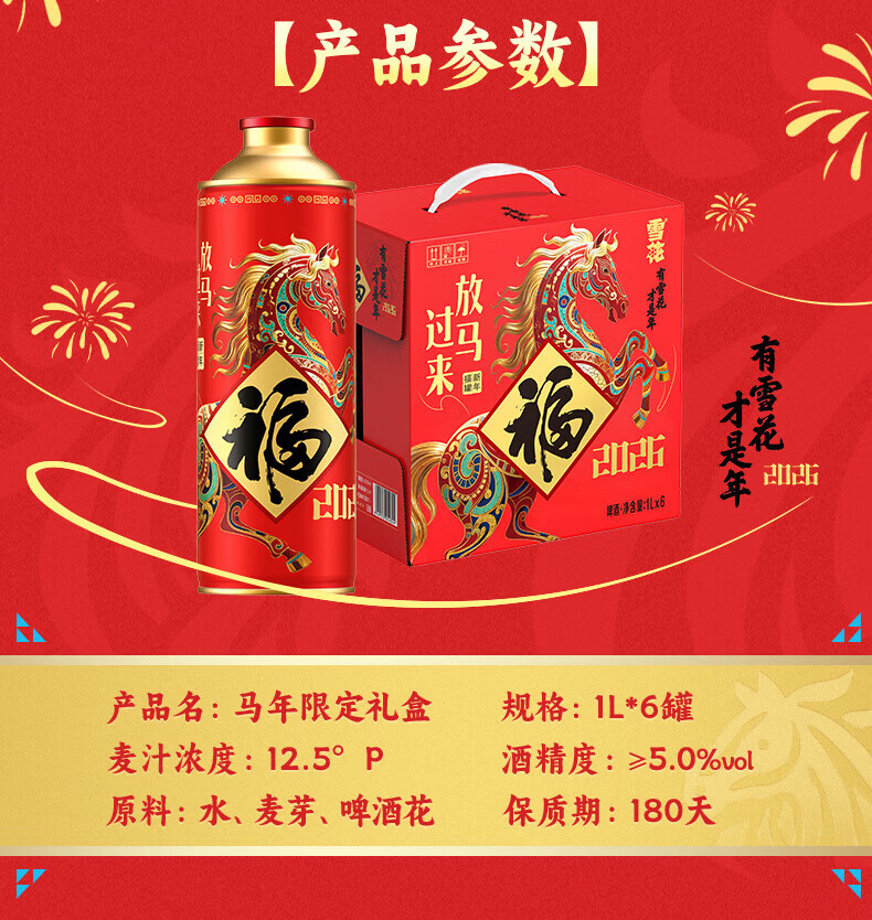 雪花【新品上市 马年限定】12.5°P福罐装啤酒礼盒装1L*6罐春节送礼 雪花福罐啤酒1L*6罐