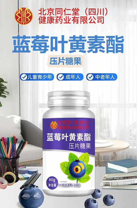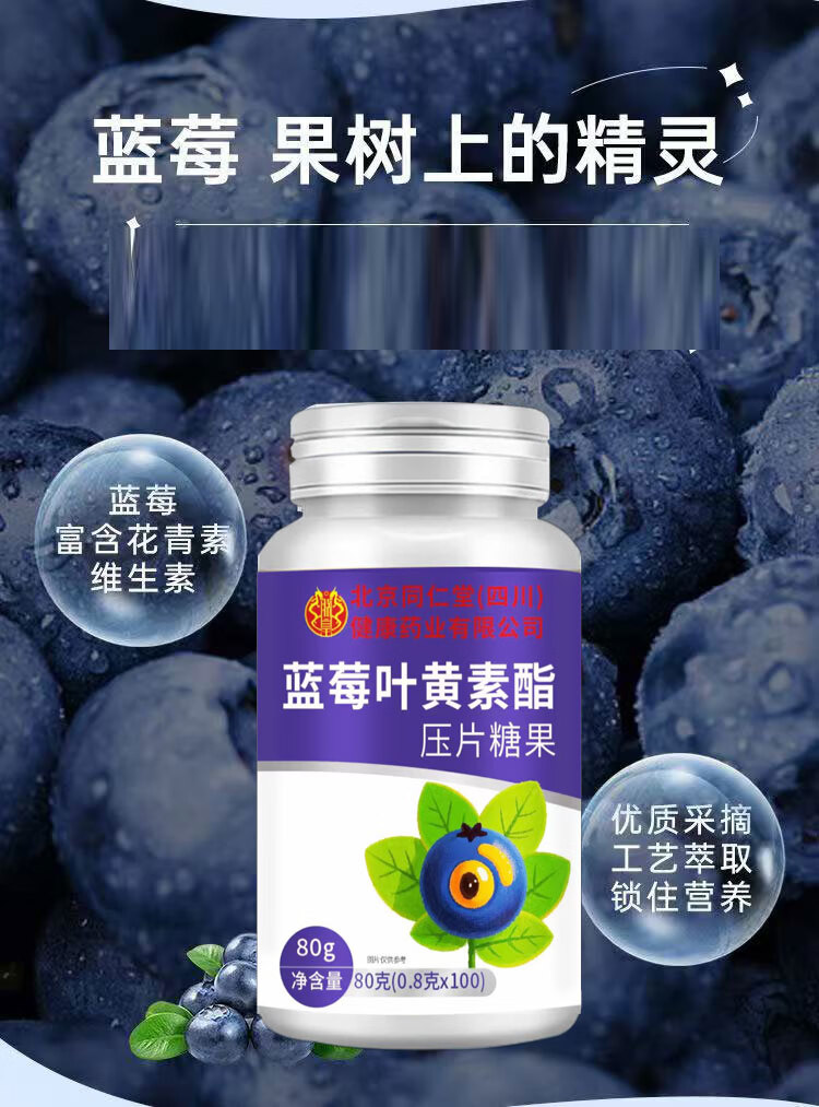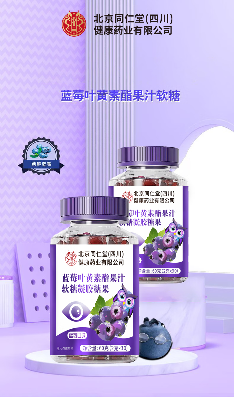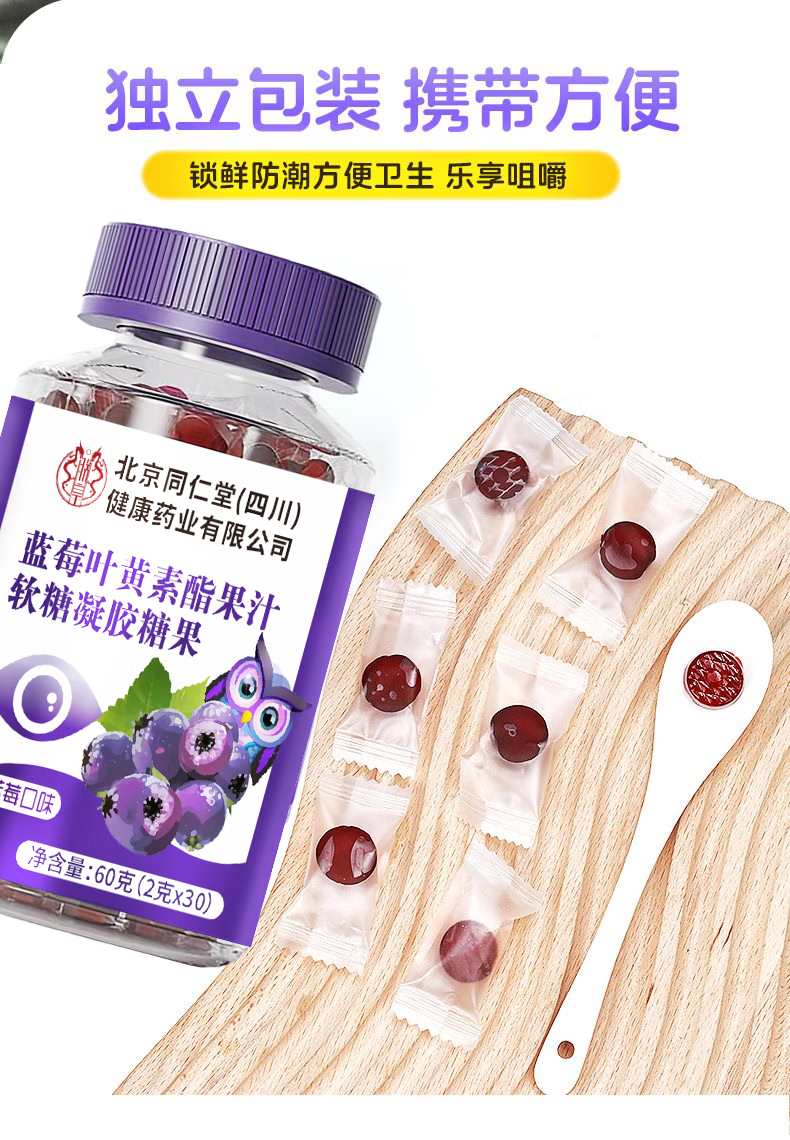朕皇北京同仁堂蓝莓叶黄素酯片全家皆可食用 蓝莓叶黄素果汁软糖 60g*5瓶