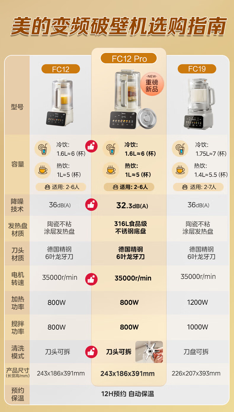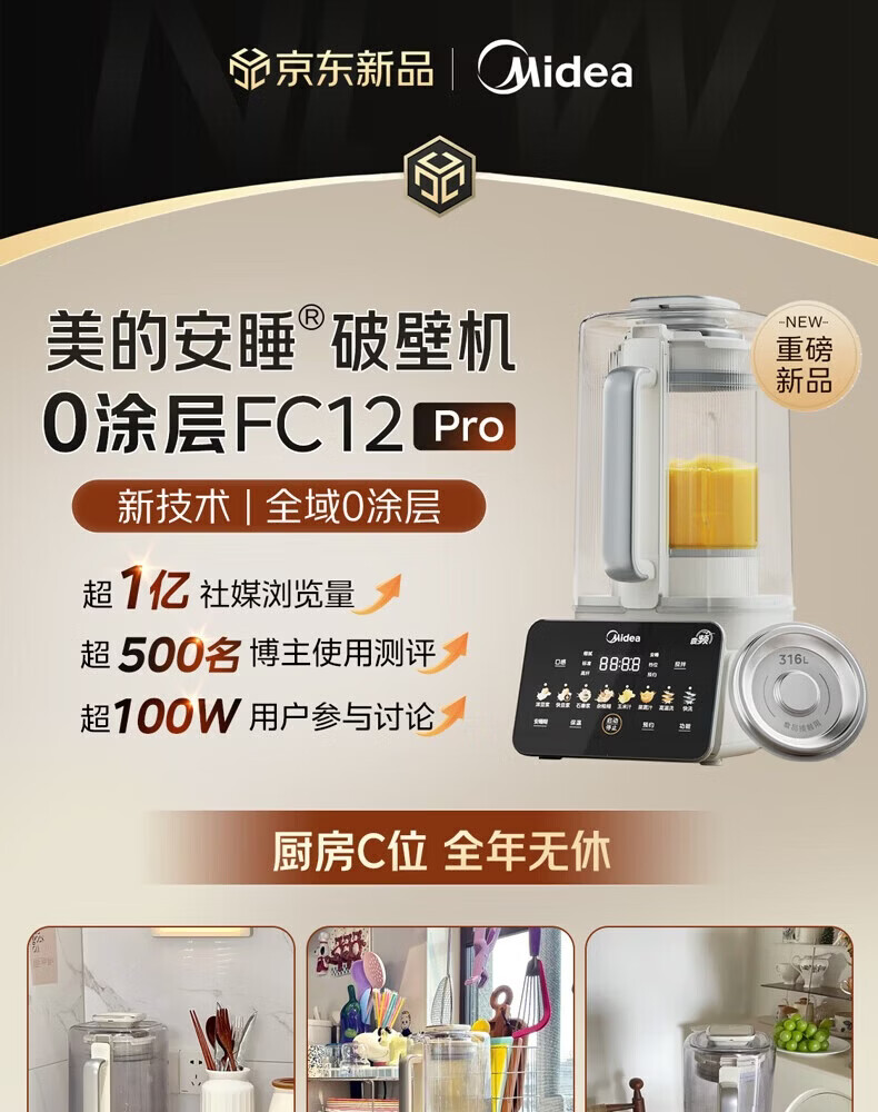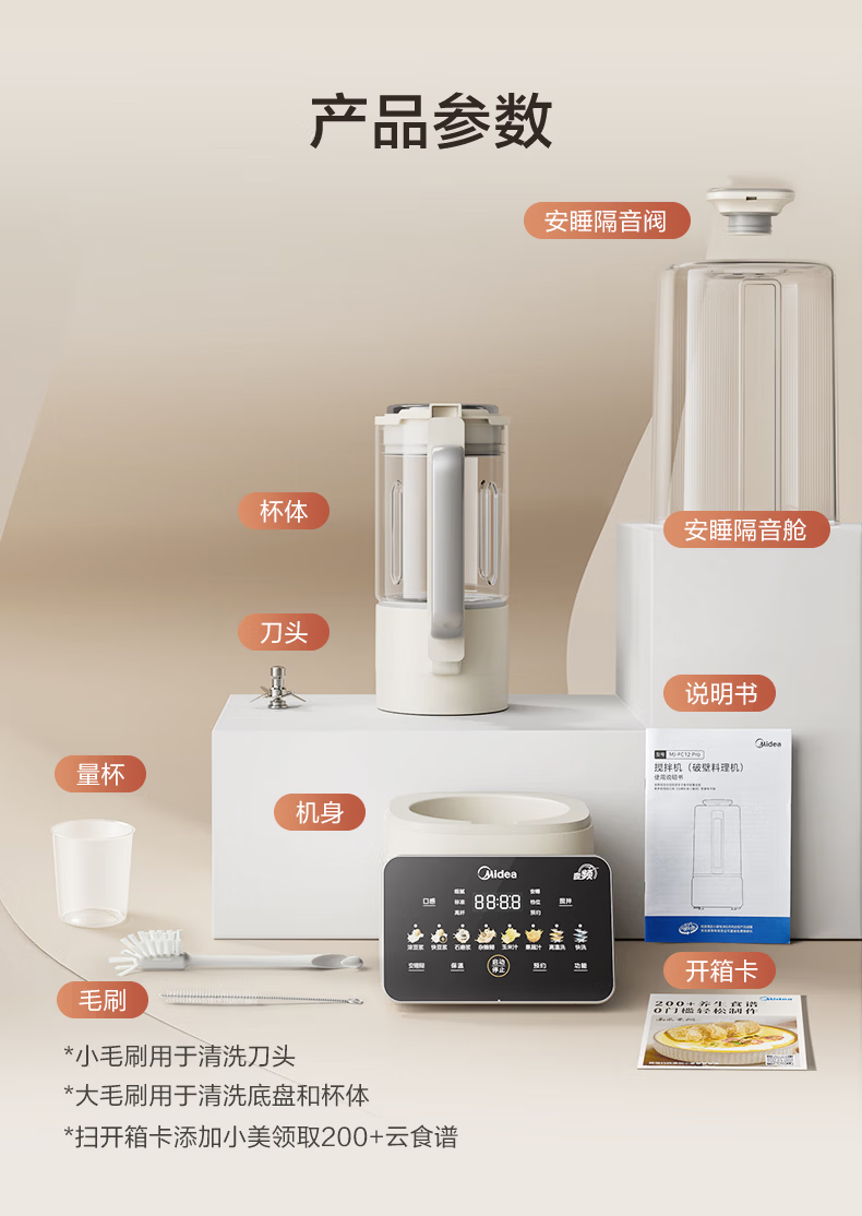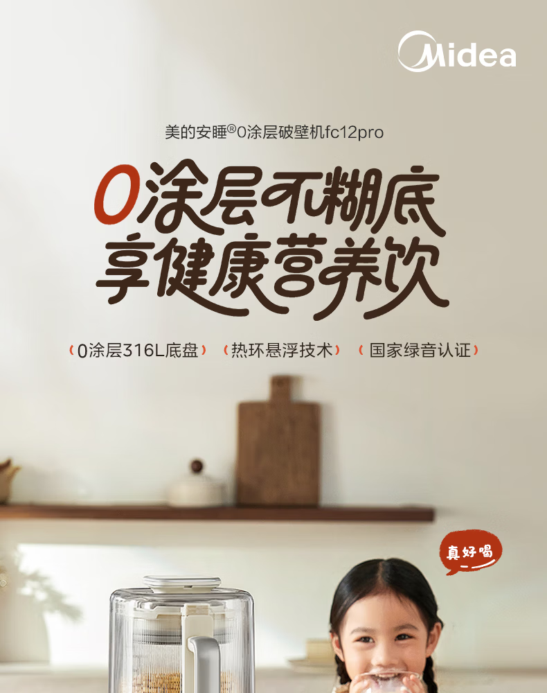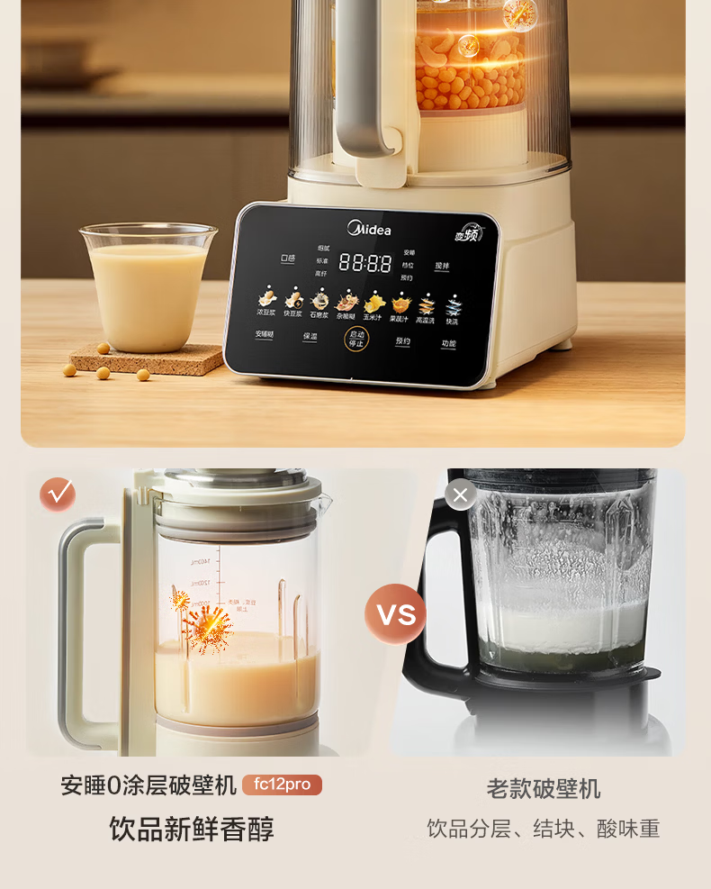 美的(Midea)新款安睡变频0涂层破壁机 1.6L家用轻音全自动多功能料理榨汁辅食豆浆机 3-5人用可拆补贴 FC12Pro