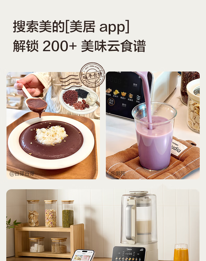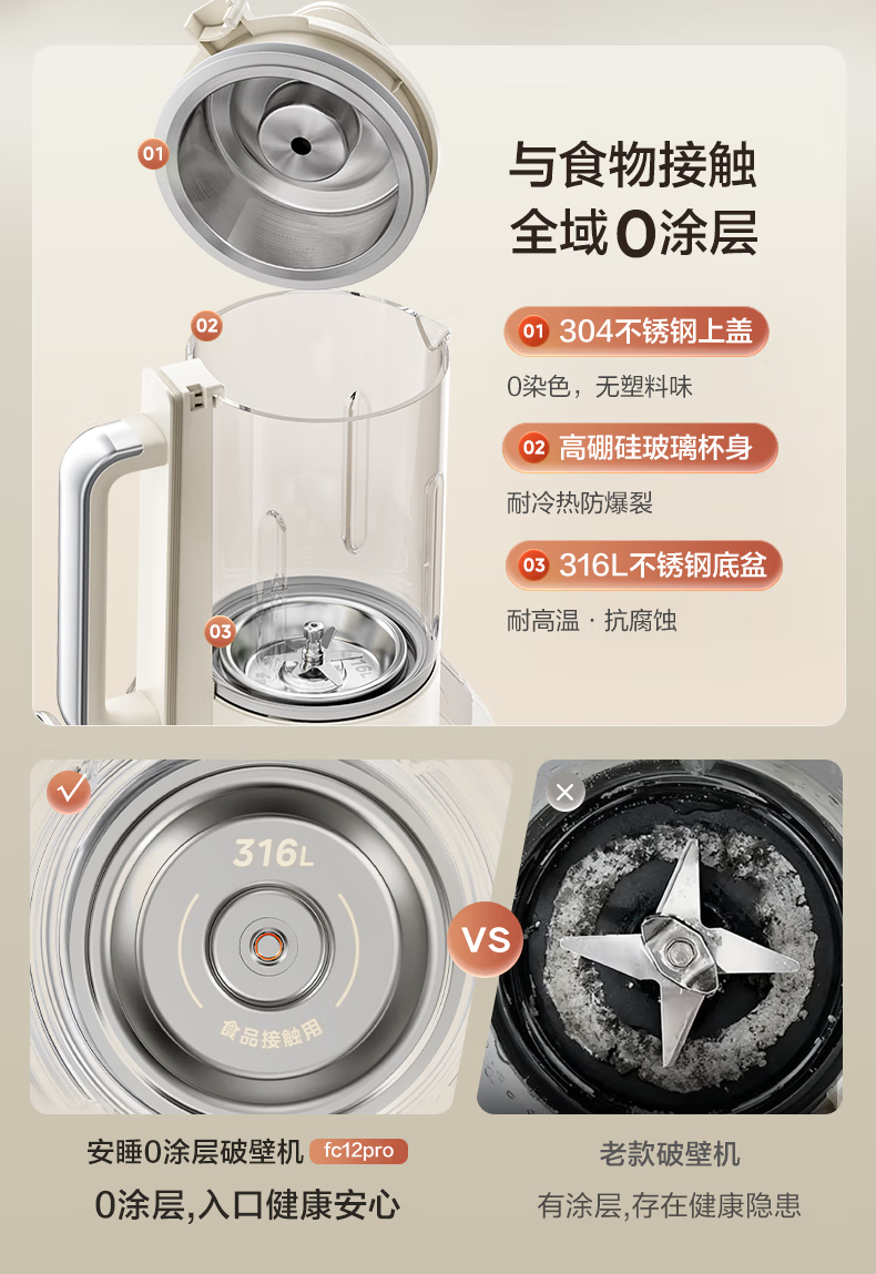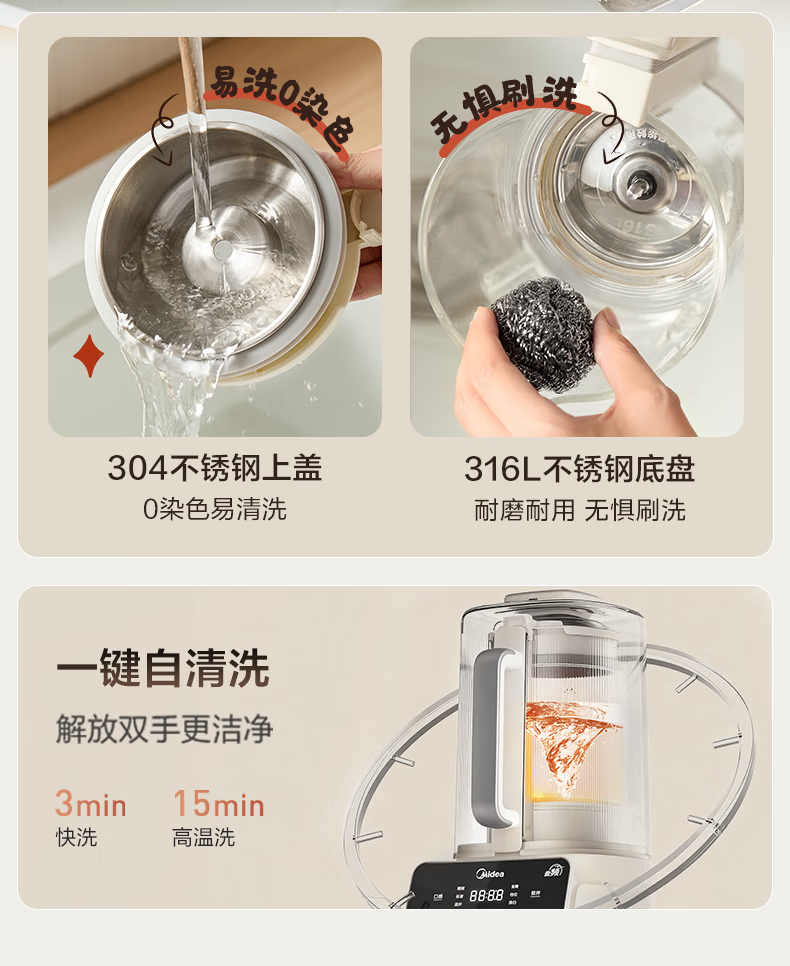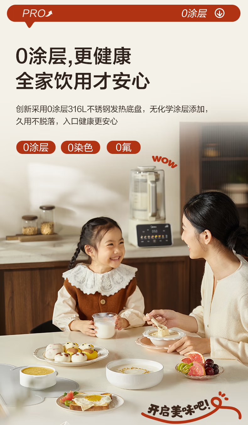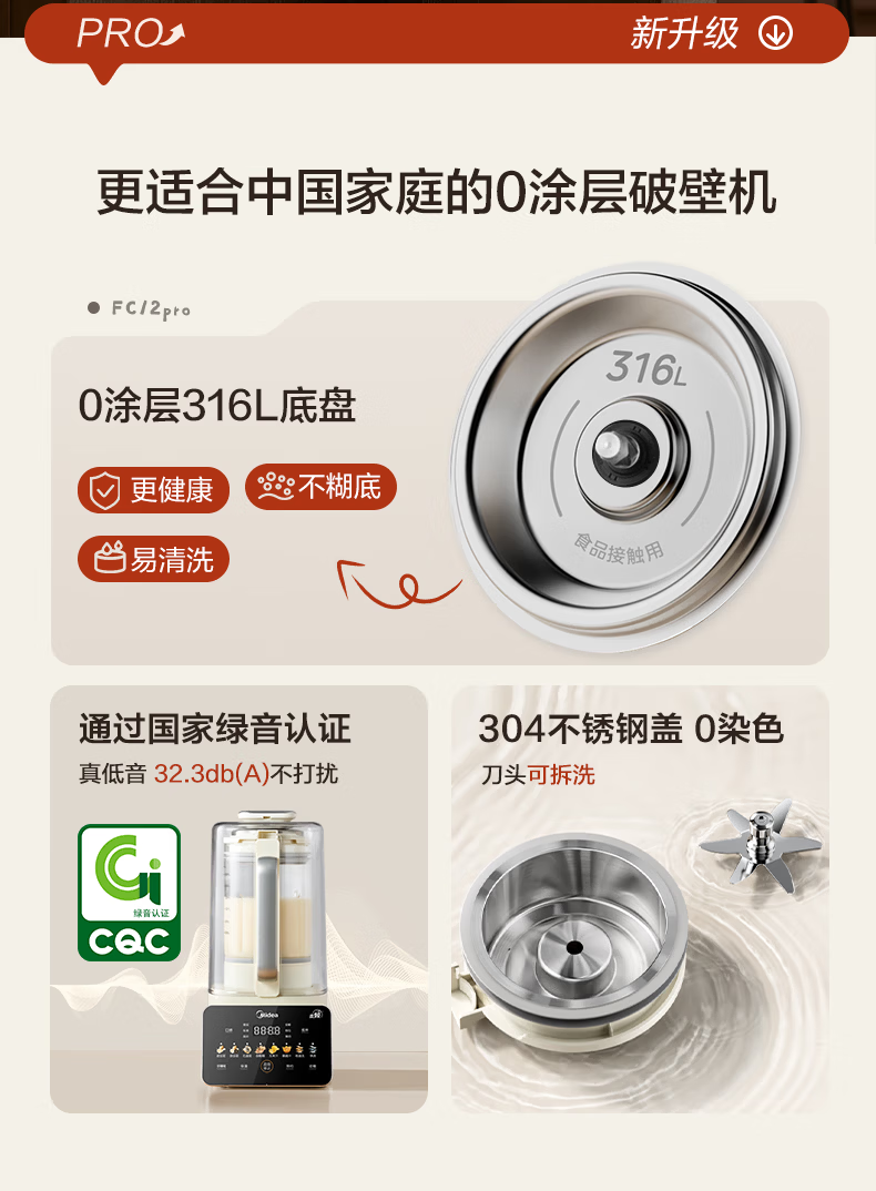 美的(Midea)新款安睡变频0涂层破壁机 1.6L家用轻音全自动多功能料理榨汁辅食豆浆机 3-5人用可拆补贴 FC12Pro