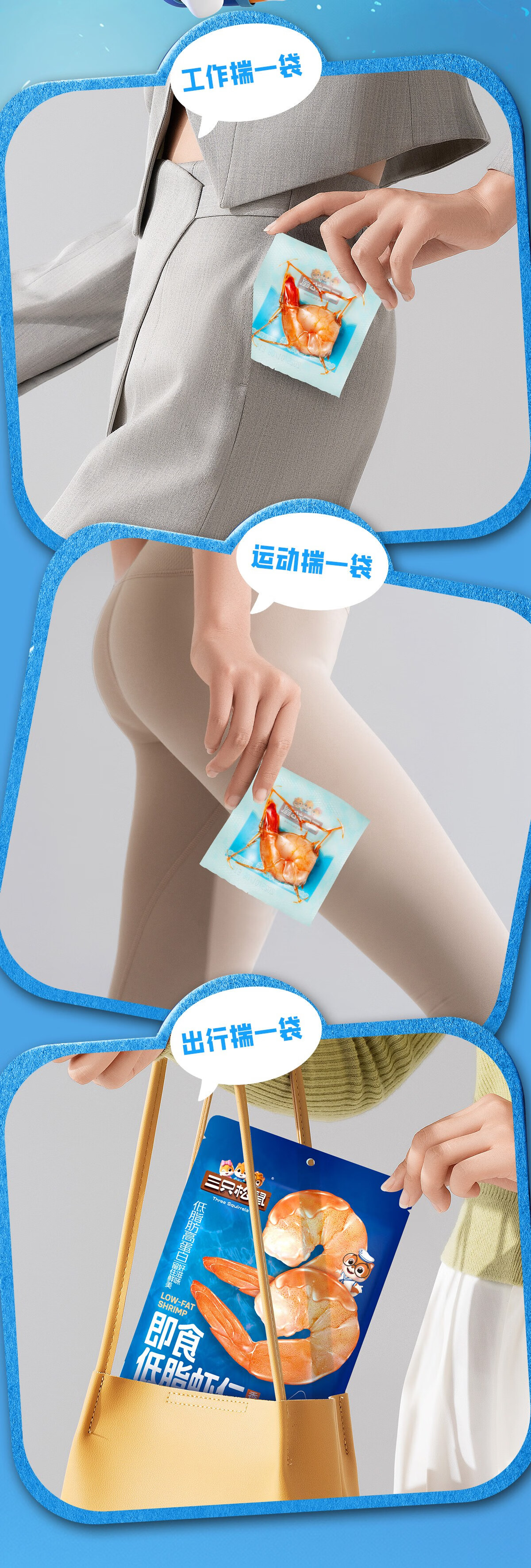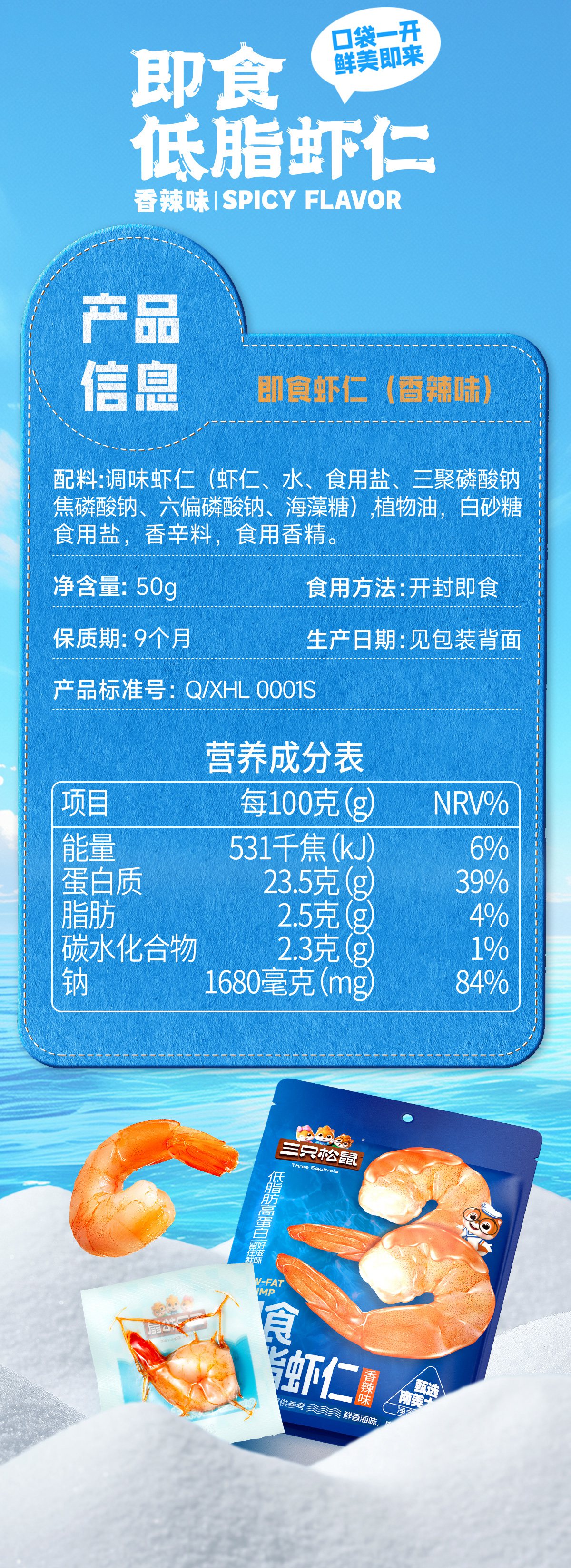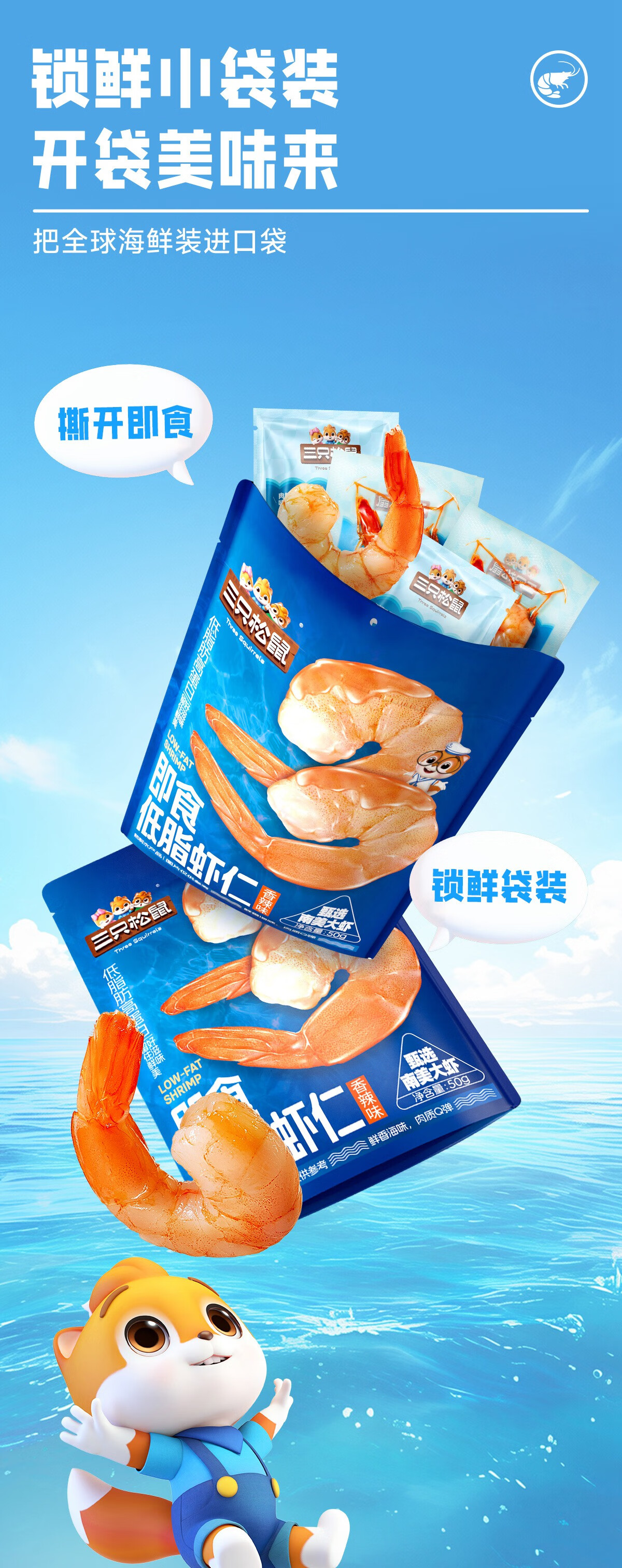 三只松鼠即食低脂虾仁50g 香辣味独立小袋减脂健身高蛋白海鲜零食