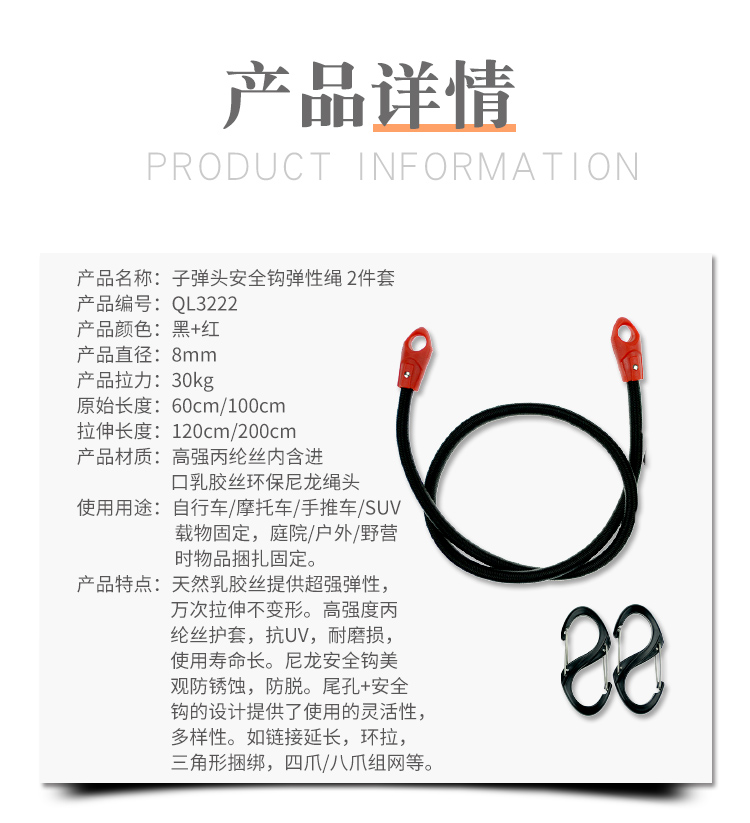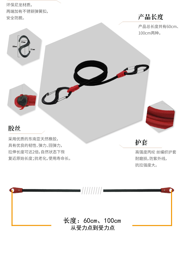 箭鎮(Jz) 子弹头高弹力固定绳自行车摩托车行李捆绑绳绑带户外野营配件 黑色 100CM 2根装