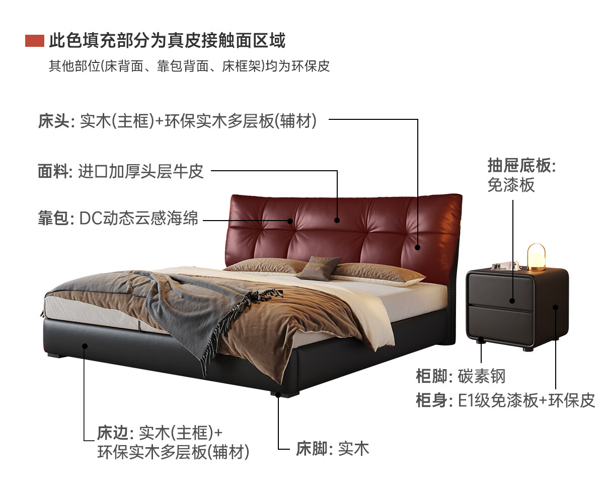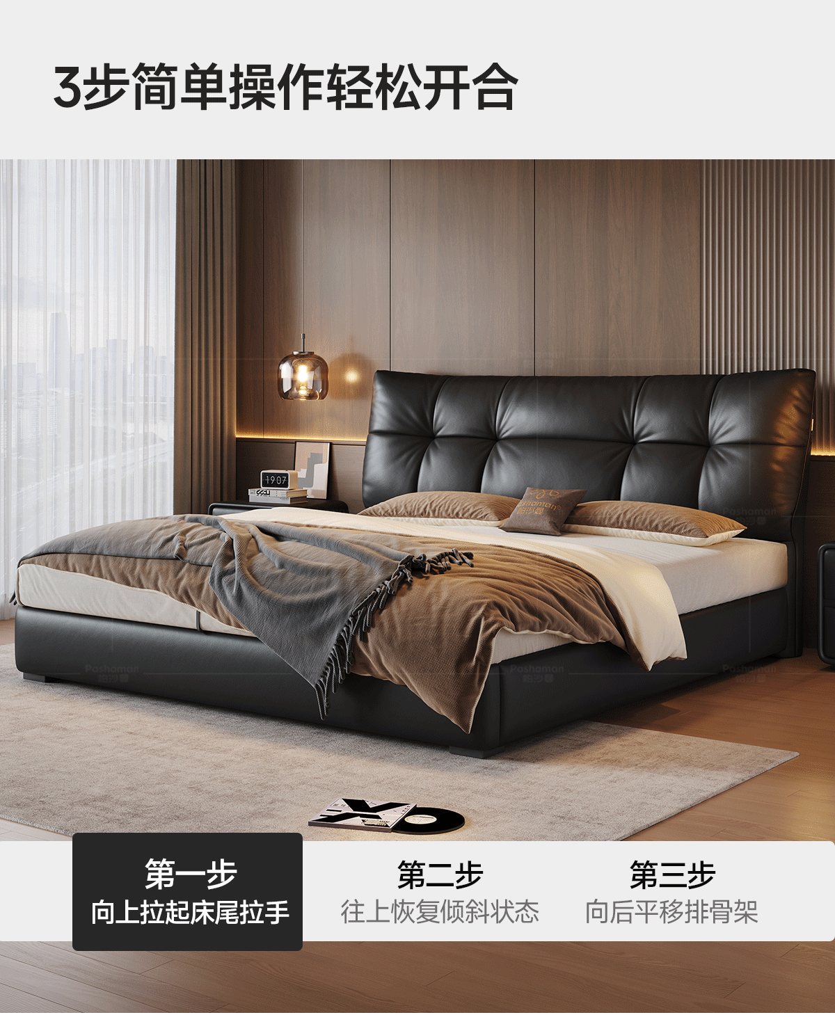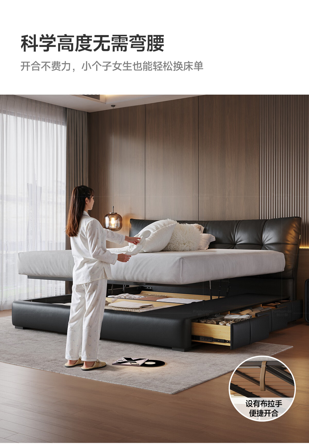 帕沙曼国货补贴真皮床主卧1米8大黑熊床双人轻奢落地软包储物床8424CP-R 【15CM钢木排骨架】单床 框架结构1500mm*2000mm
