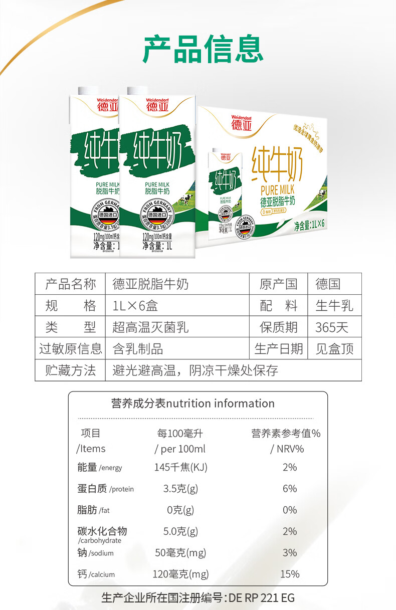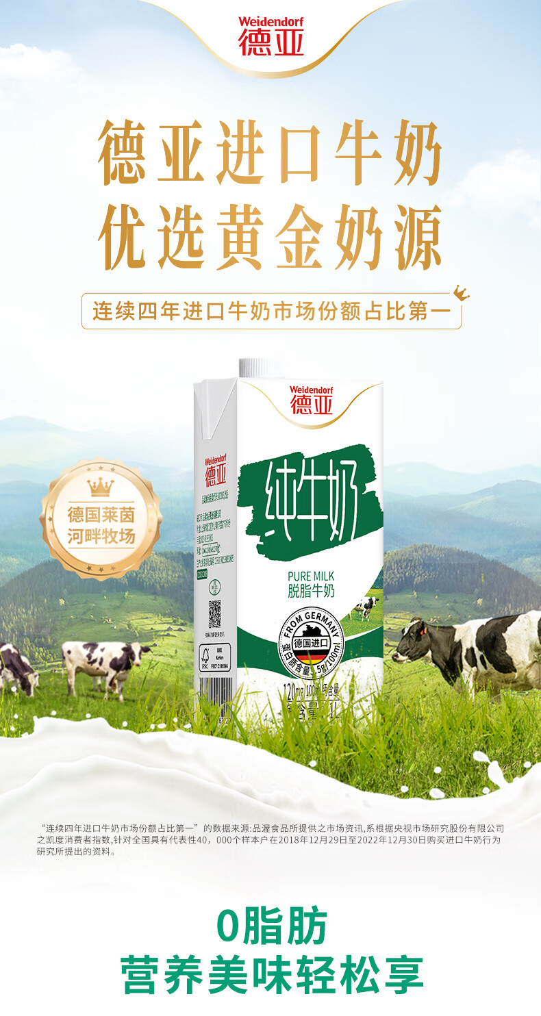 德亚(Weidendorf)德国进口脱脂高钙纯牛奶1L*6盒 0脂肪优质乳蛋白学生营养早餐