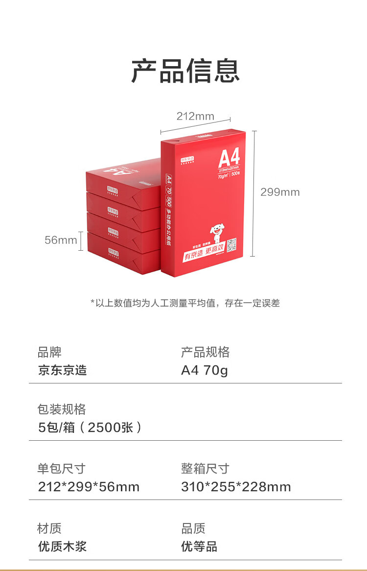京东京造A4打印纸 70g复印纸 釉彩甄享系列 中高档品质 双面草稿纸 500张/包 5包/箱(2500张)