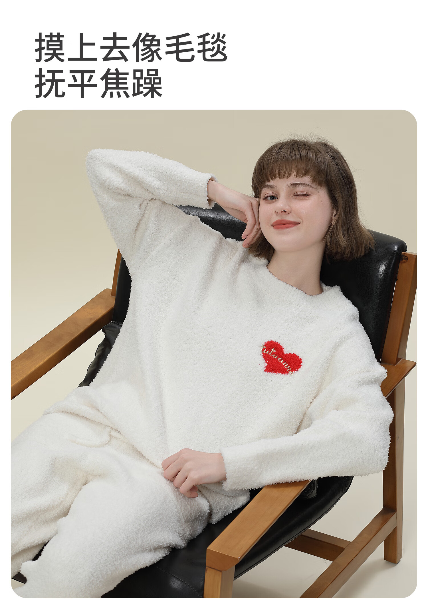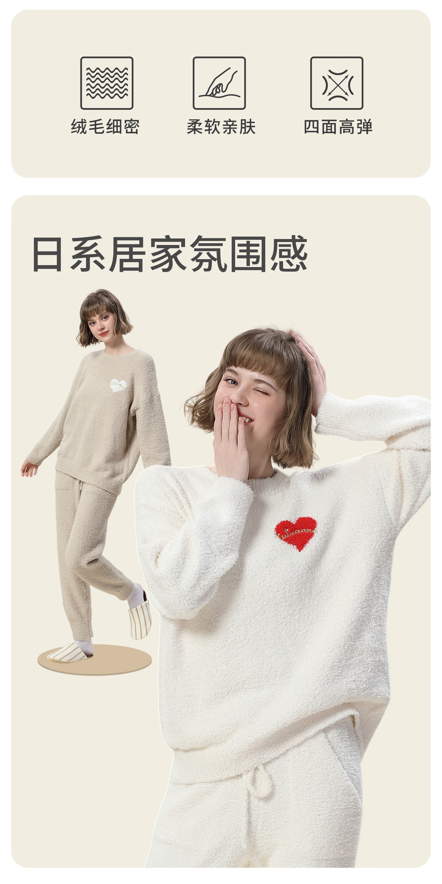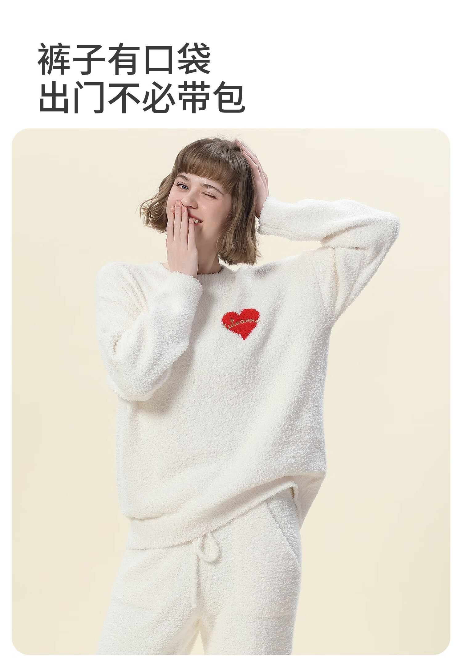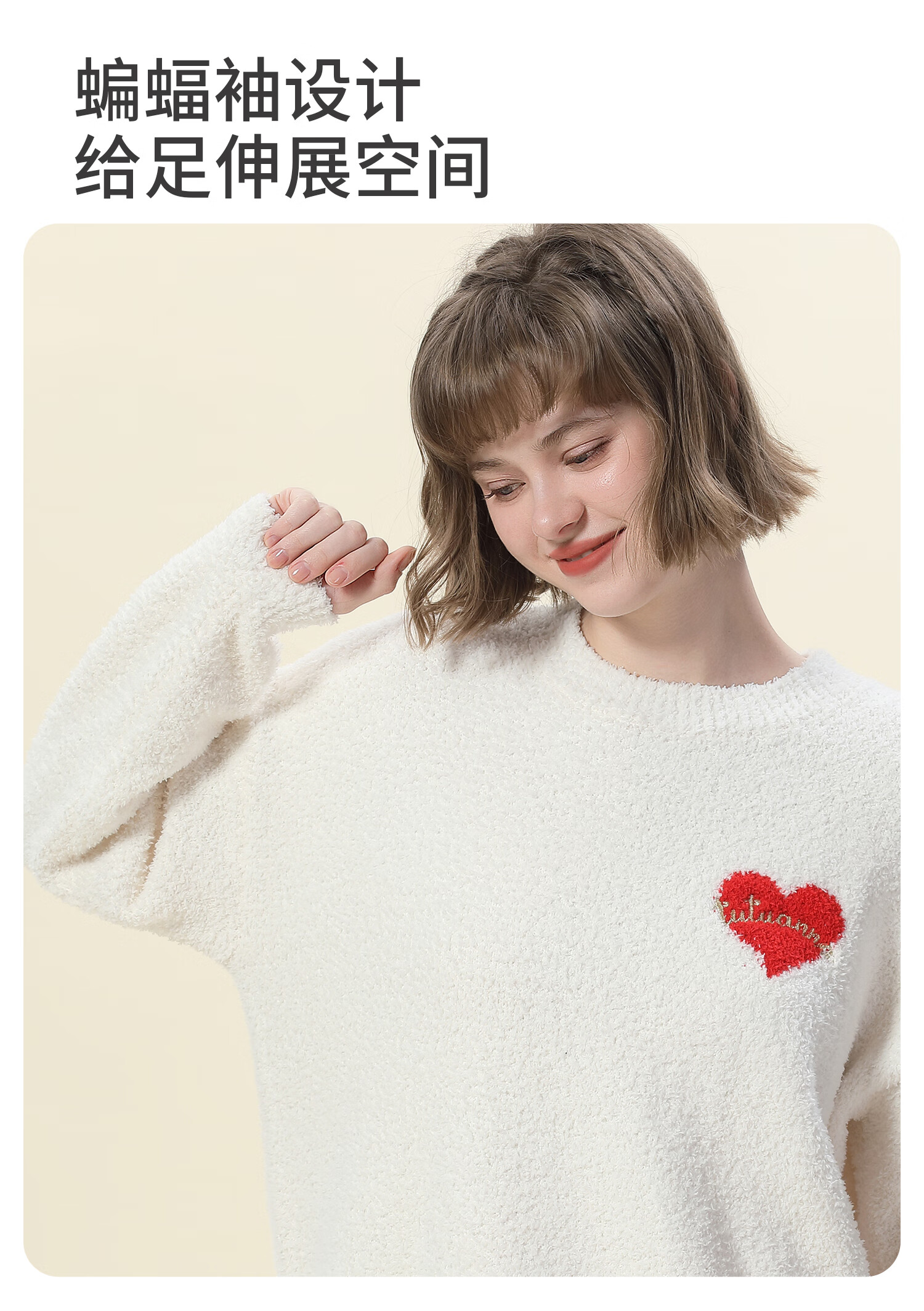 tutuanna半边绒纯色爱心套头长袖长裤套装家居服睡衣毛毛纱秋冬厚款 奶白色 均码 上衣160/84A 裤子160/70A