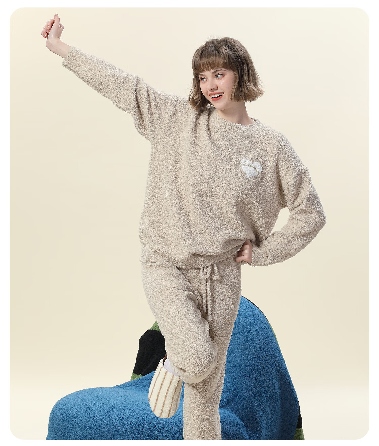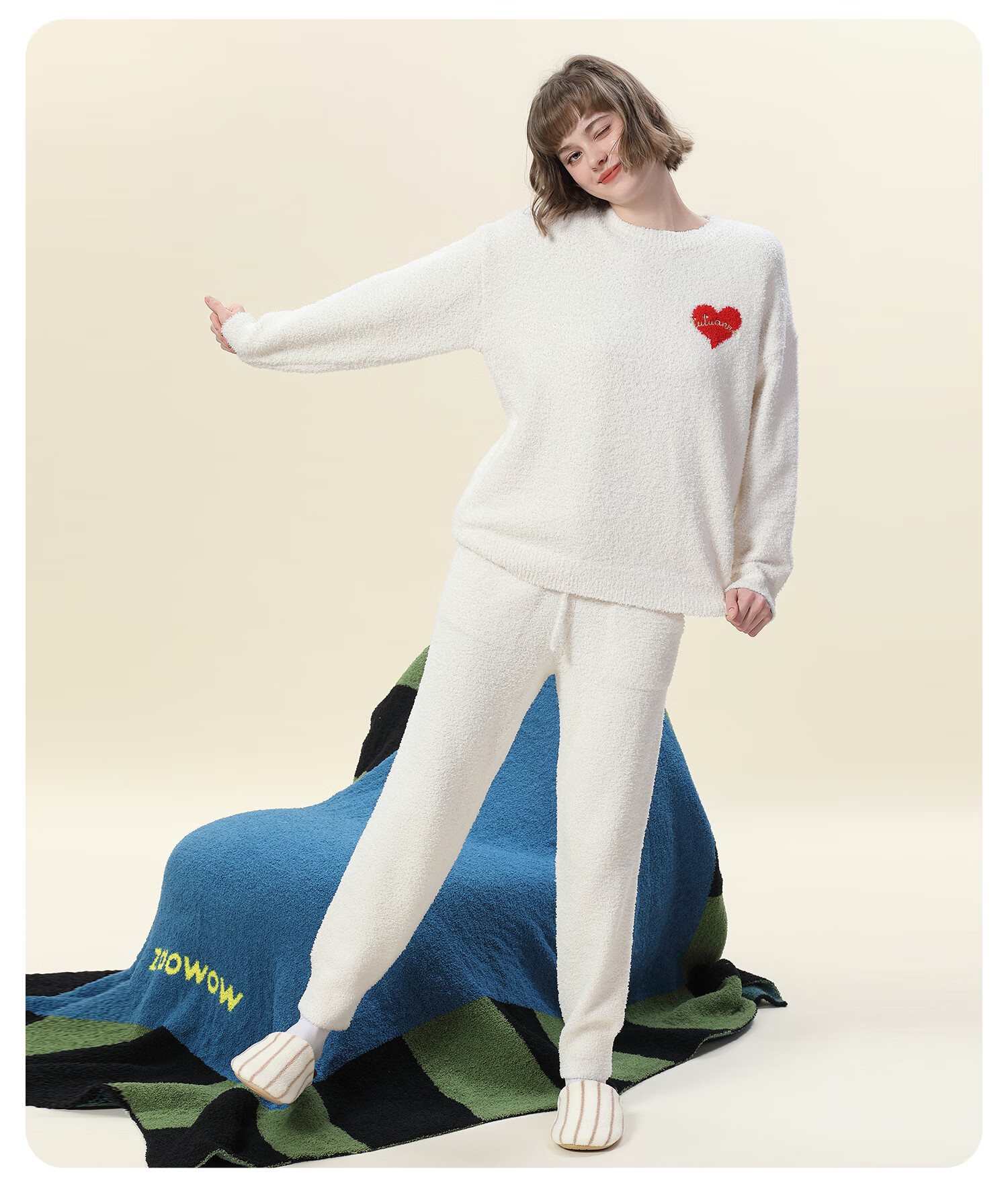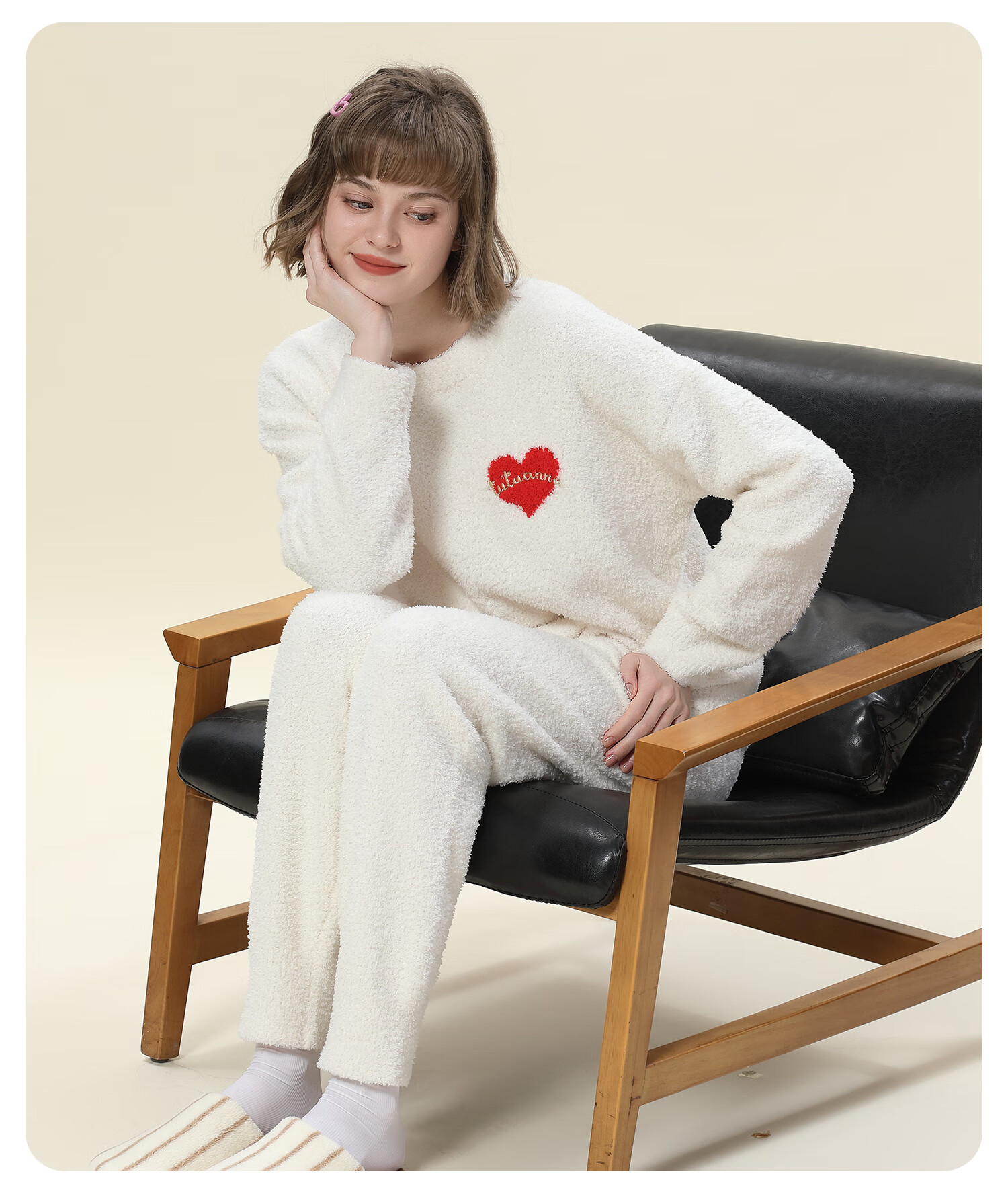 tutuanna半边绒纯色爱心套头长袖长裤套装家居服睡衣毛毛纱秋冬厚款 奶白色 均码 上衣160/84A 裤子160/70A
