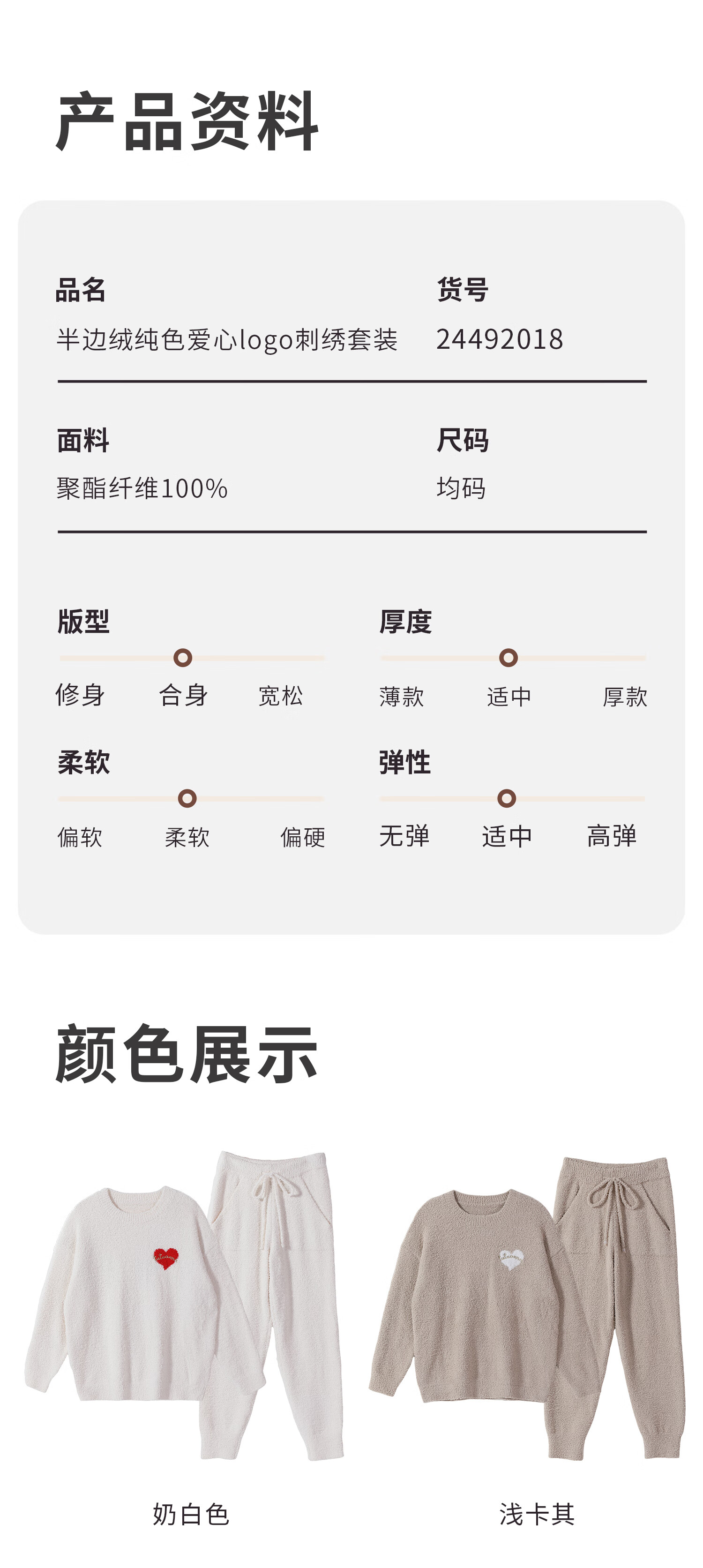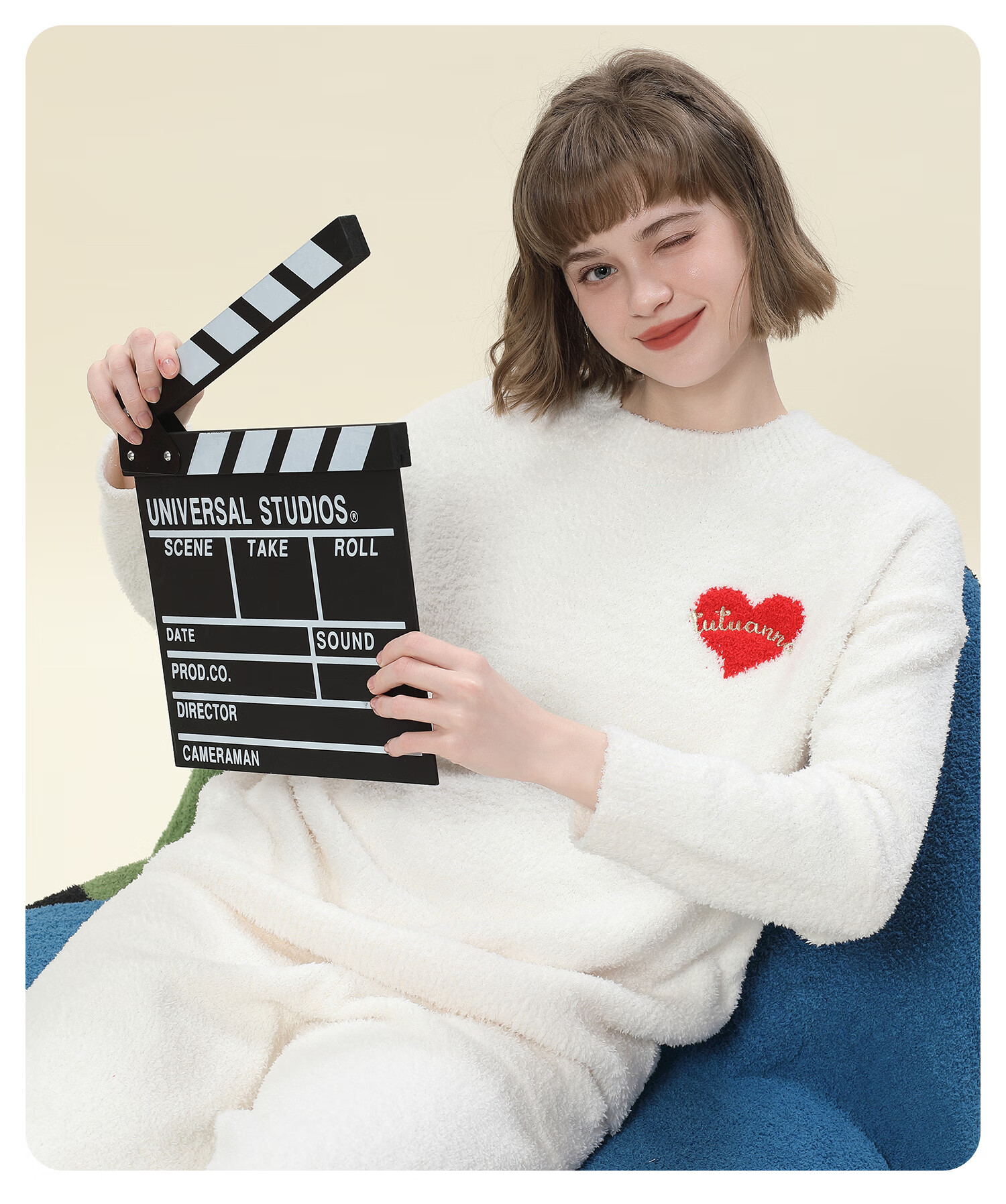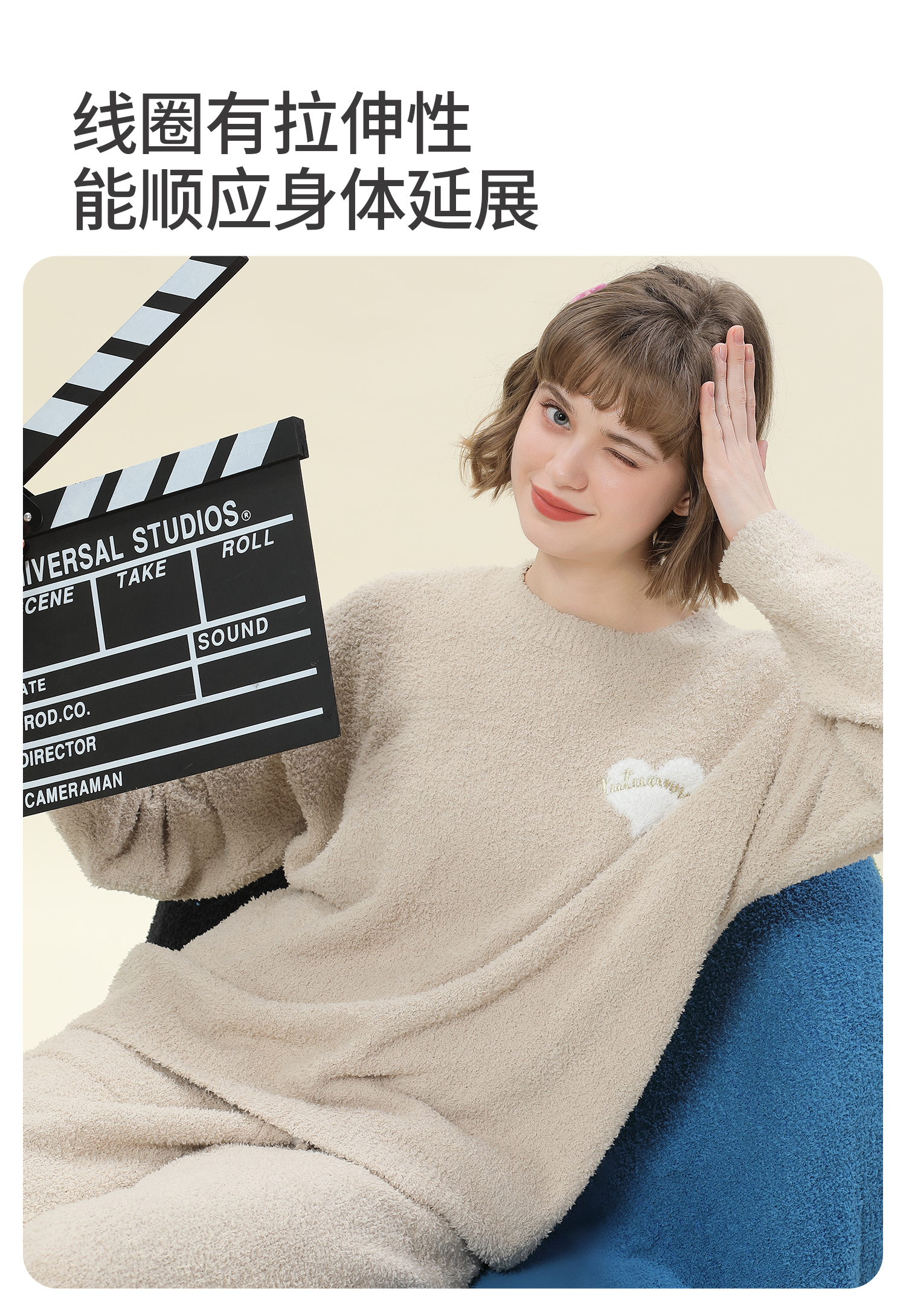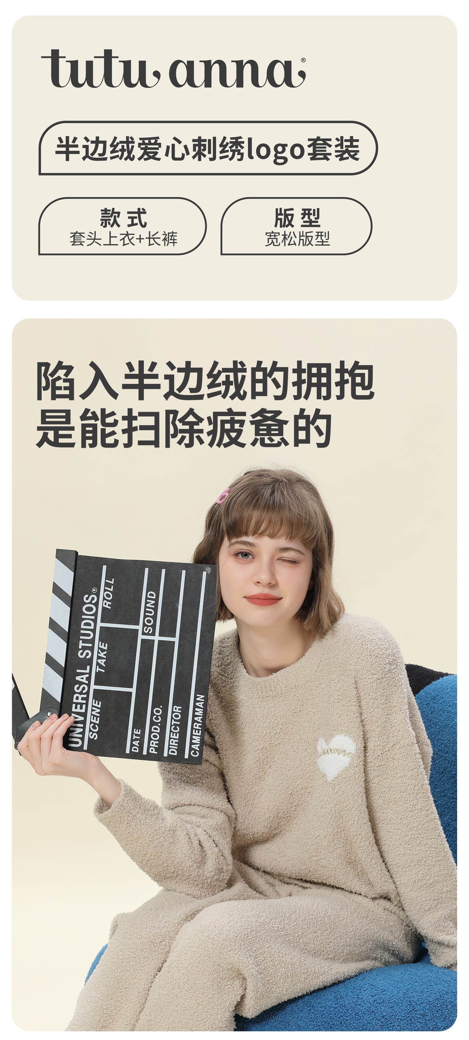 tutuanna半边绒纯色爱心套头长袖长裤套装家居服睡衣毛毛纱秋冬厚款 奶白色 均码 上衣160/84A 裤子160/70A
