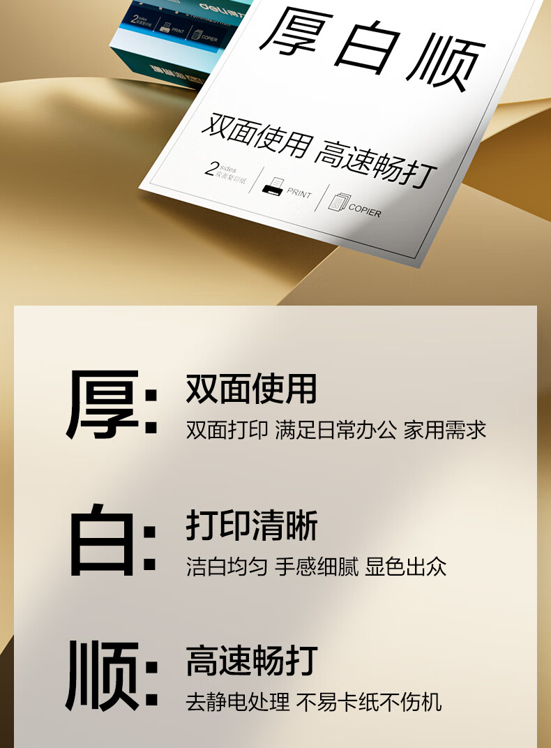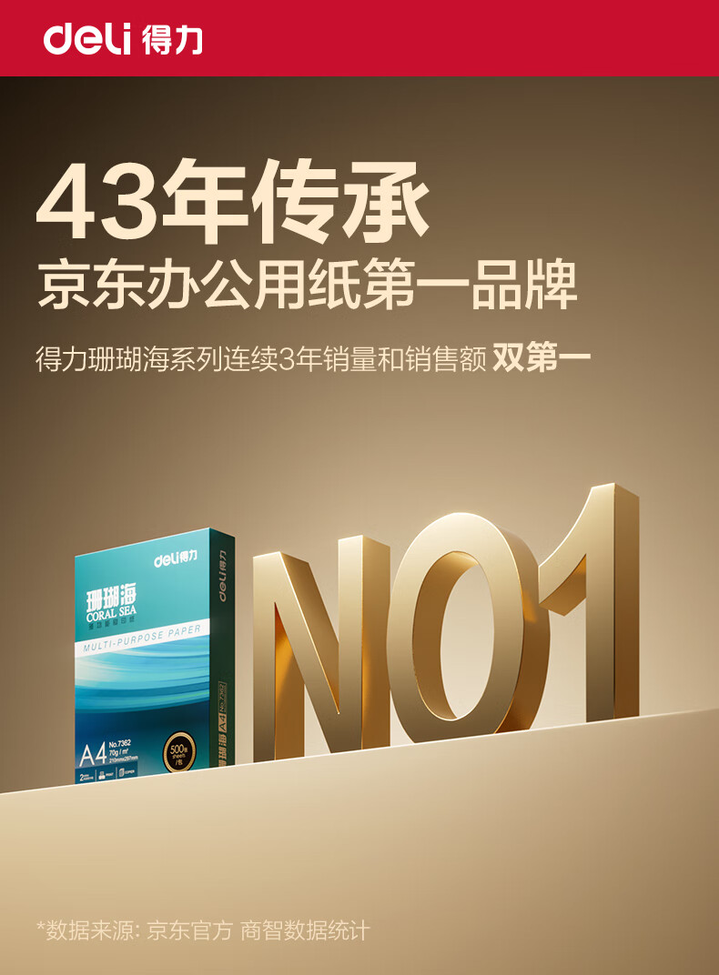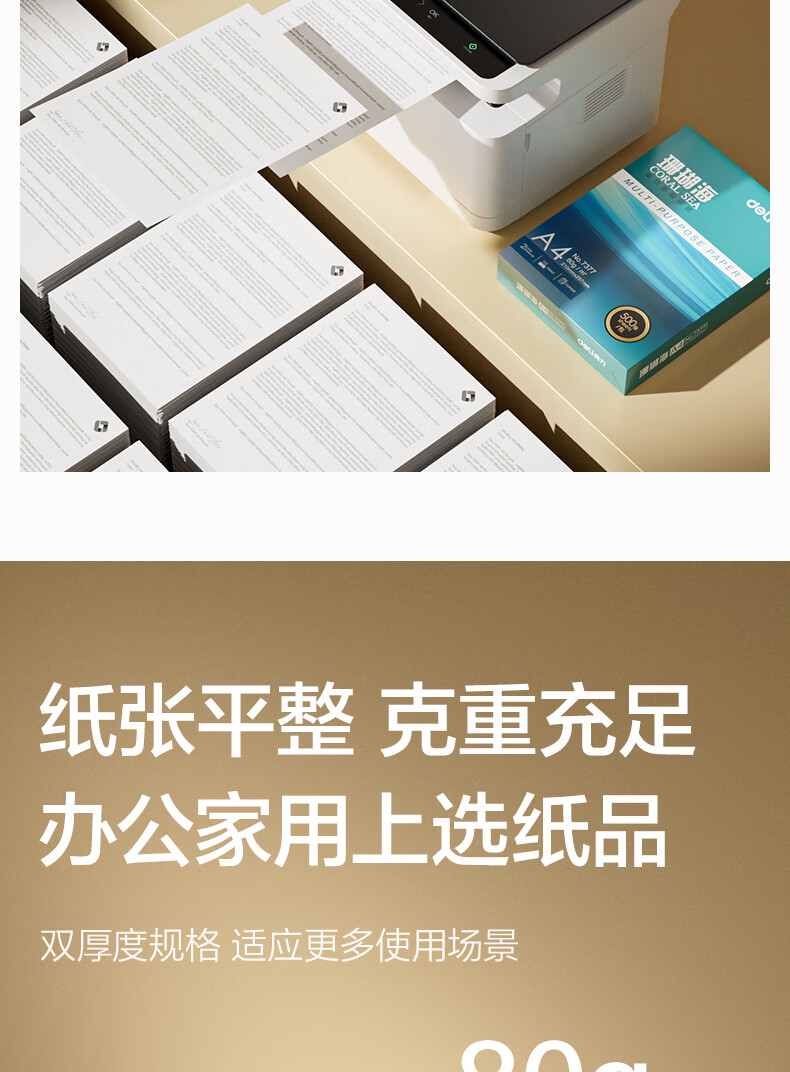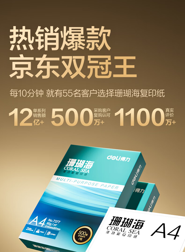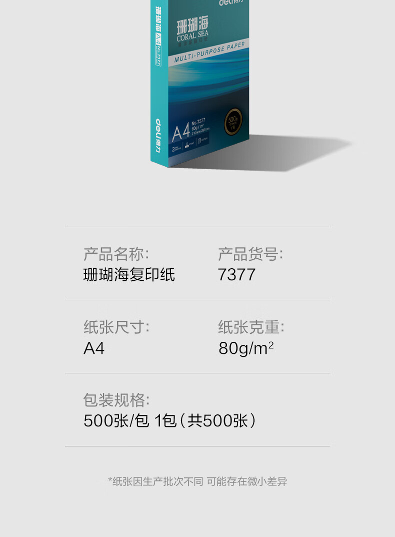 得力(deli)珊瑚海A4打印纸80g500张 单包复印纸 双面加厚草稿纸 打印书写绘画 7377【销冠系列】