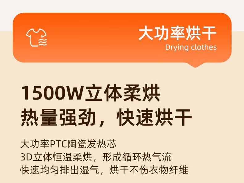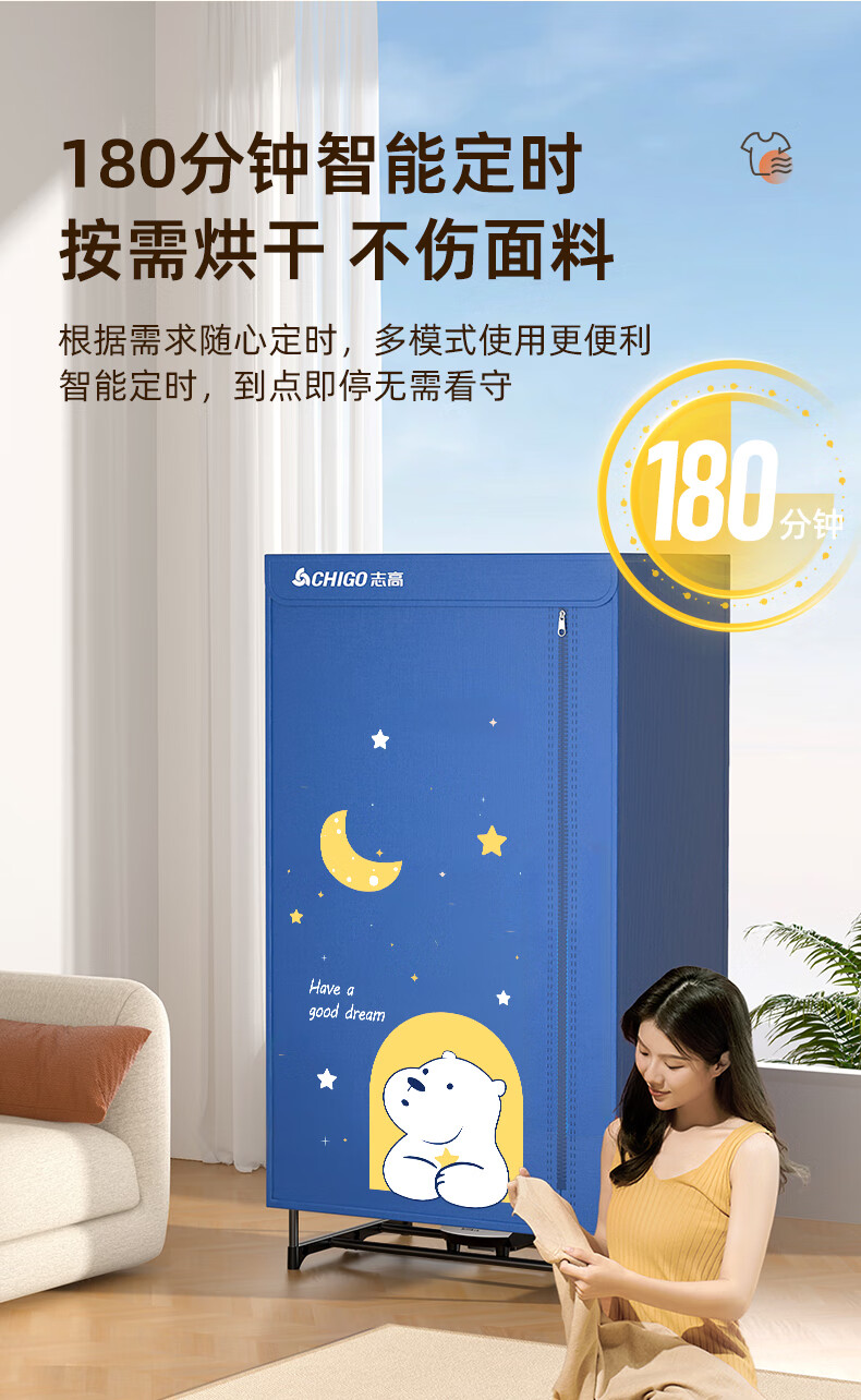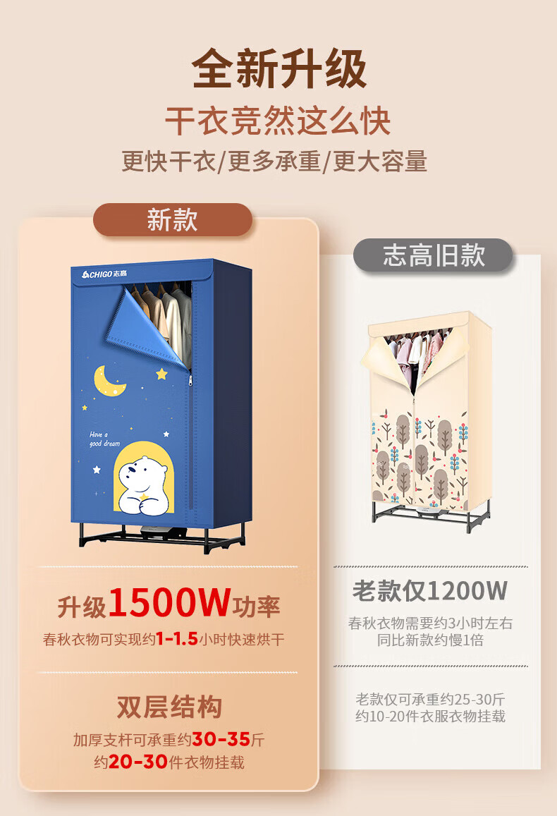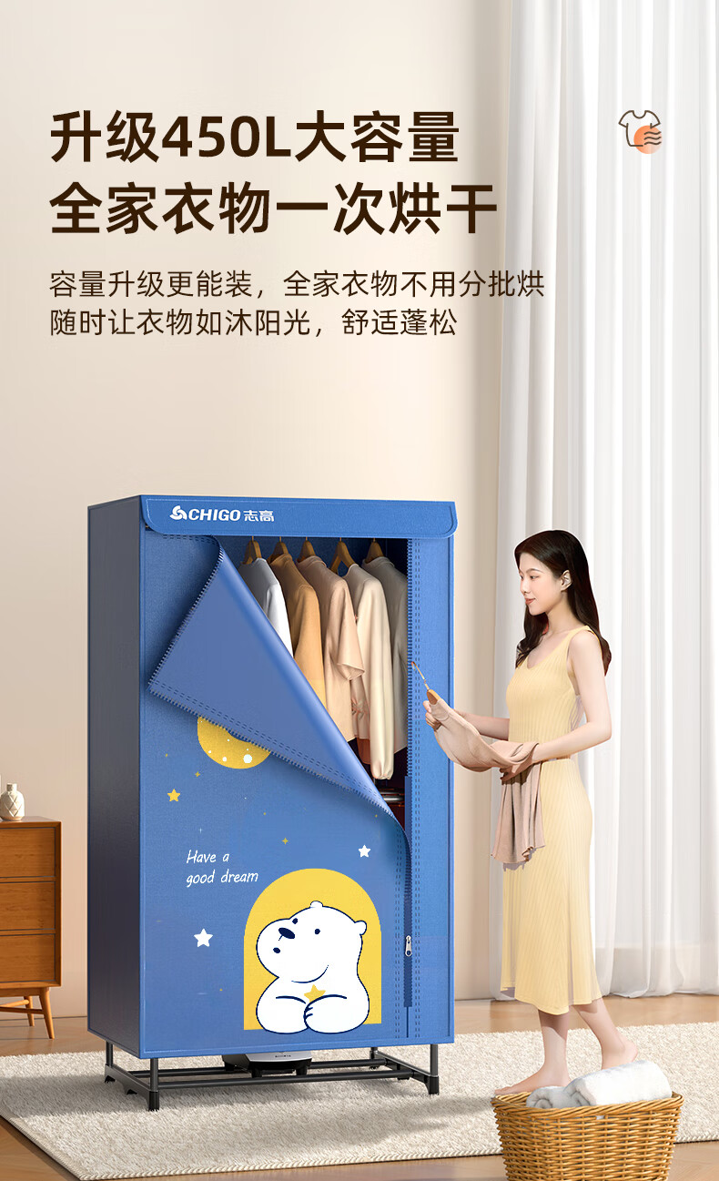 志高(CHIGO)【1500W快烘+450L】干衣机家用烘干机烘衣机烘衣服神器婴儿衣物暖风风干机大容量定时烘干衣柜JT16