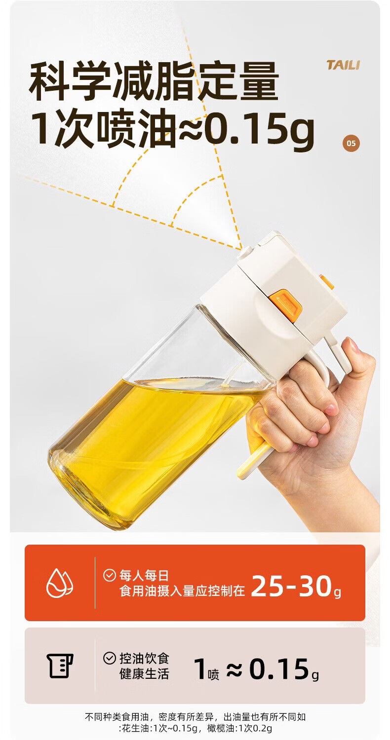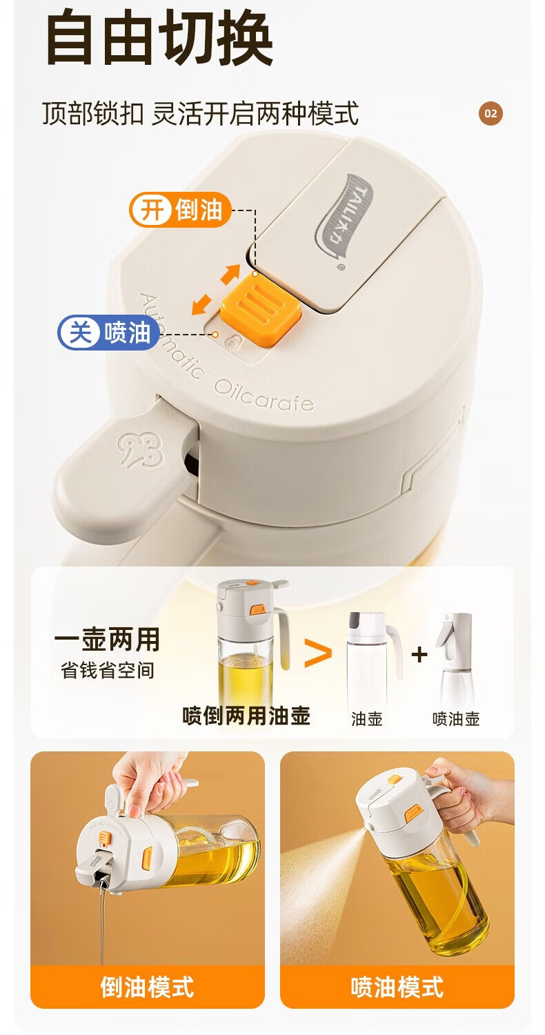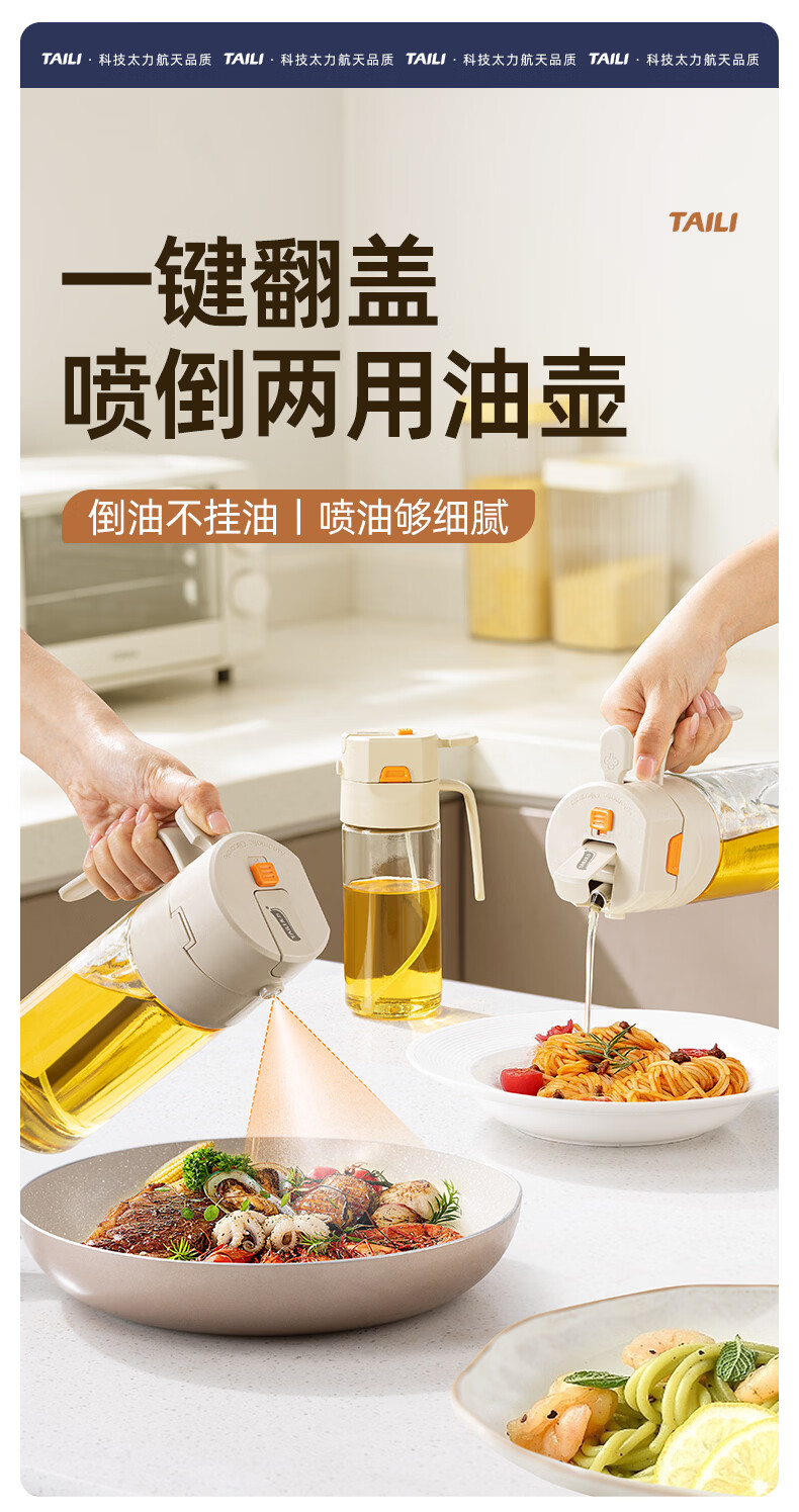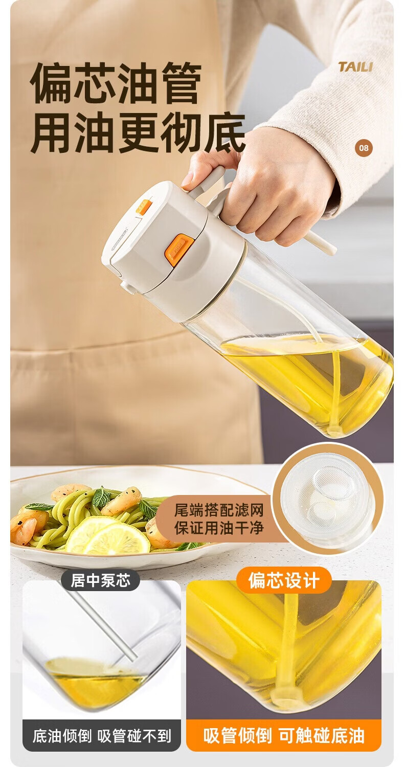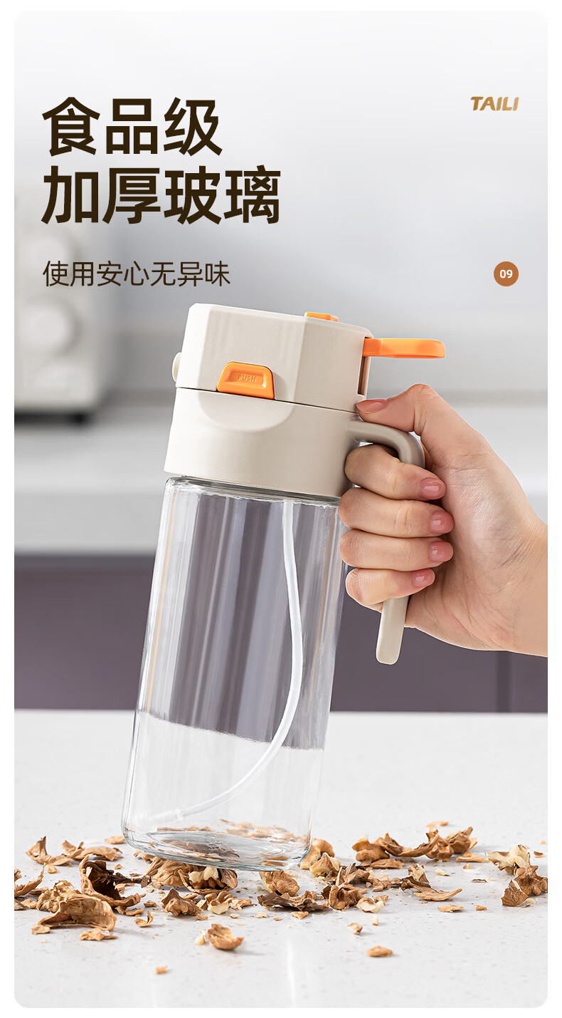 太力油壶自动开合喷倒两用玻璃油瓶酱油醋调料瓶油壶不挂油厨房 【喷洒+倾倒出油】0.6L两用油壶