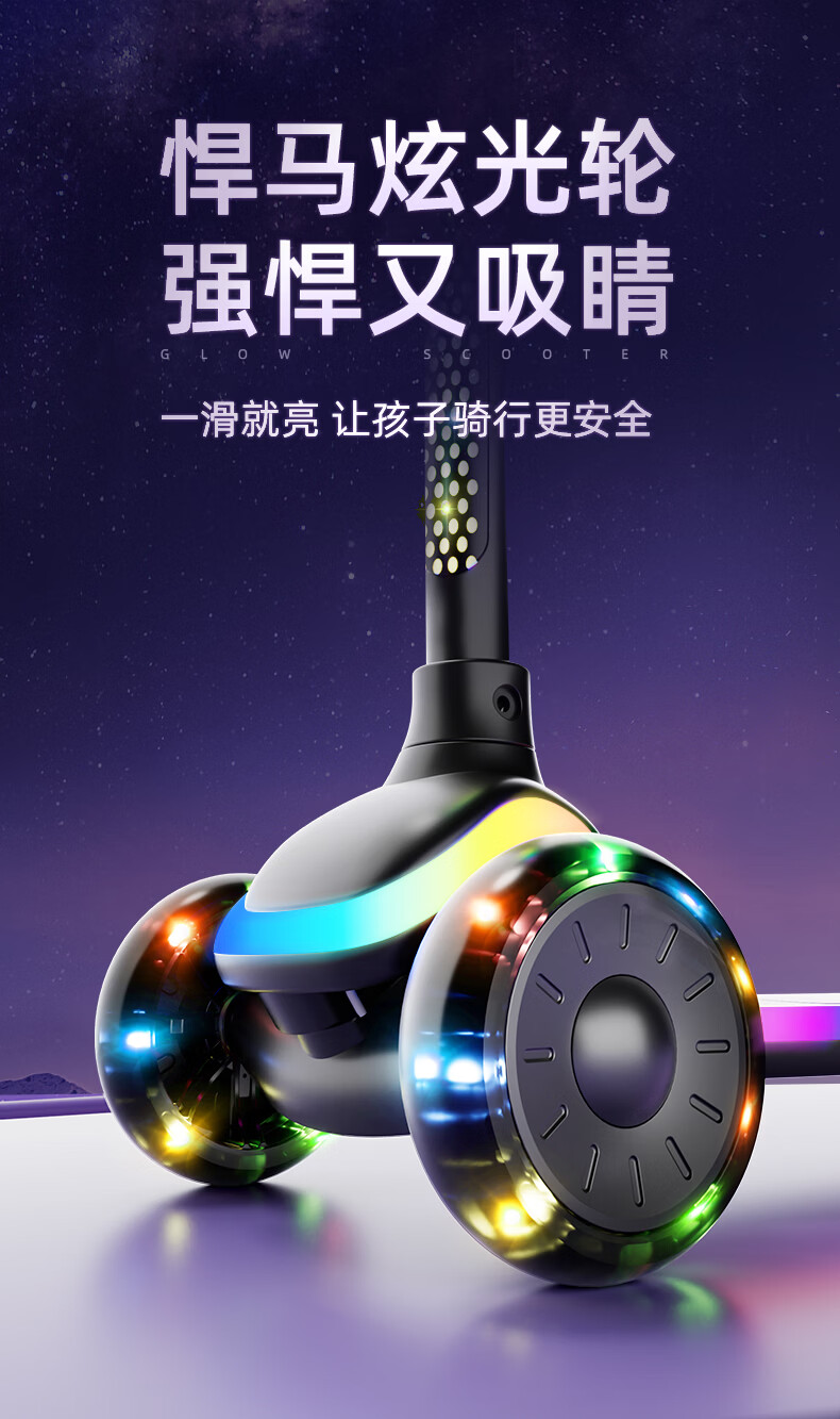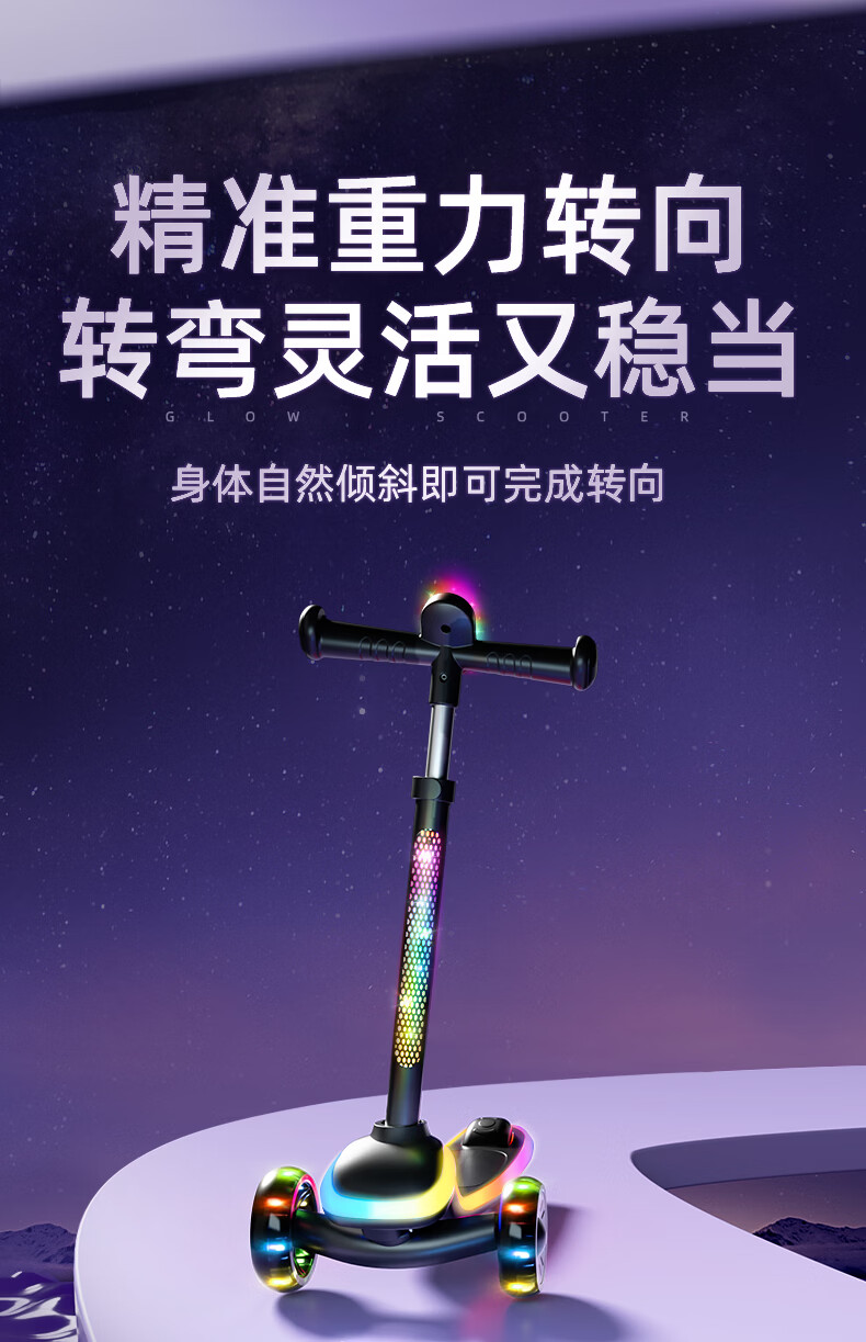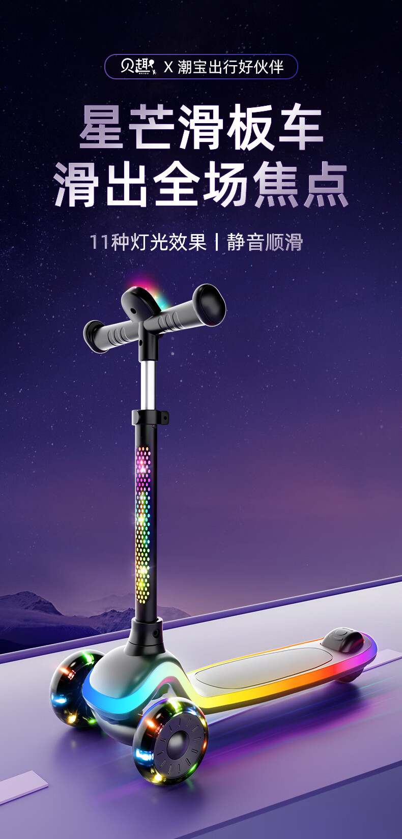 贝趣儿童滑板车1-3-6-12岁宝宝防侧翻滑滑车2岁小孩幼儿玩具踏板车 星芒黑【11种灯光+3档高度调节】