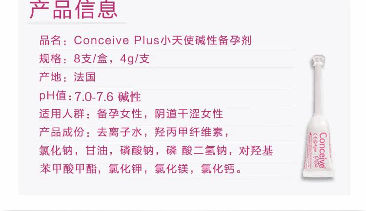 法国小天使碱性备孕润滑剂Conceive Plus夫妻碱性润滑剂 法国小天使备孕女款润滑剂8小只 1盒