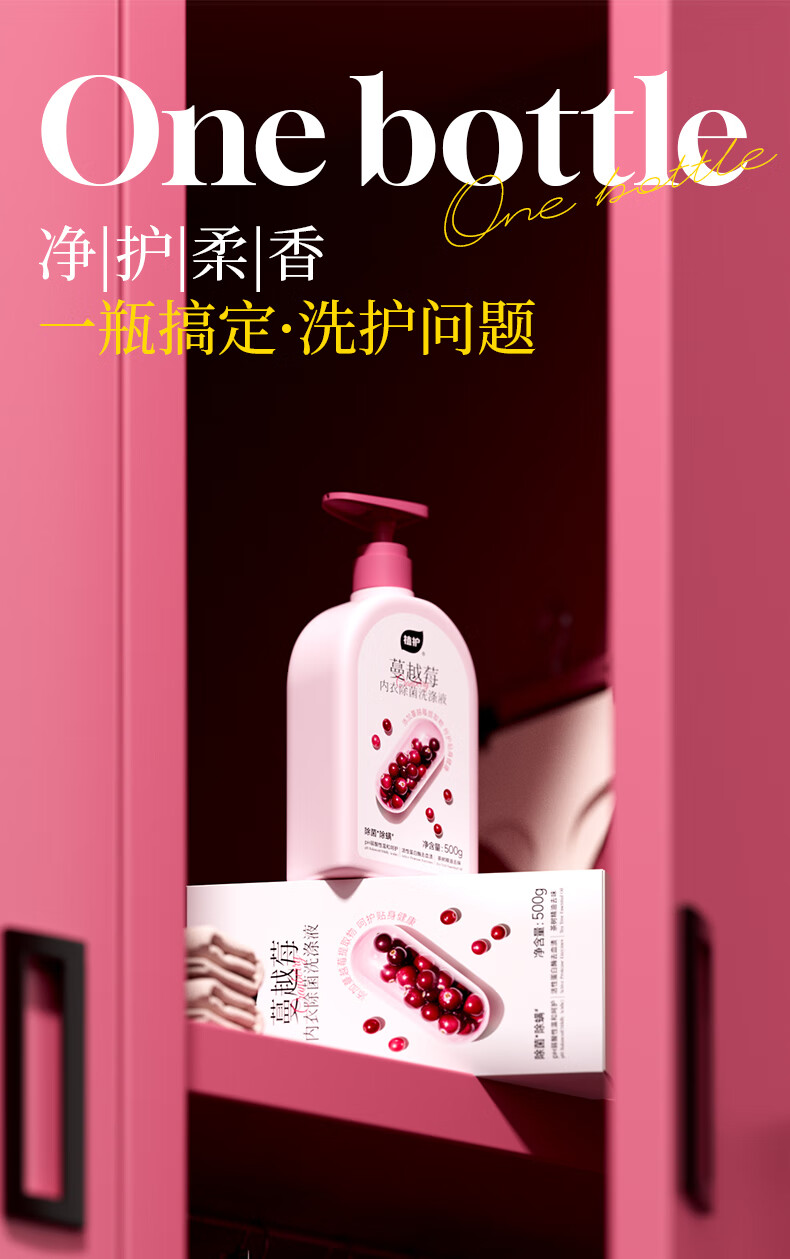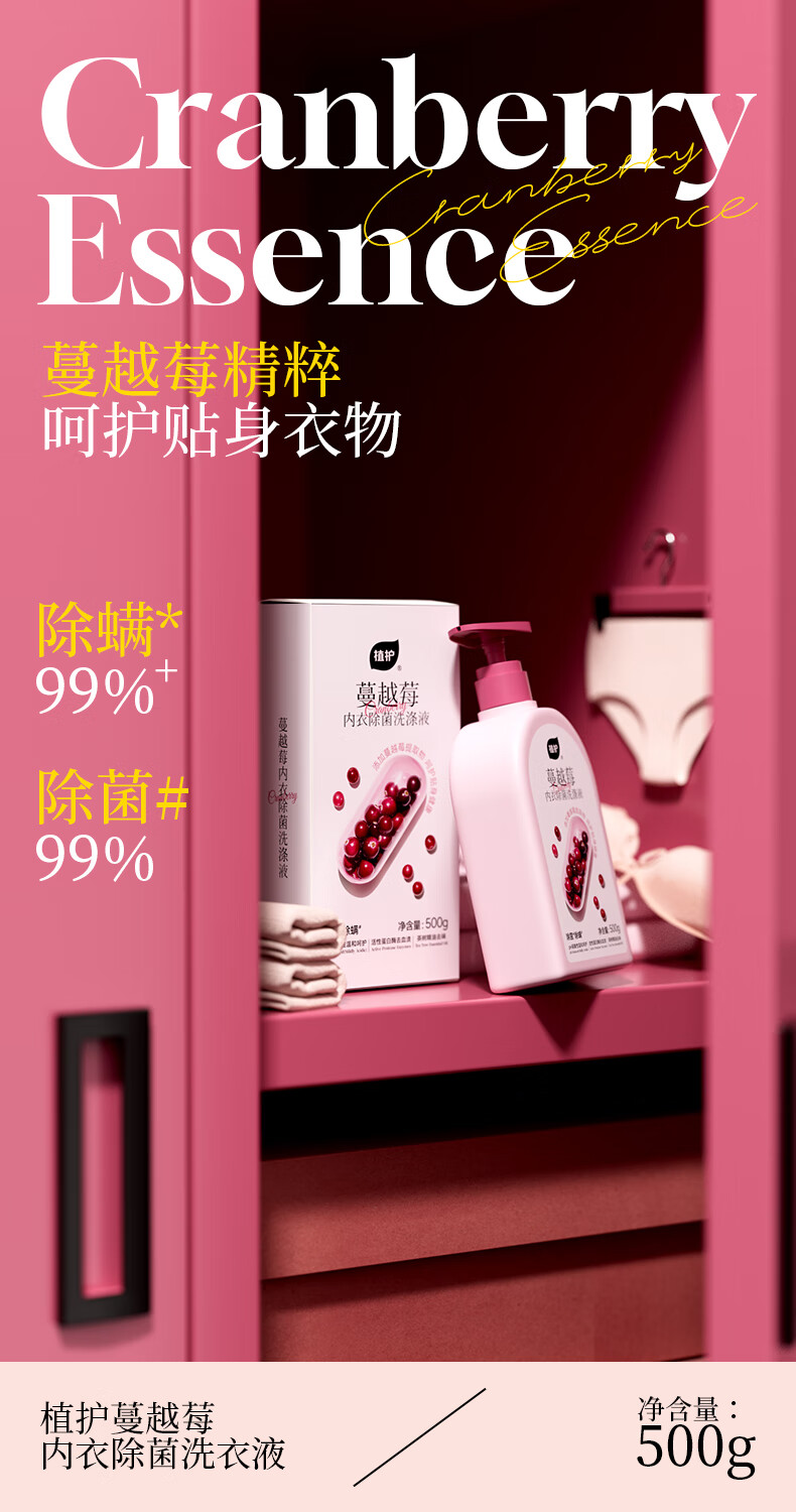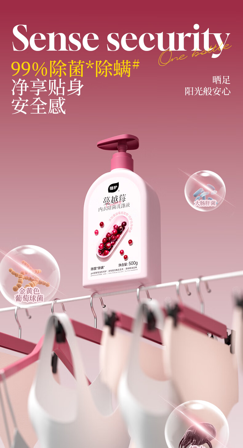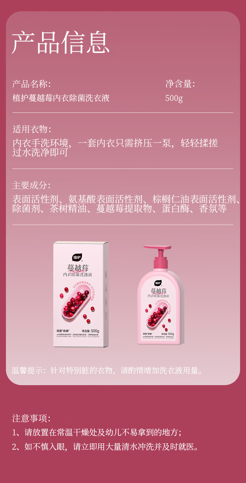 植护蔓越莓内衣内裤洗衣液去黄去血渍清洗液除菌除螨洗涤液 【蔓越莓精华】500g*1瓶