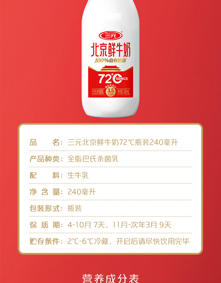三元北京鲜牛奶 240ml*6瓶 低温奶 【丁禹兮同款】