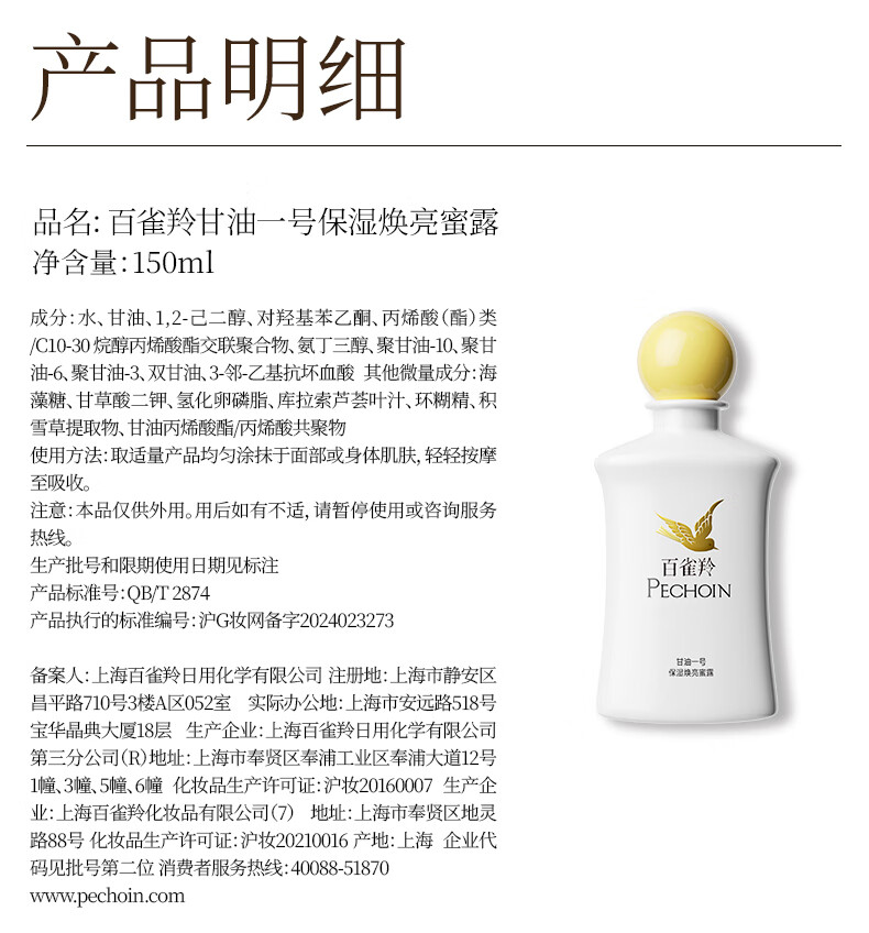 百雀羚甘油一号蜜露瓶装版150ml甘油脸部护肤补水保湿滋润新年礼物