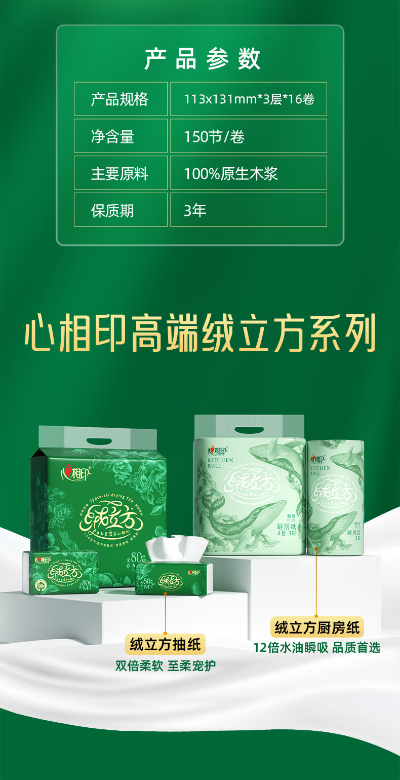 心相印卷纸 绒立方系列 有芯3层133g*16卷柔厚升级可冲散 整箱150节16卷