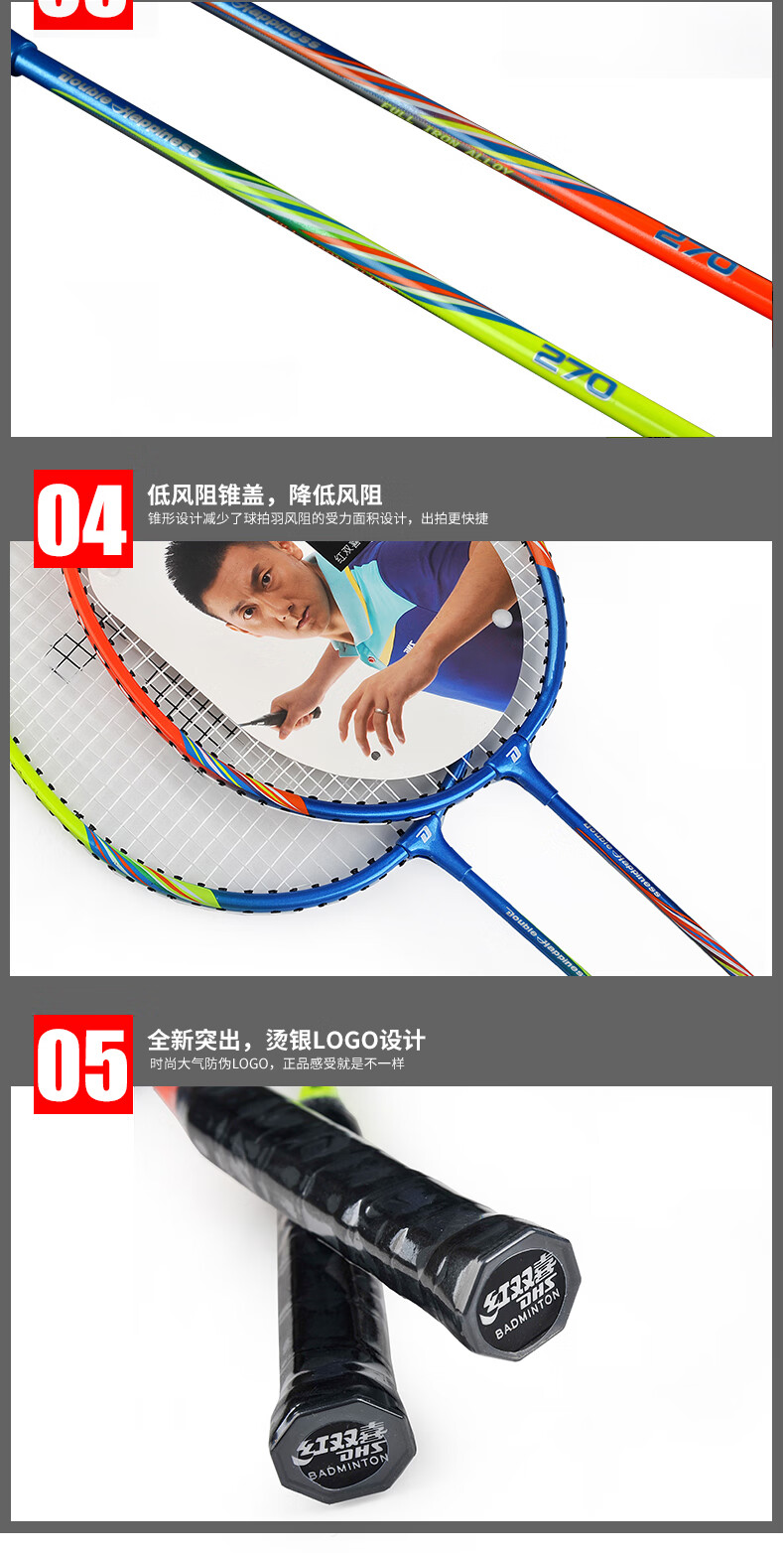 红双喜(DHS)羽毛球拍双拍成人健身2只单支拍轻便初学拍业余初级学生儿童套装 防断线P219红2只+大礼包