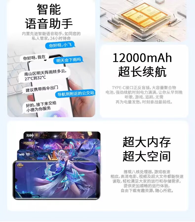魅果骑手外卖员电霸12000毫安大容量电池全网通5G超长待机OTG反向充电百元学生电竞游戏全新机 蓝色 16GB+1TB