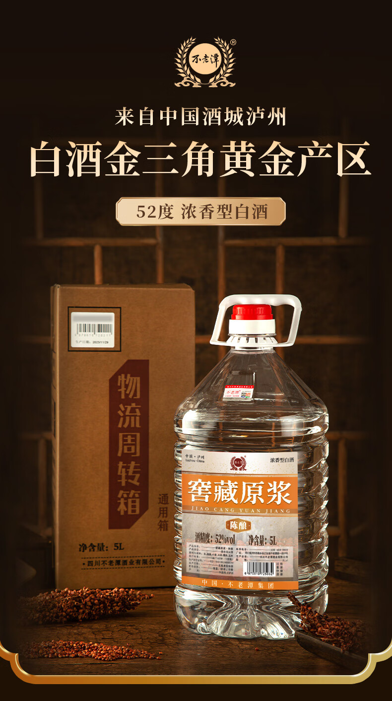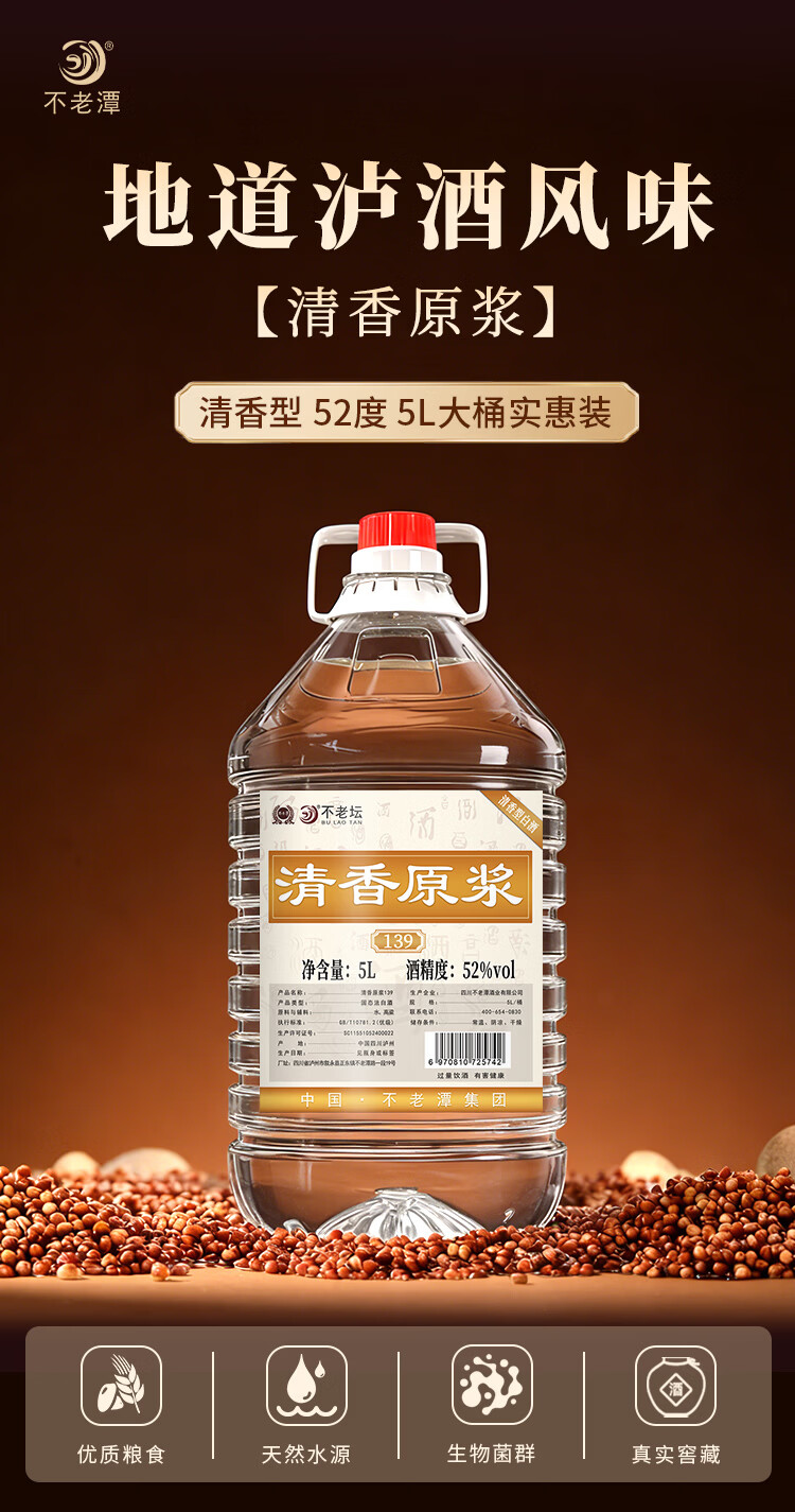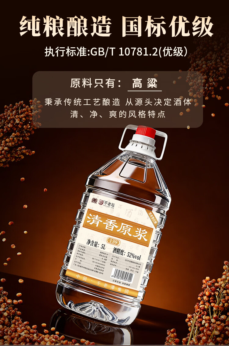 不老潭清香型白酒52度高粱酒纯粮食高度白酒光瓶口粮酒自饮小曲清香桶装 52度 5L 1桶 粮食酒139【清香型】纯高粱酒 新老包装随机发