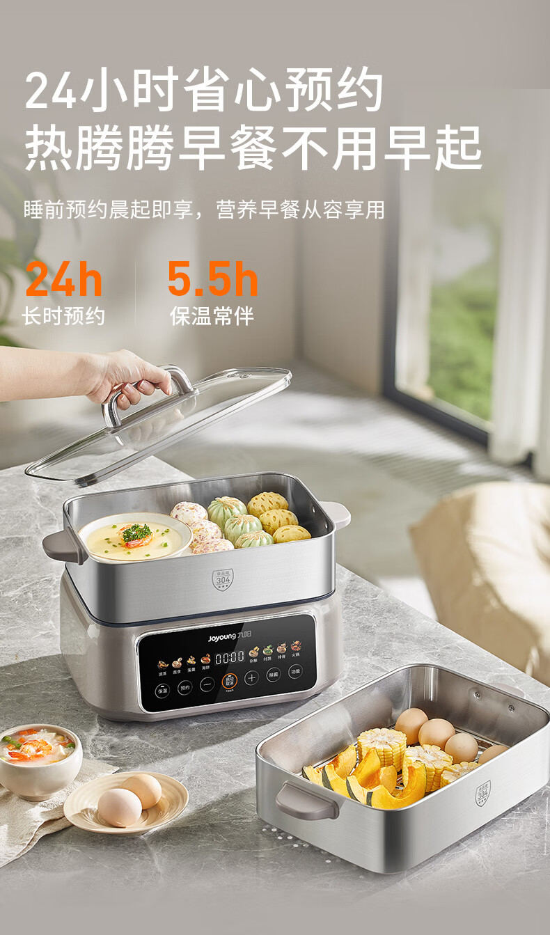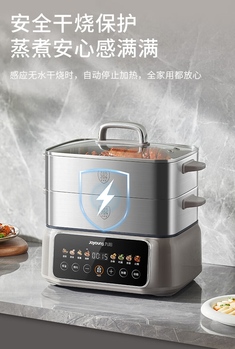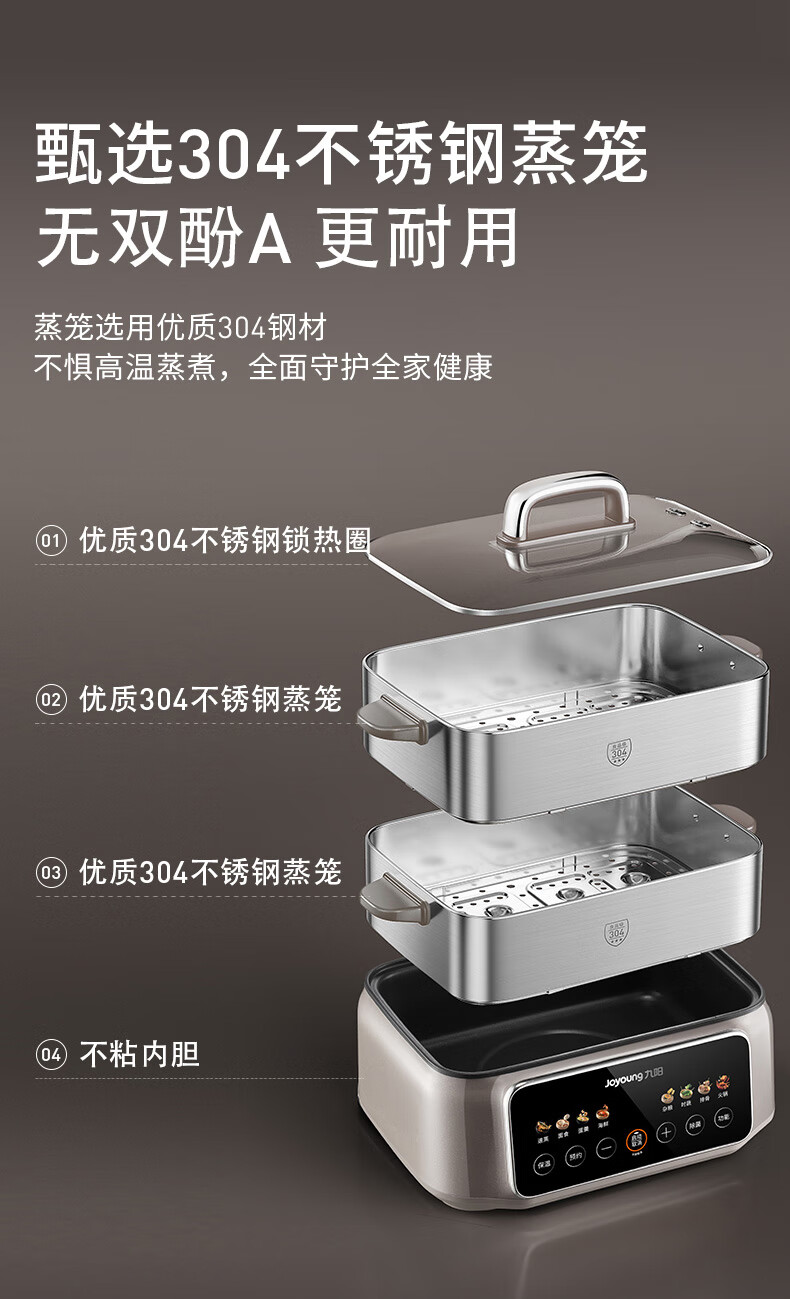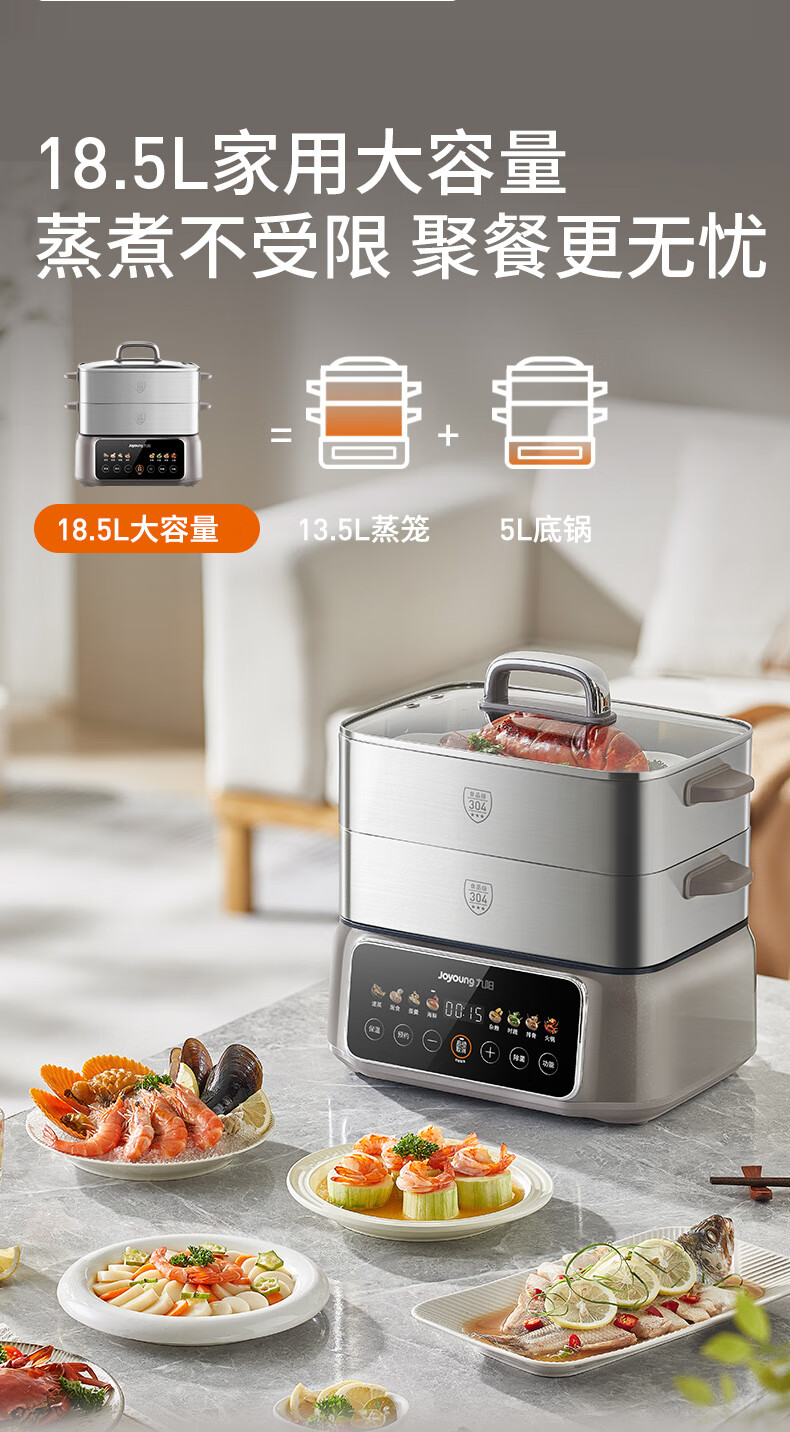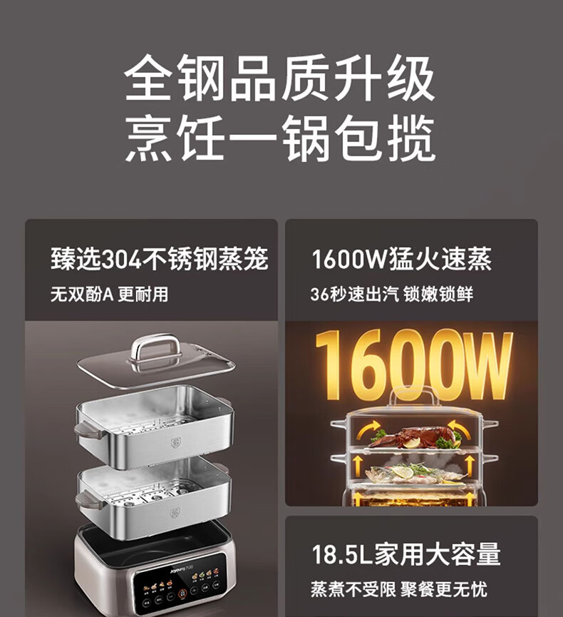 九阳(Joyoung)电蒸锅炖蒸煮一体3层18.5L大容量304不锈钢蒸屉电煮锅电火锅多功能3-6人家用可预约大功率电热锅 18.5L 【全钢蒸笼+36S出蒸汽】2层蒸笼+煮锅