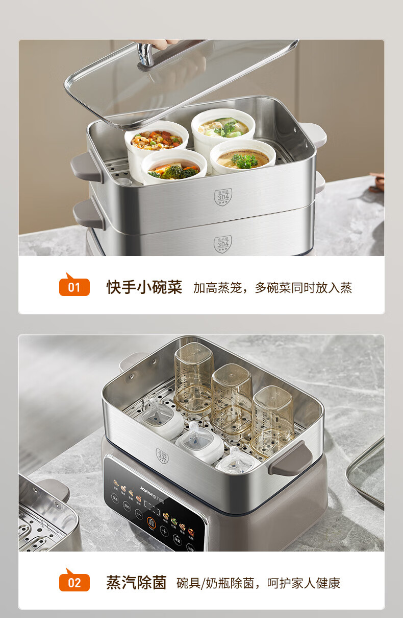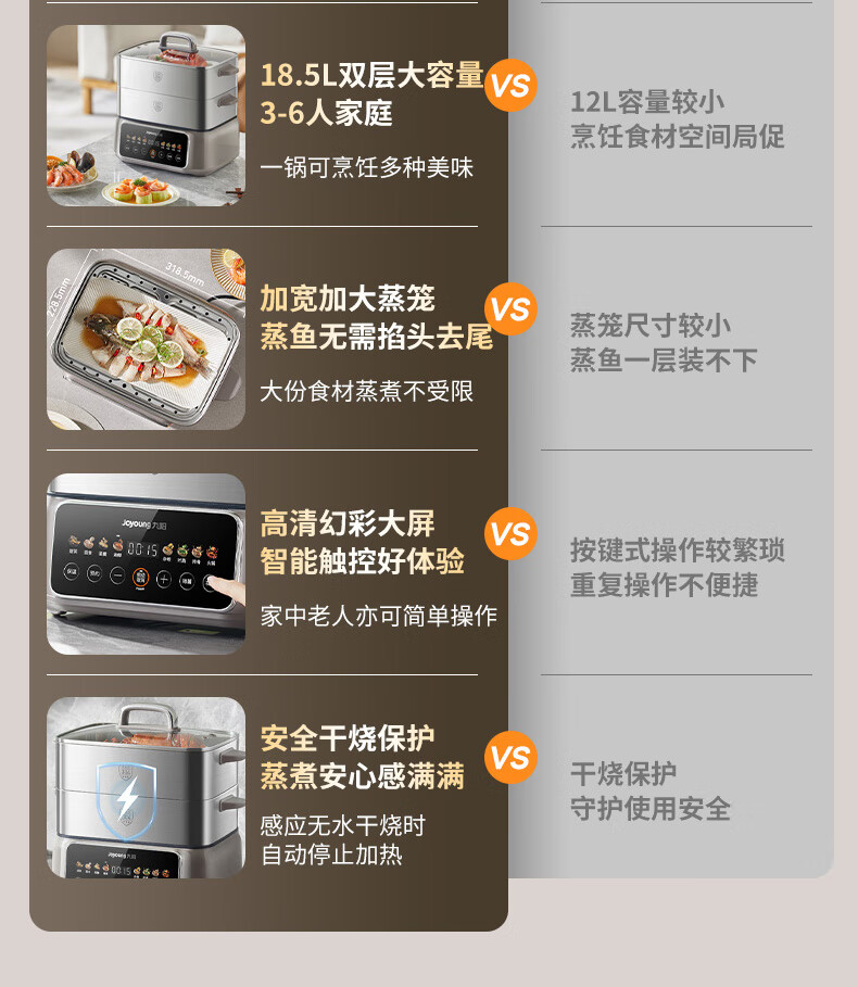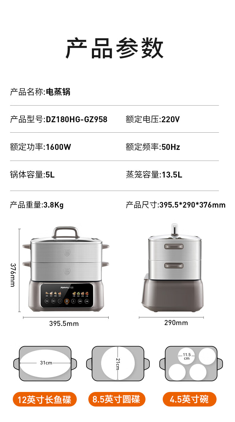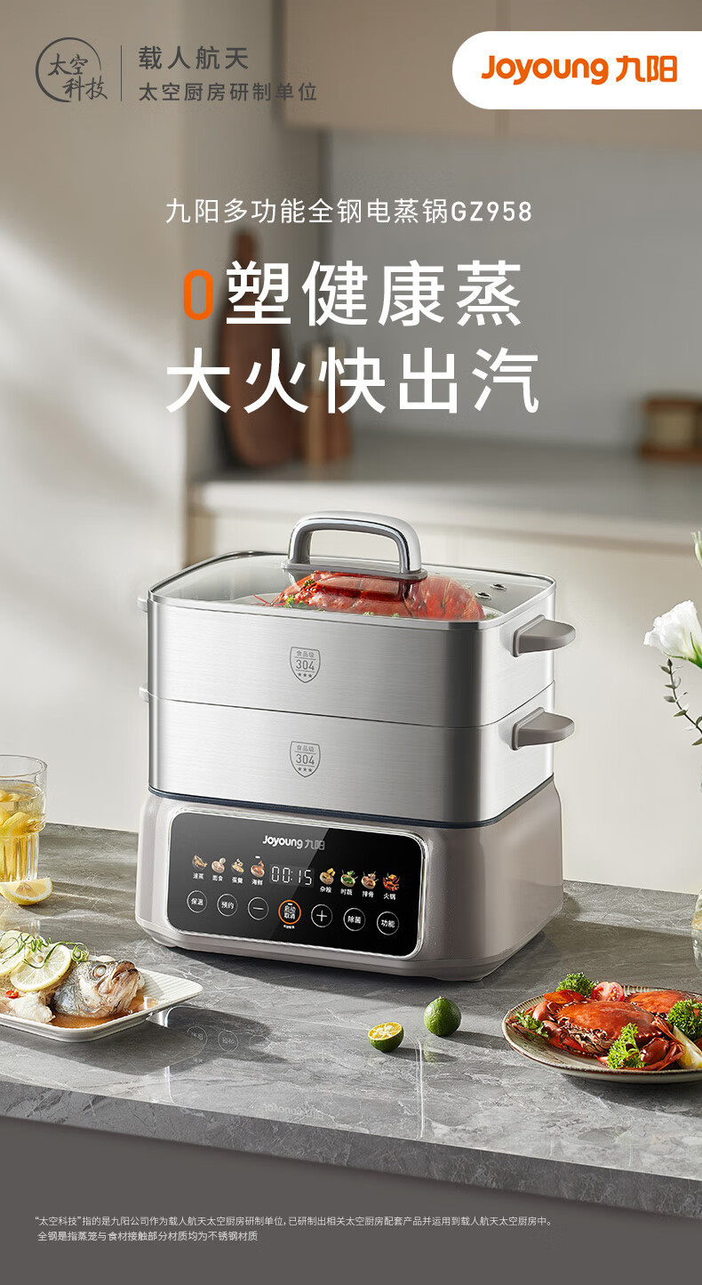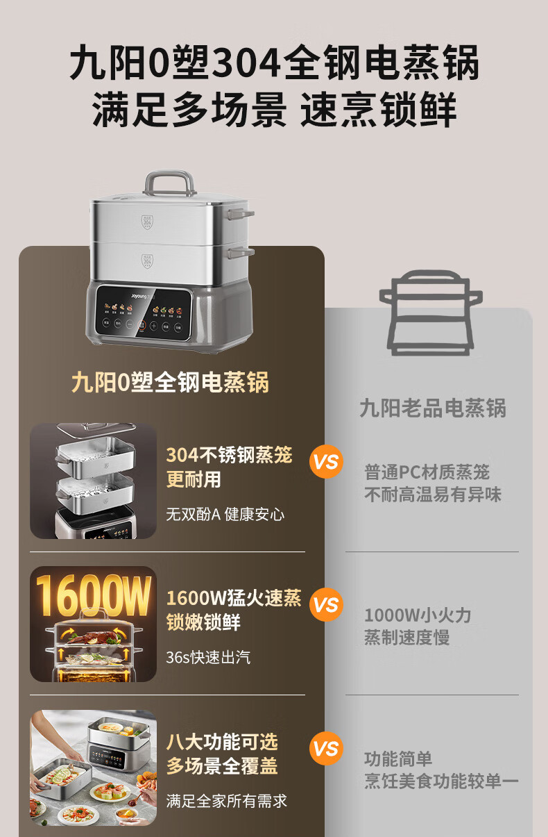 九阳(Joyoung)电蒸锅炖蒸煮一体3层18.5L大容量304不锈钢蒸屉电煮锅电火锅多功能3-6人家用可预约大功率电热锅 18.5L 【全钢蒸笼+36S出蒸汽】2层蒸笼+煮锅