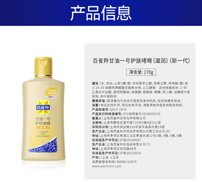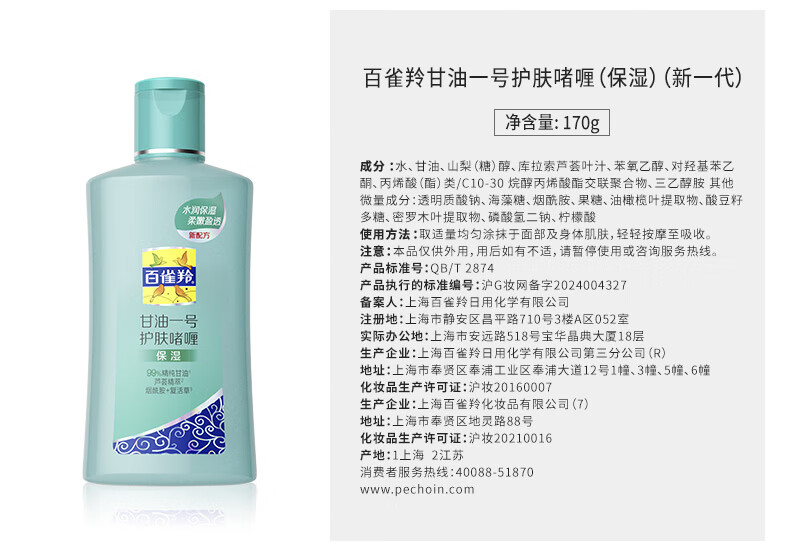 百雀羚(PECHOIN)甘油一号护肤啫喱(透亮)75G甘油脸部补水保湿滋润新年礼物
