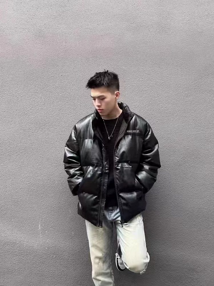 迈途立领冬季短款90白鸭绒皮衣夹克学生保暖潮开衫运动外套PU皮羽绒服 黑色 宽松版型,偏大 L