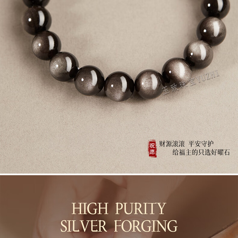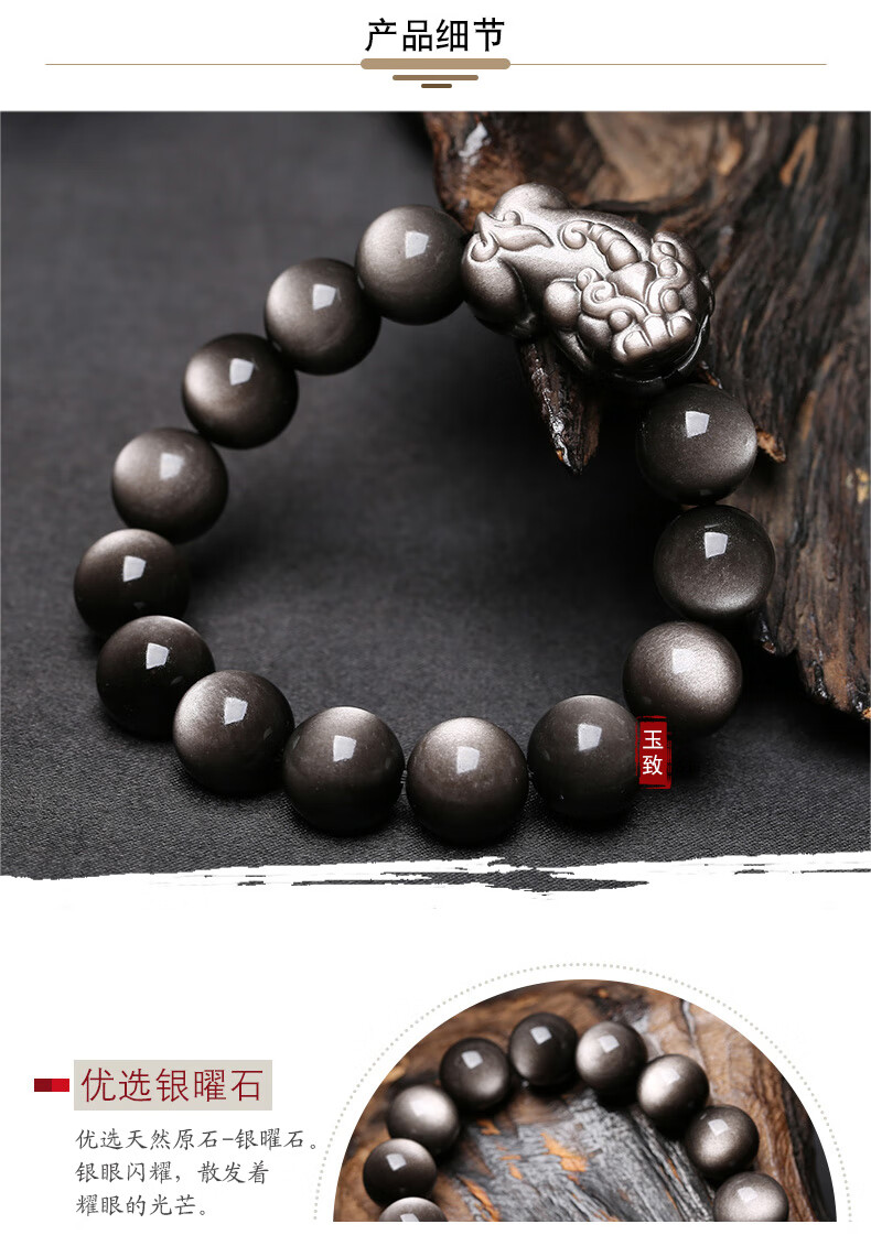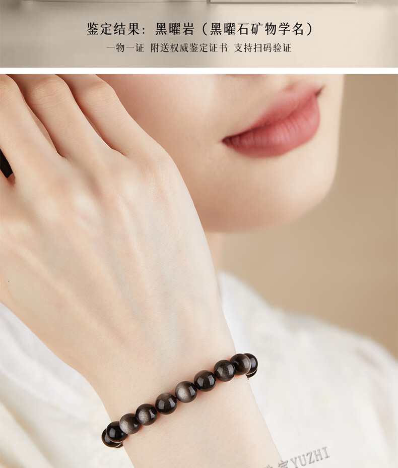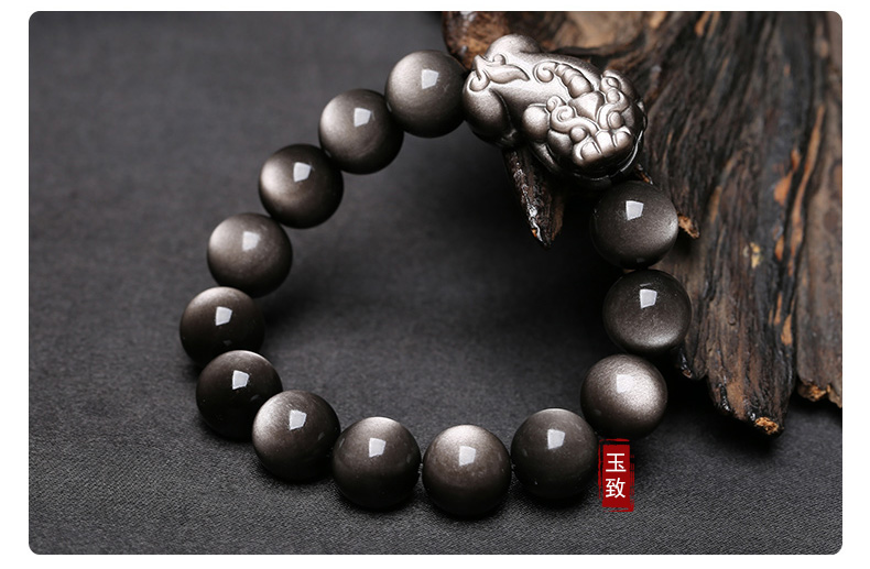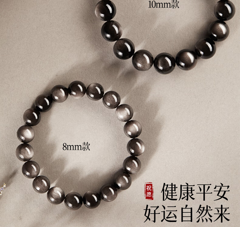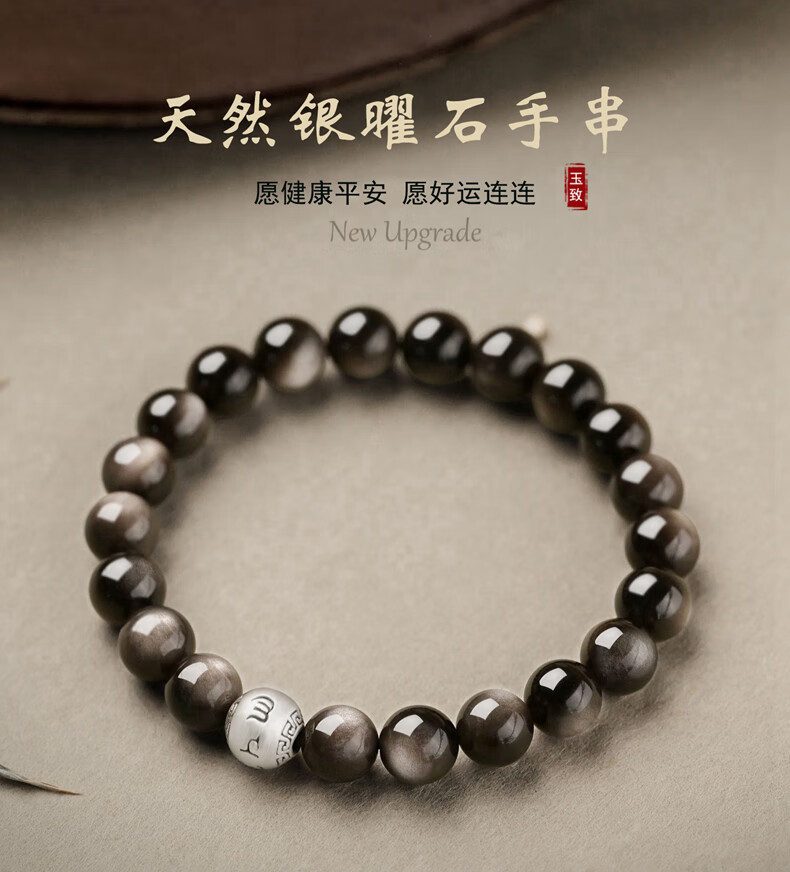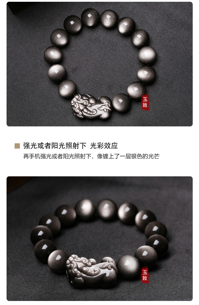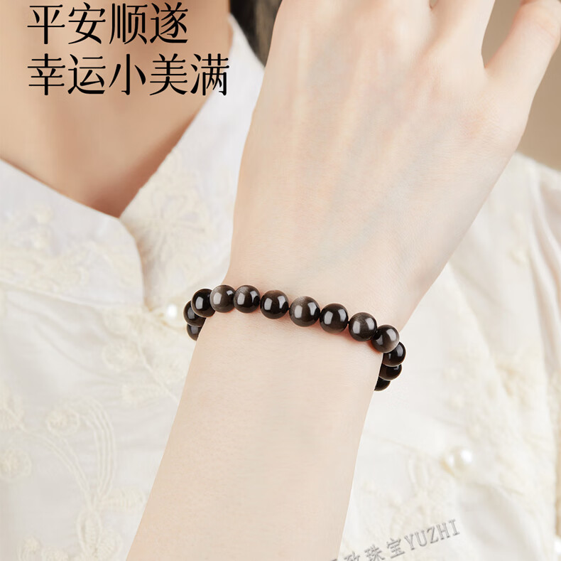玉致新年礼物天然猫眼银曜石手串黑曜石男女情侣手链节日礼物带证书 10mm珠径(标准女款)收藏小灯泡