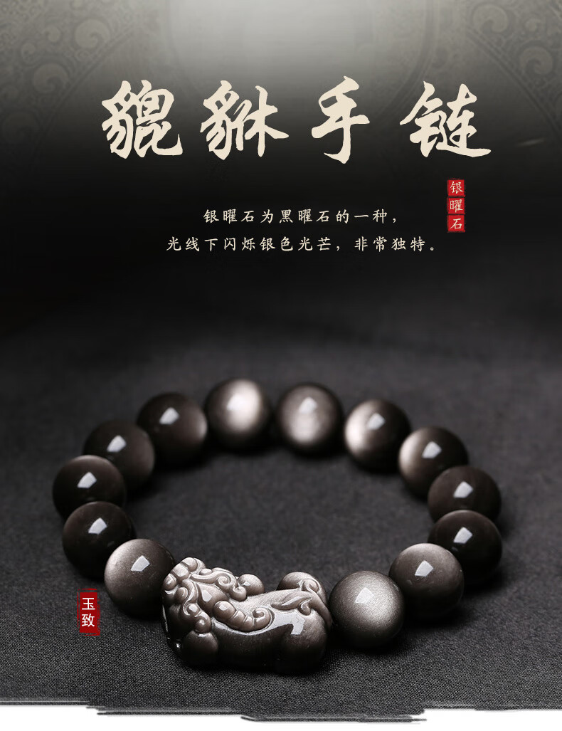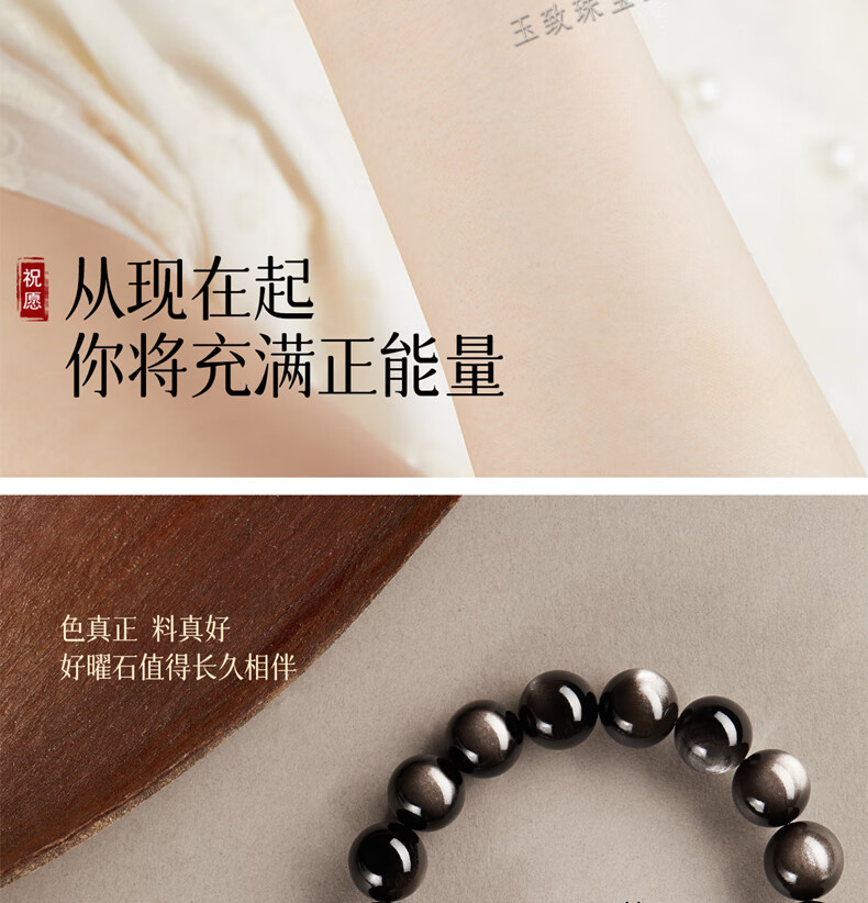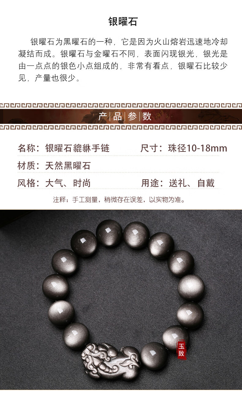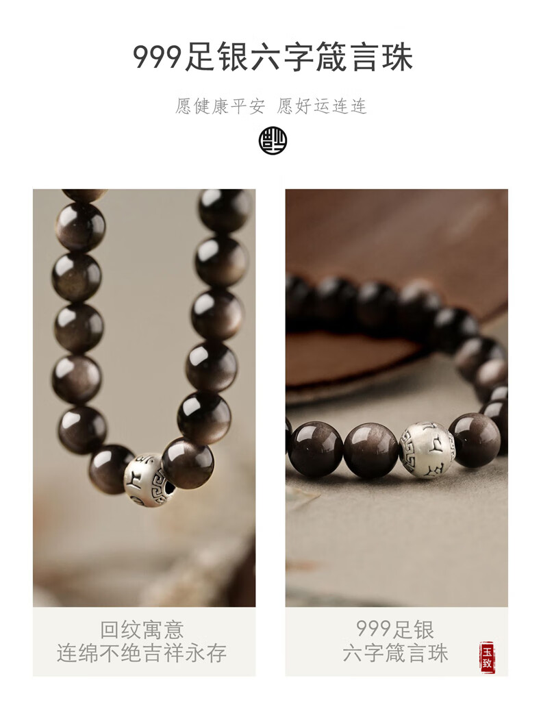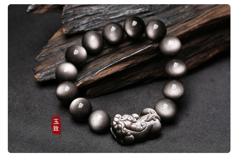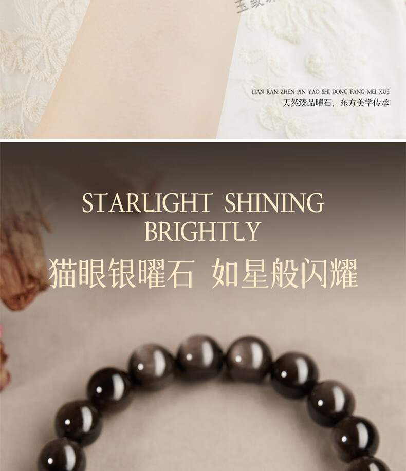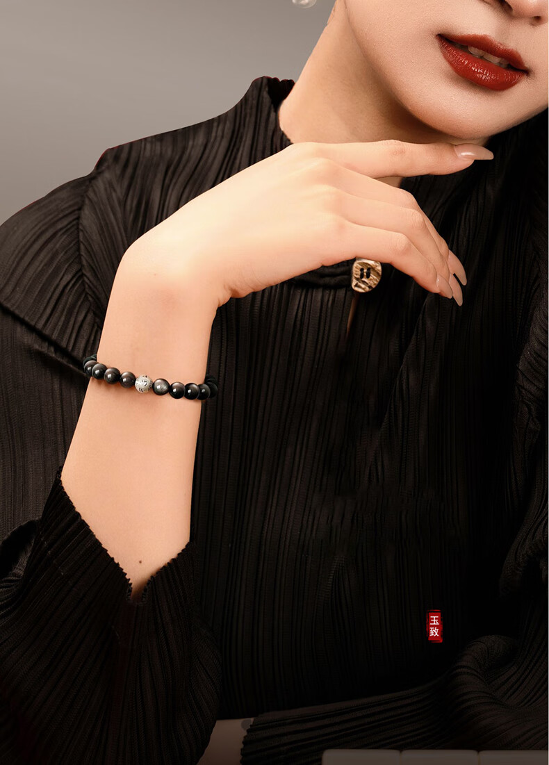 玉致新年礼物天然猫眼银曜石手串黑曜石男女情侣手链节日礼物带证书 10mm珠径(标准女款)收藏小灯泡