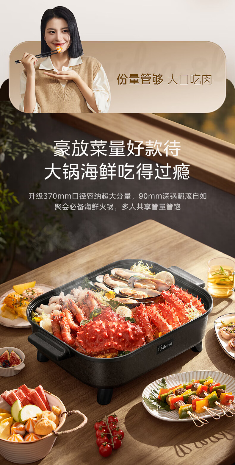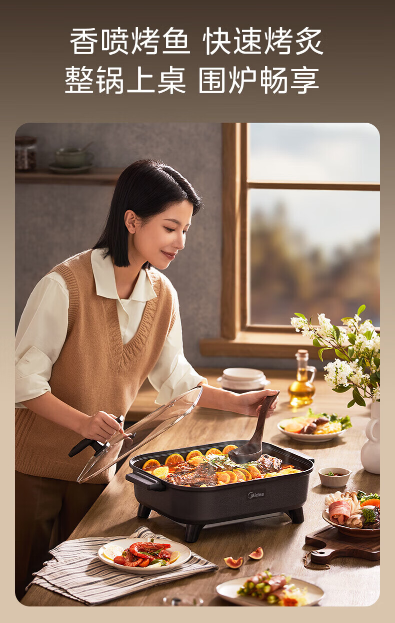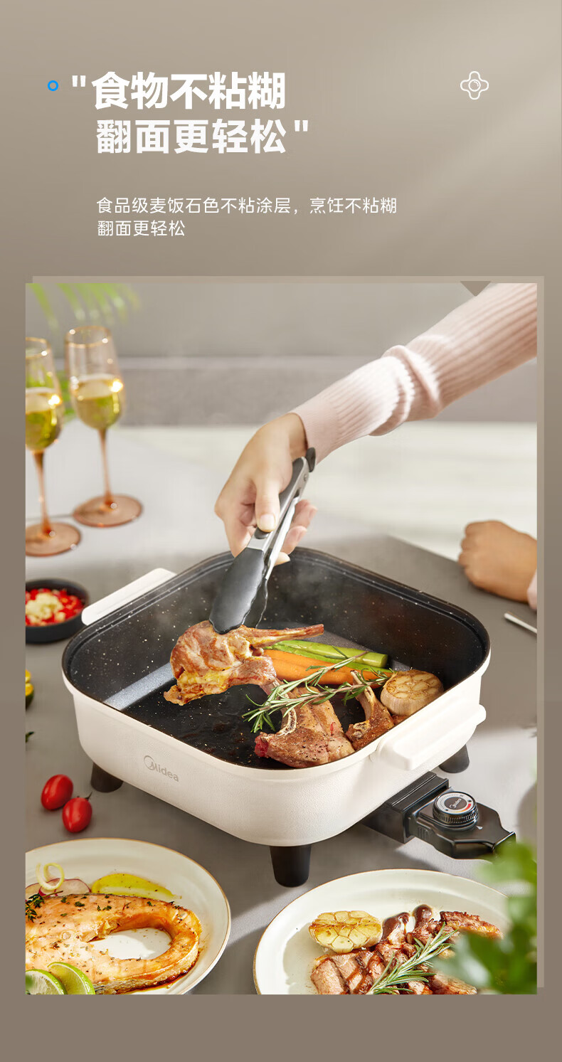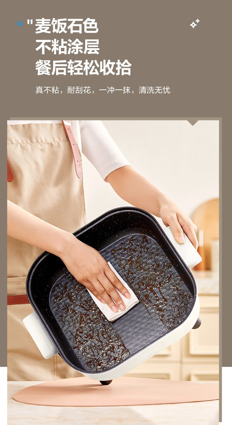 美的(Midea)电火锅电炒锅家用多功能电锅煎烤涮一体电热电煮锅速沸火锅不粘烤鱼锅鸳鸯锅电火锅专用锅多用途锅 6L +一体+1800W丨DY3030Easy101