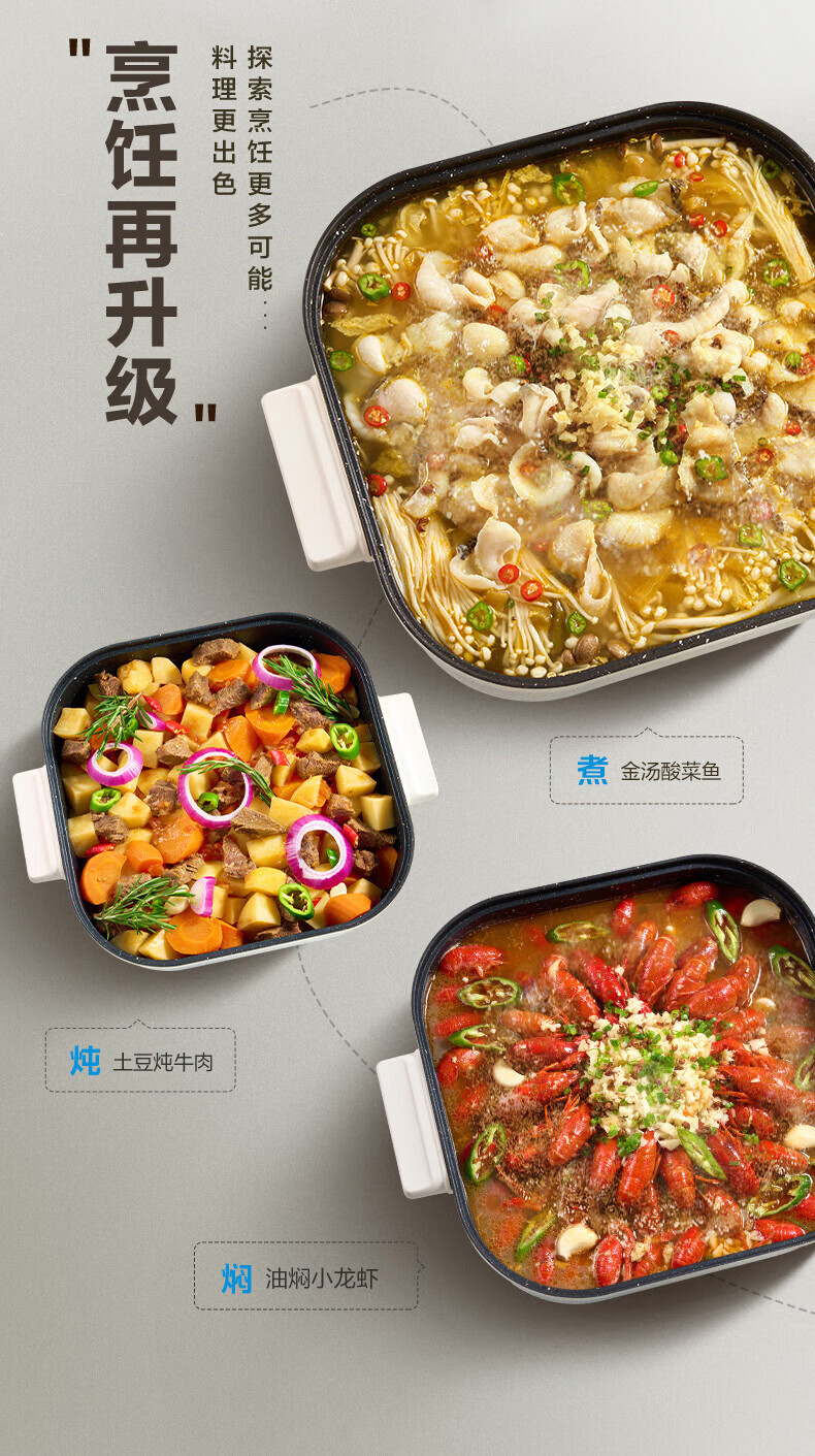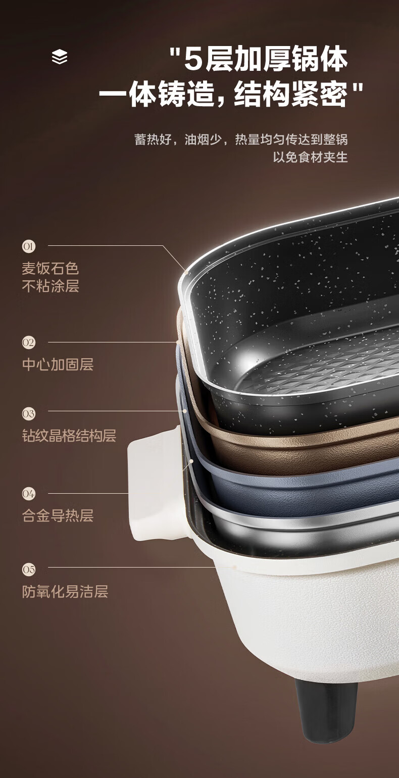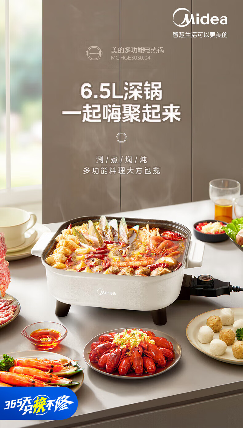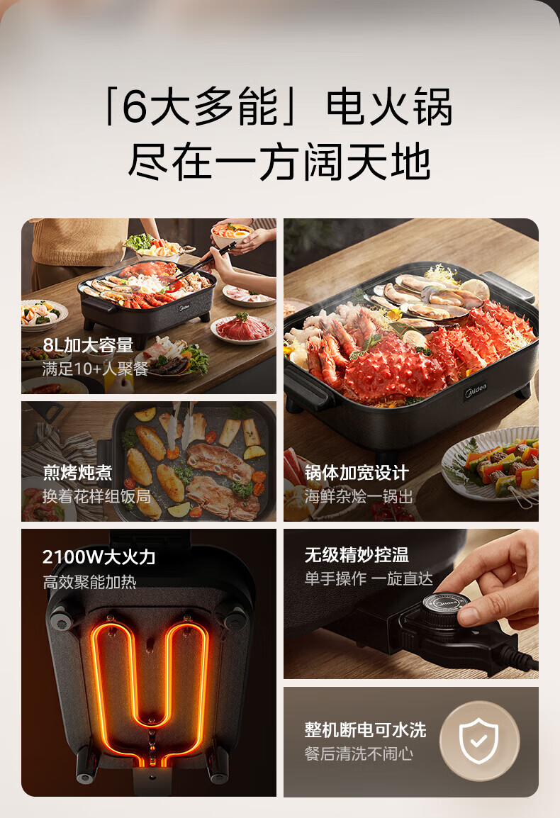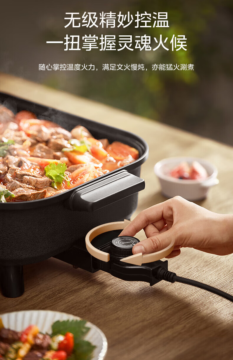 美的(Midea)电火锅电炒锅家用多功能电锅煎烤涮一体电热电煮锅速沸火锅不粘烤鱼锅鸳鸯锅电火锅专用锅多用途锅 6L +一体+1800W丨DY3030Easy101