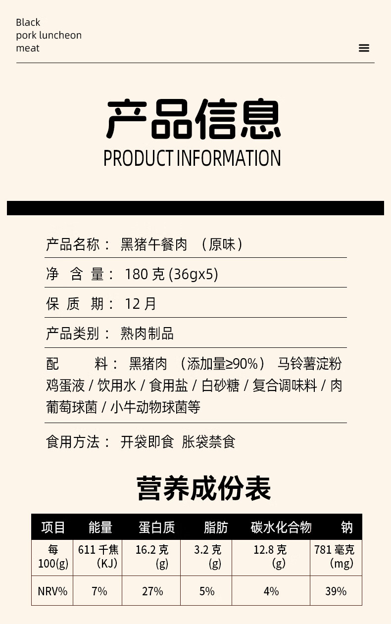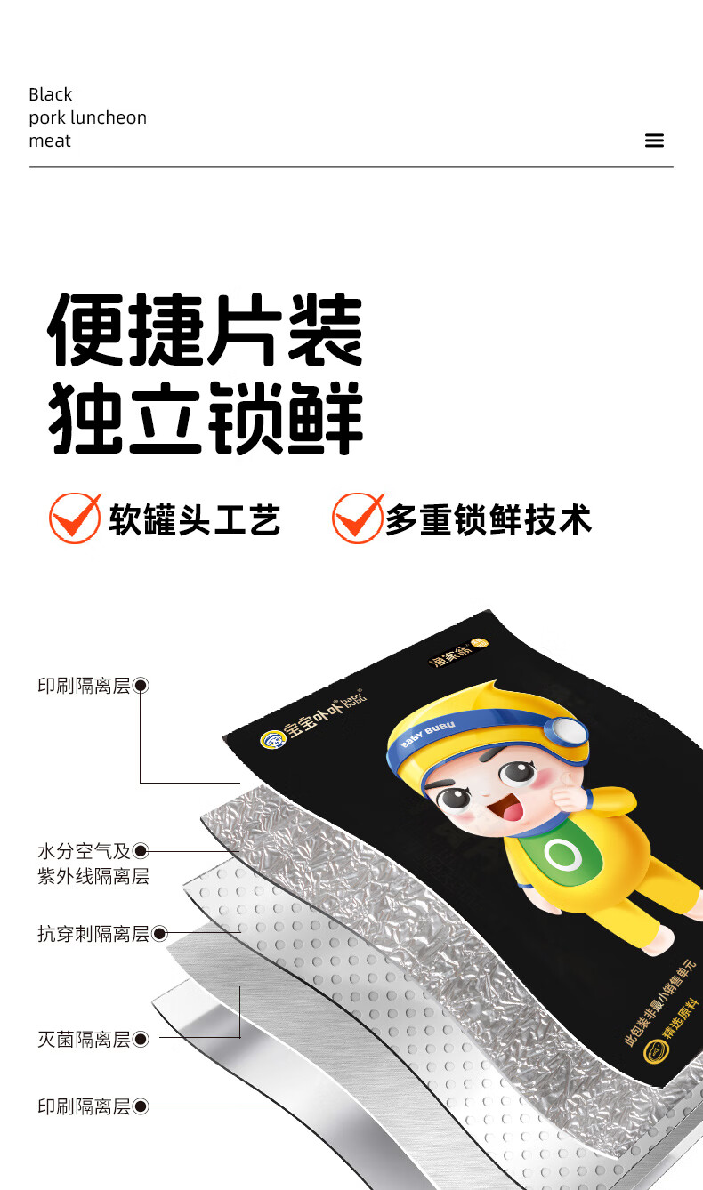 宝宝卟卟黑猪午餐肉5大片装 独立包装即食儿童零食香肠火腿肠火锅食材180g