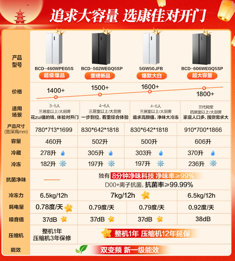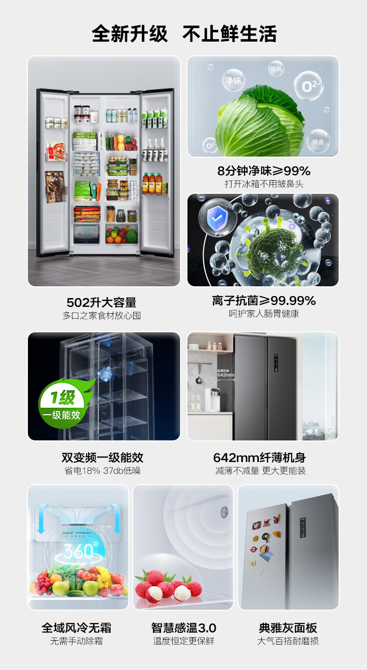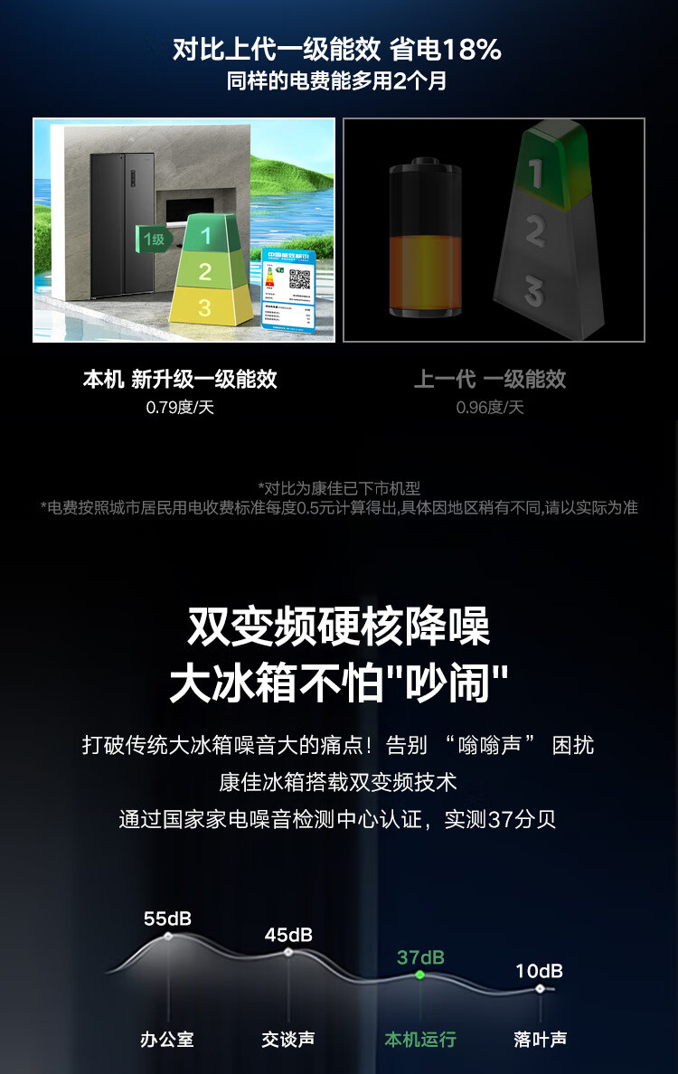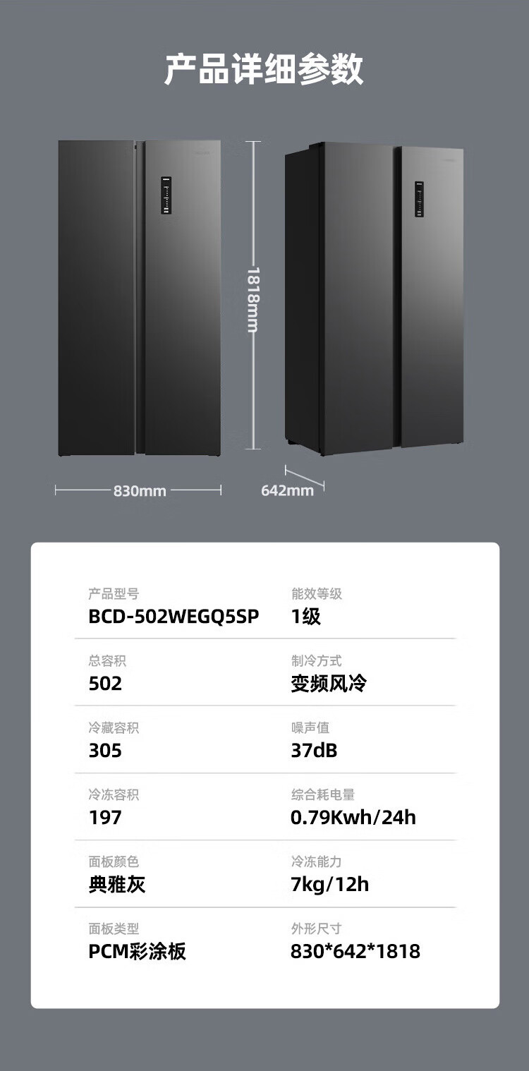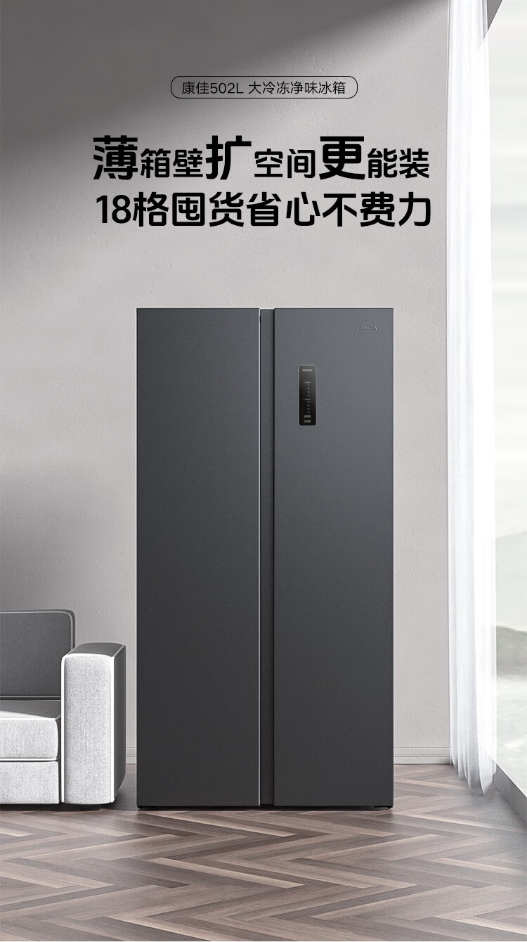康佳502升对开门冰箱8分钟净味家用一级能效变频节能无霜双循环超薄风冷大容量BCD-502WEGQ5SP国家补贴