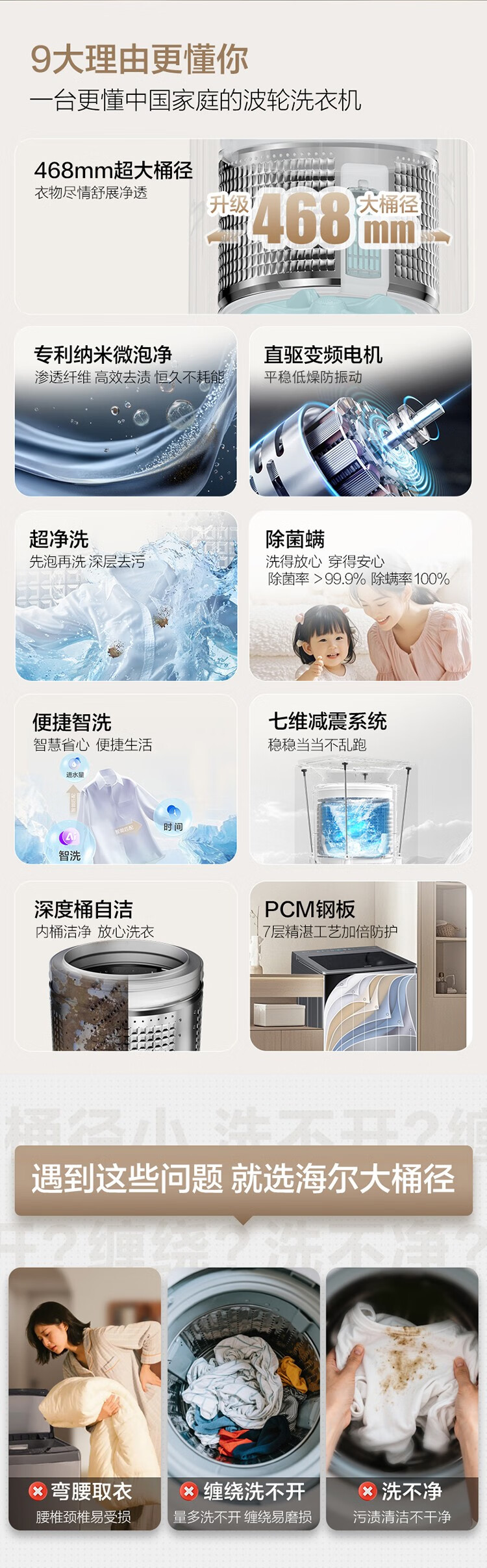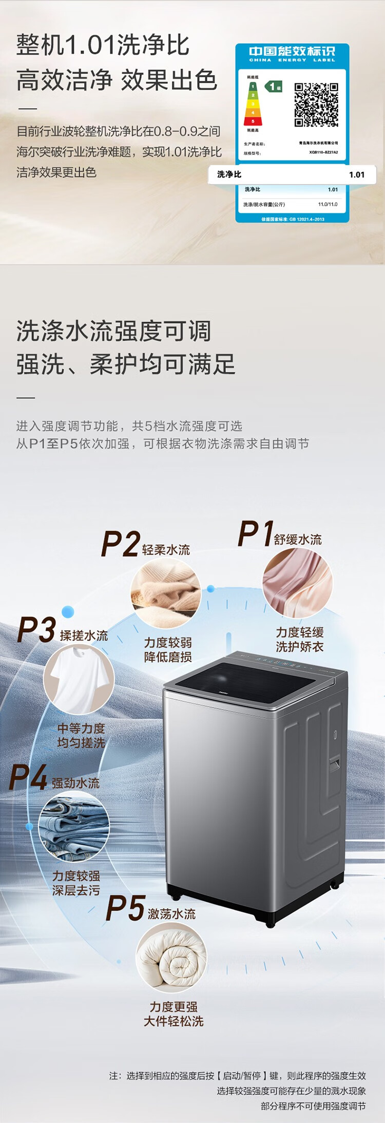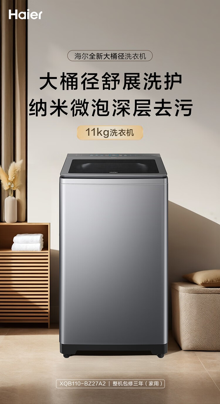 海尔波轮洗衣机全自动11KG 新品 升级大筒 自编程 AI智洗 七维减震 玻璃盖 直驱一级变频XQB110-BZ27A2