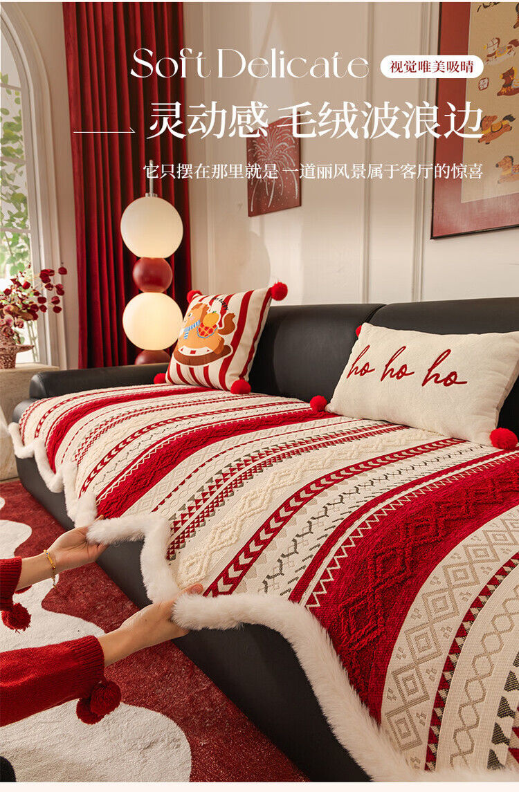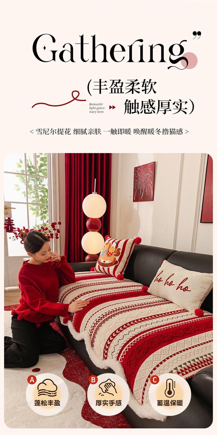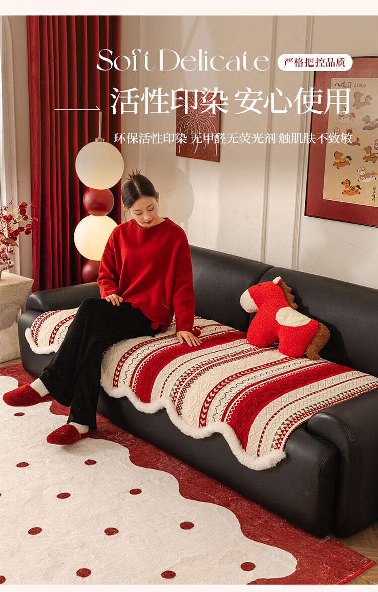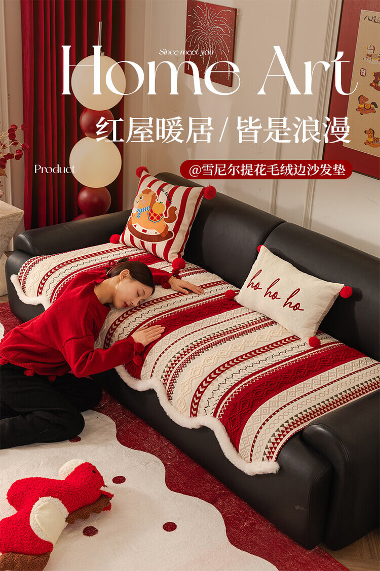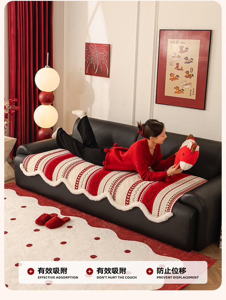ALPLUME新年喜庆沙发垫2026新款节日氛围感红色坐垫高级感防滑防猫抓盖布 雪绒-红色 三人位 【一片】90*210cm三人位