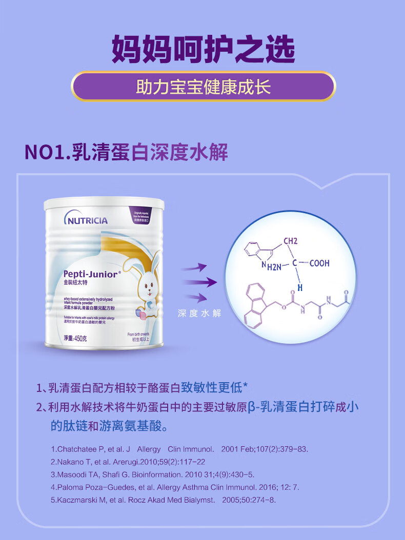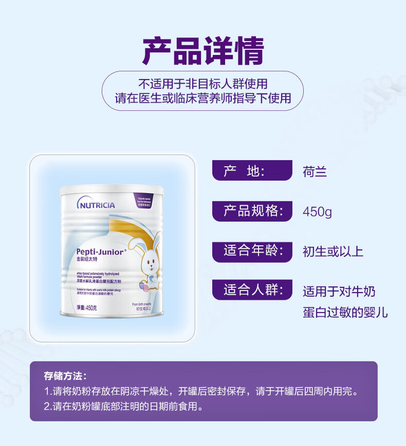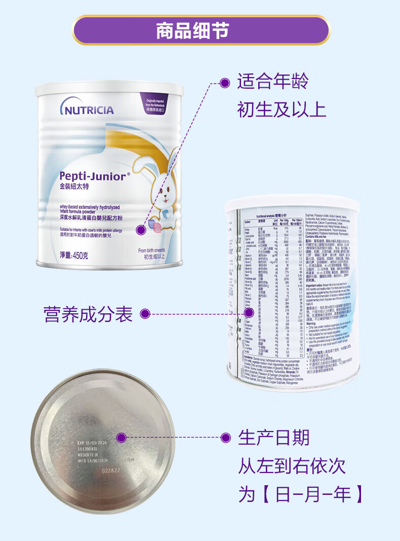 纽太特 金装 深度水解乳清蛋白婴儿配方粉 无乳糖 初生及以上适用 450g