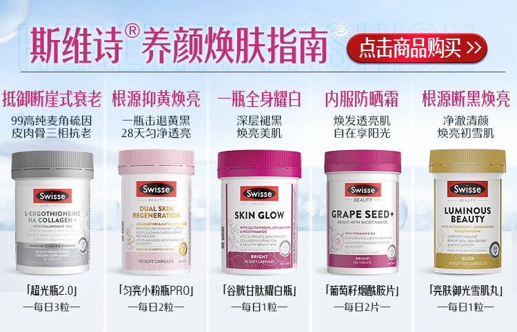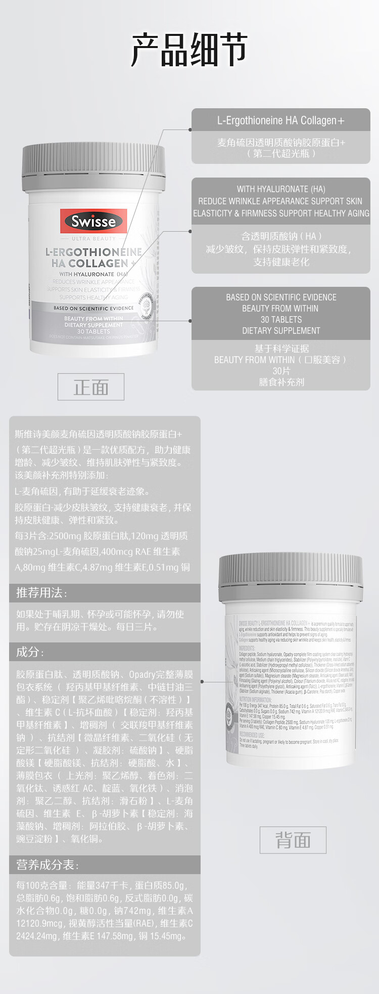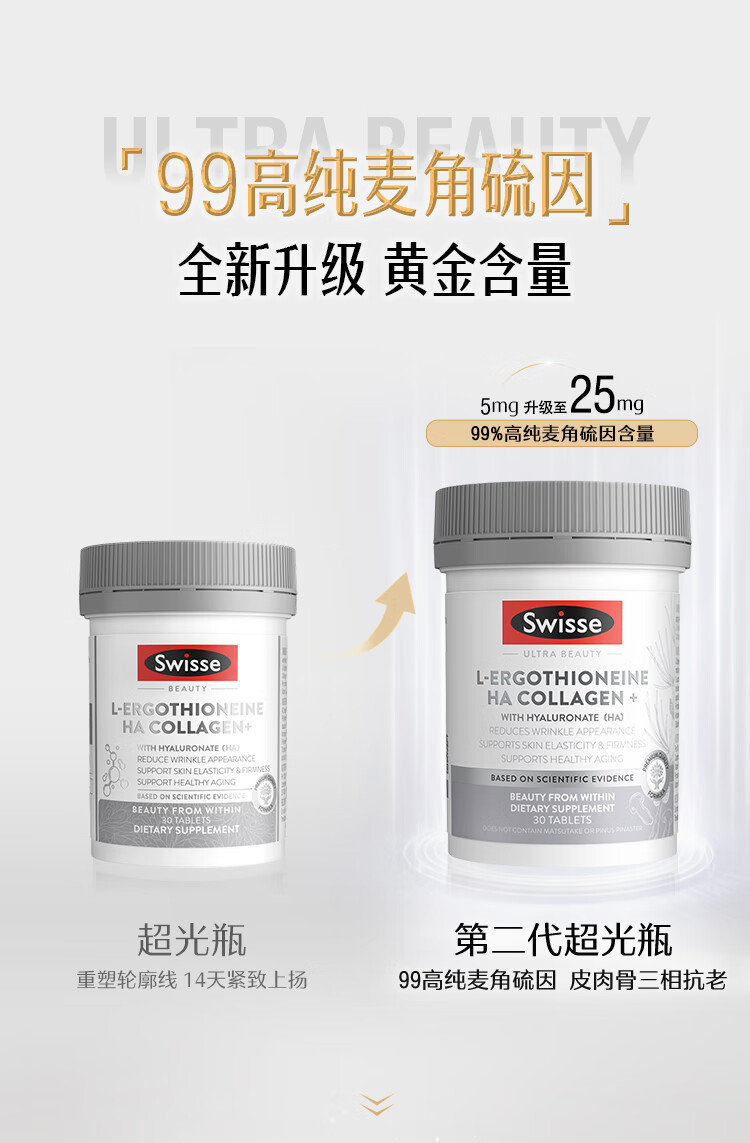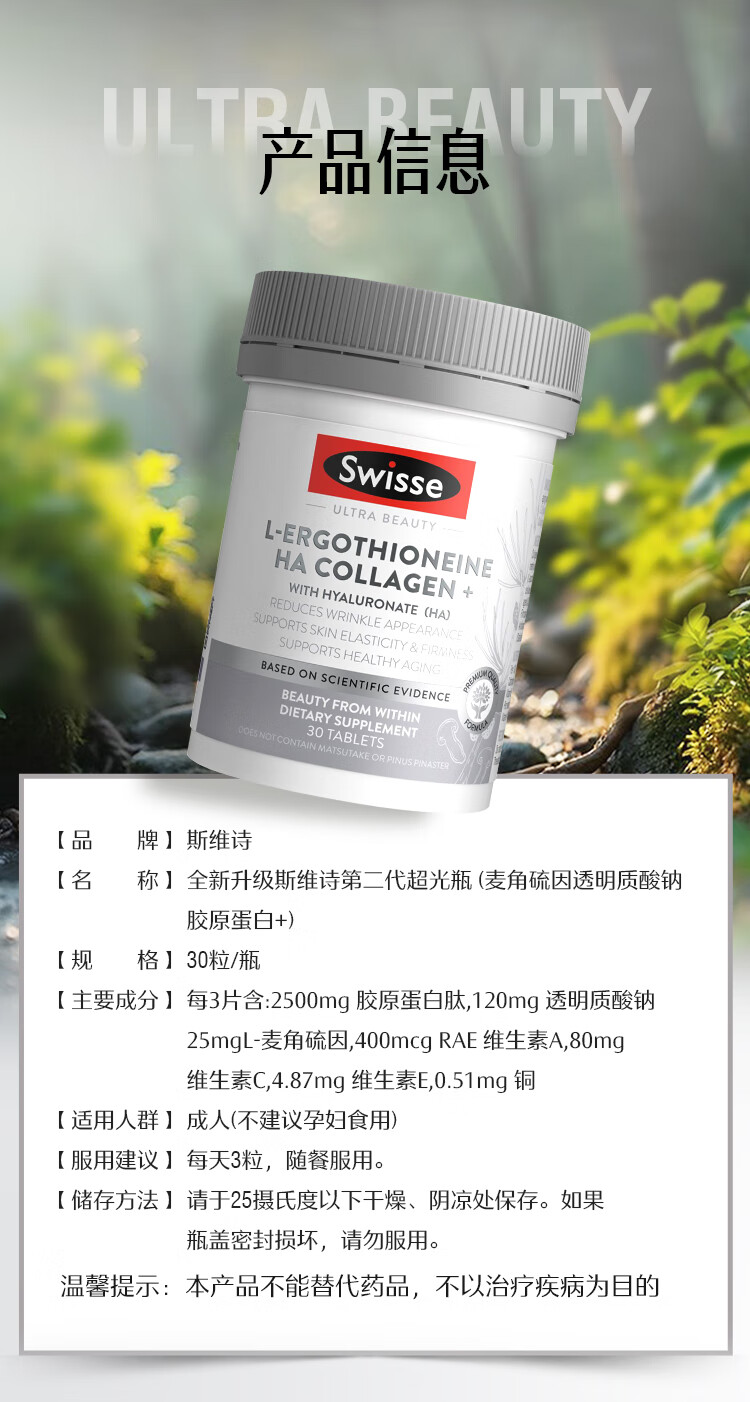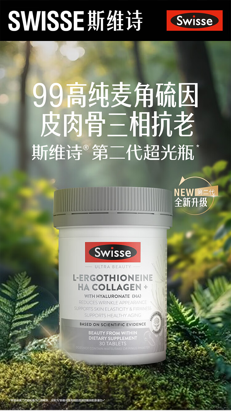 Swisse斯维诗二代超光瓶 99%高纯麦角硫因胶原蛋白肽玻尿酸养颜抗衰30粒