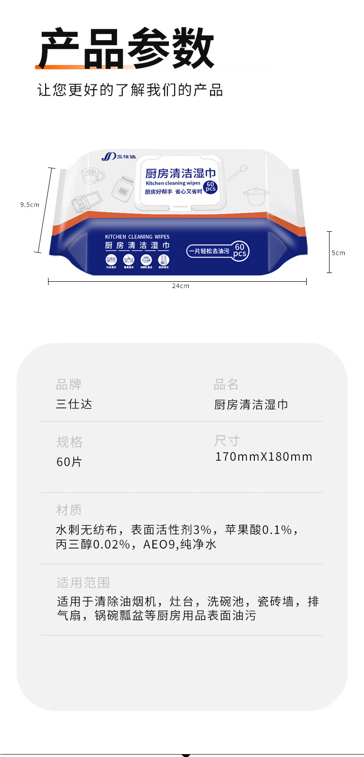 三仕达厨房湿巾60片翻盖去油污湿巾厨房用纸家用卫生清洁油烟机湿巾纸 【购买最多】60片*4包