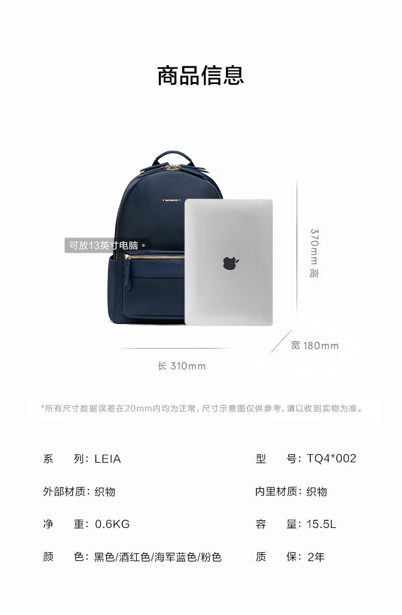 新秀丽(Samsonite)双肩包13英寸电脑包女士背包大学生书包简约时尚旅行包新年礼物