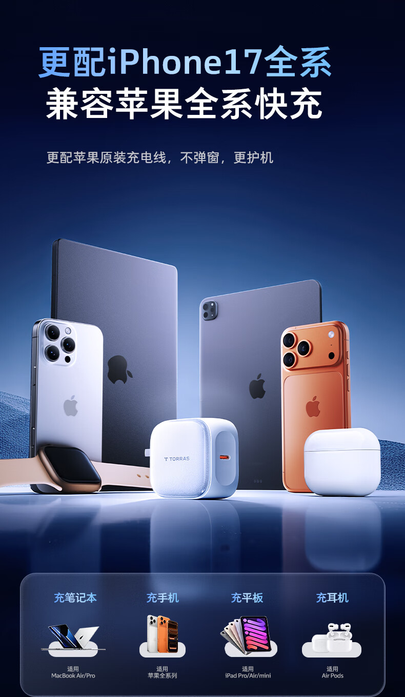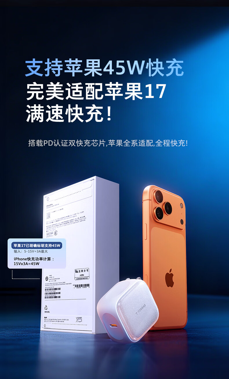 图拉斯苹果17充电器【京东金榜TOP】适配原装45W充电头iphone17promax15小冰充16手机快充星宇白