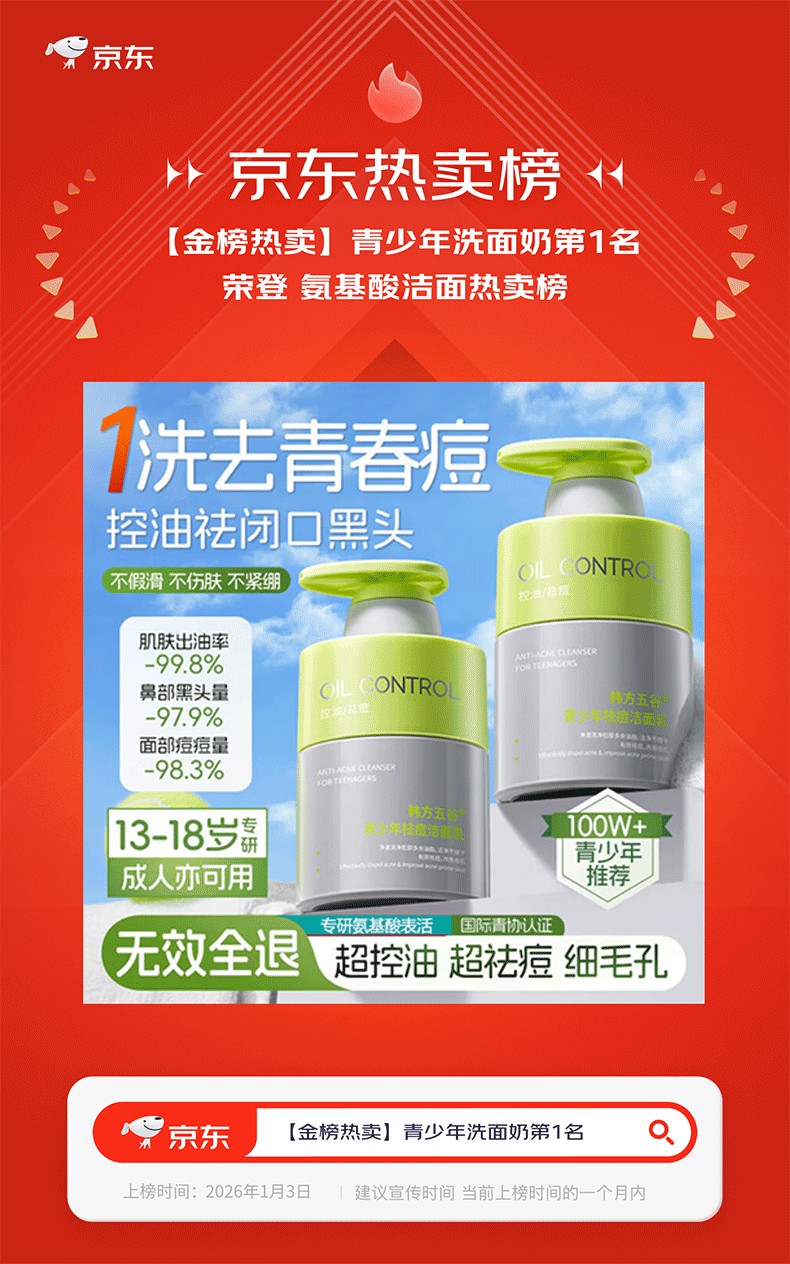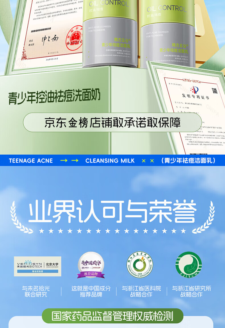 韩方五谷氨基酸青少年洗面奶控油祛痘淡印去黑头6-12-18岁学生儿童洁面乳