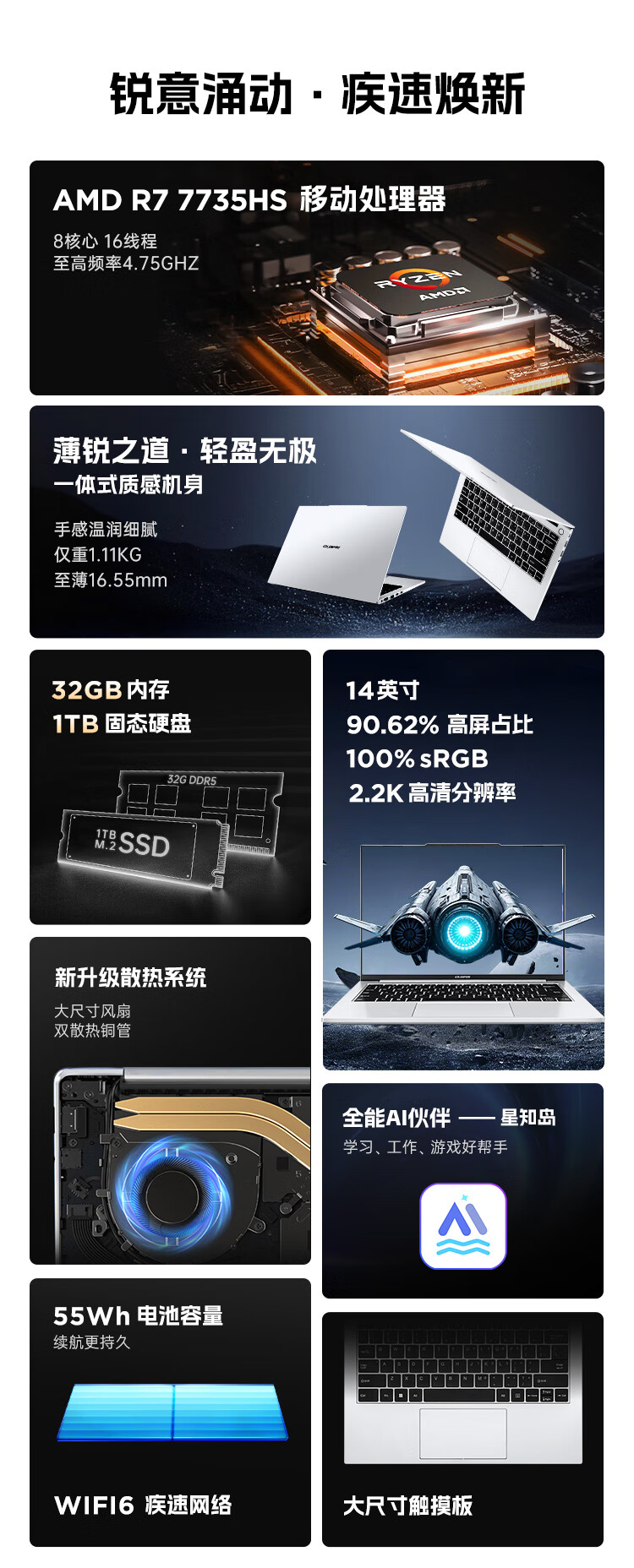COLORFIRE E14 七彩虹橘宝14英寸轻薄笔记本电脑 办公学生轻薄本 锐龙R7-7735HS 32G 1TB 羽白 2.2K超清屏
