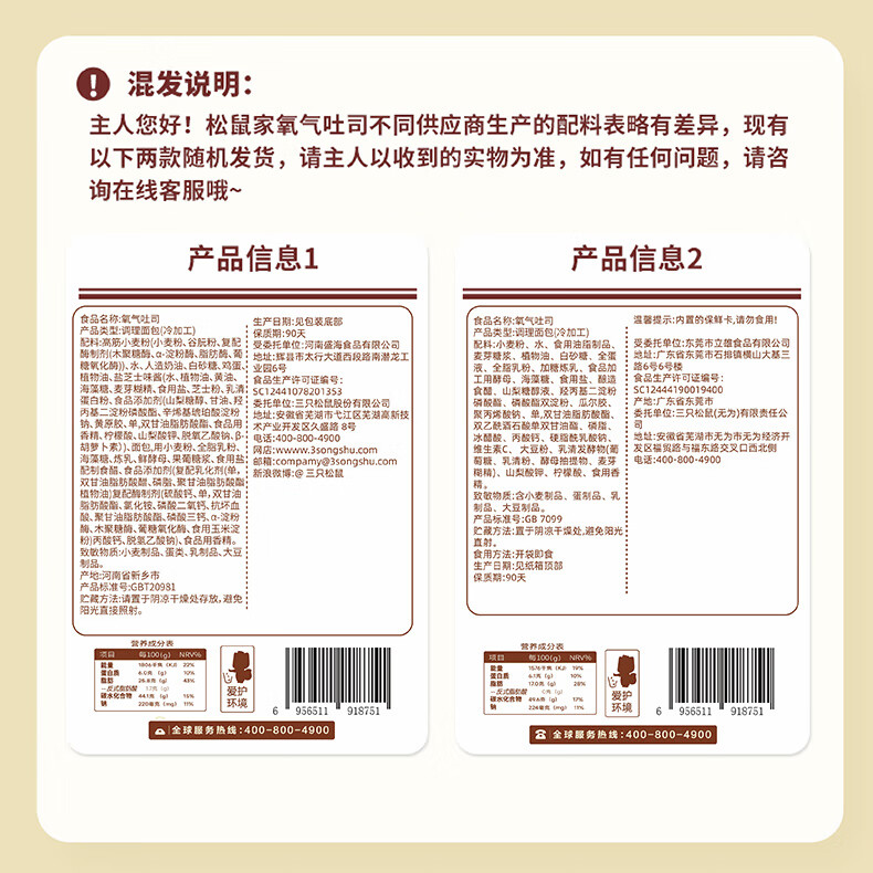 三只松鼠氧气吐司炼乳夹心早餐代餐休闲零食吐司面包办公室点心800g/箱