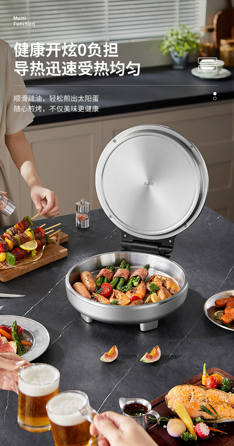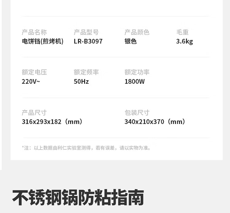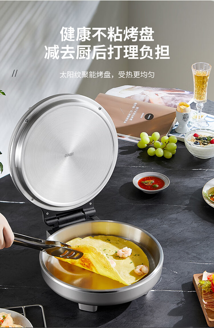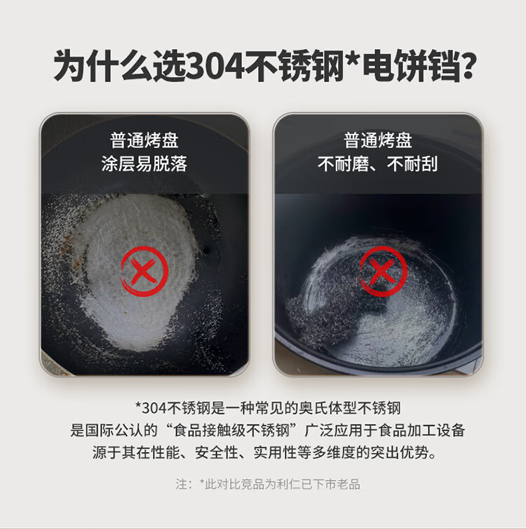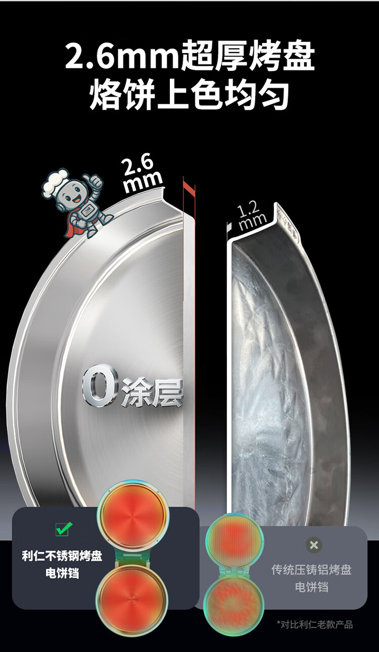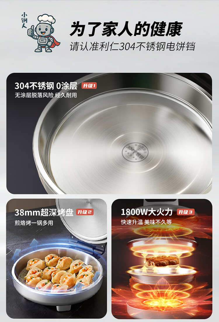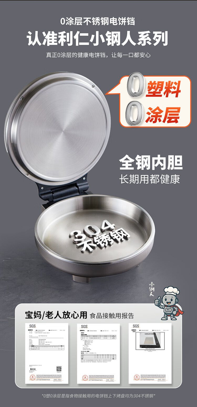 利仁(Liven)小钢人不锈钢电饼铛家用0涂层1800W双面加热电饼档烙饼专用锅无涂层电煎锅早餐机LR-B3097