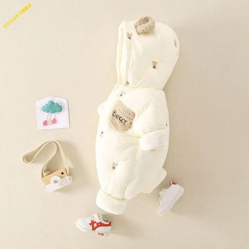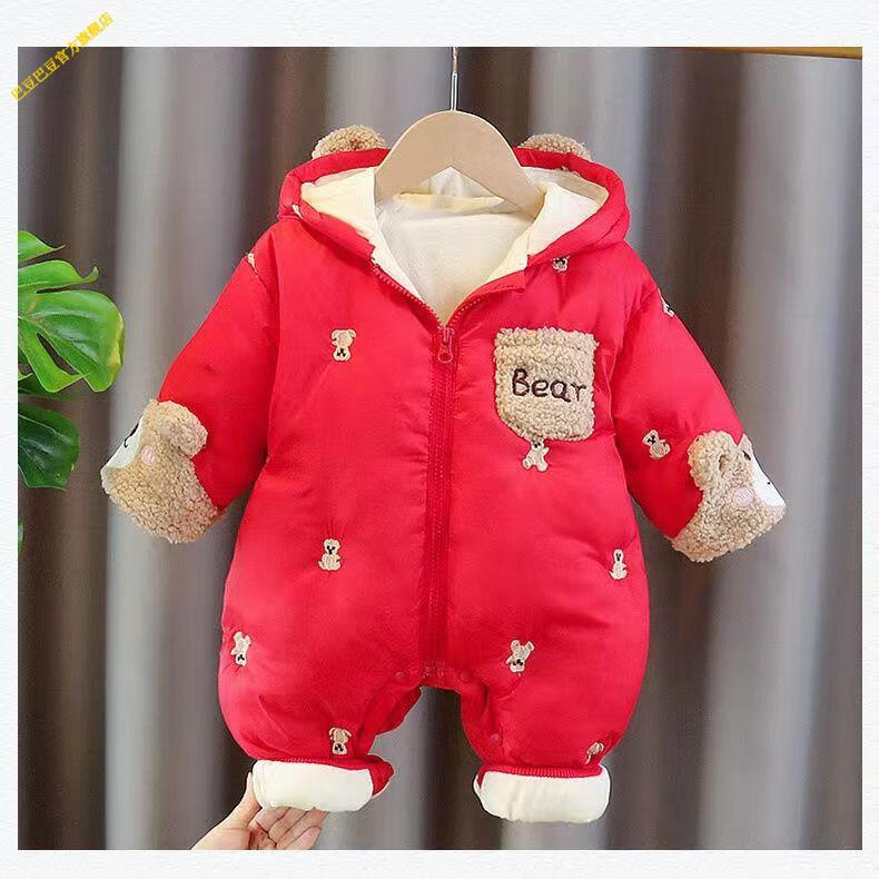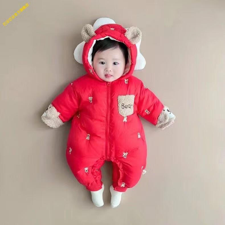 G.duck小黄鸭新生婴儿冬装加绒加厚连体衣男女宝宝满月冬季可爱超萌羽绒 TZ加厚外出服【小熊连帽】红色 90cm 90