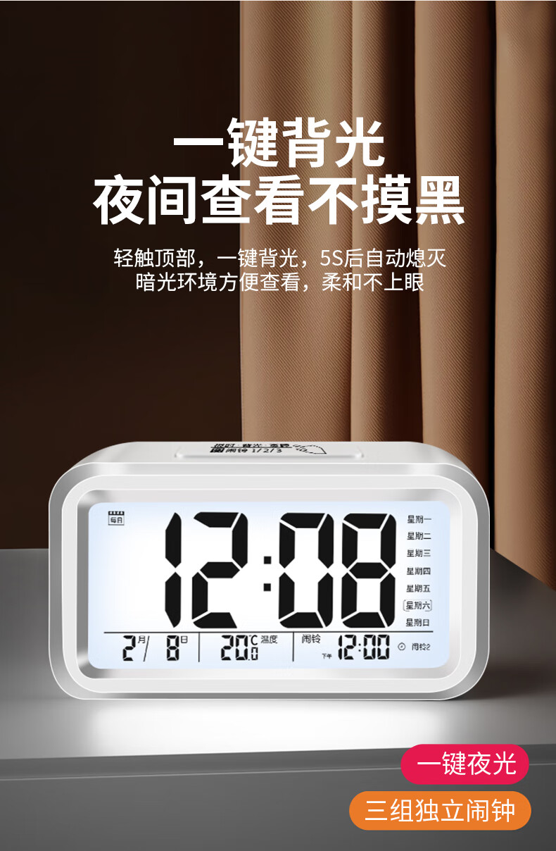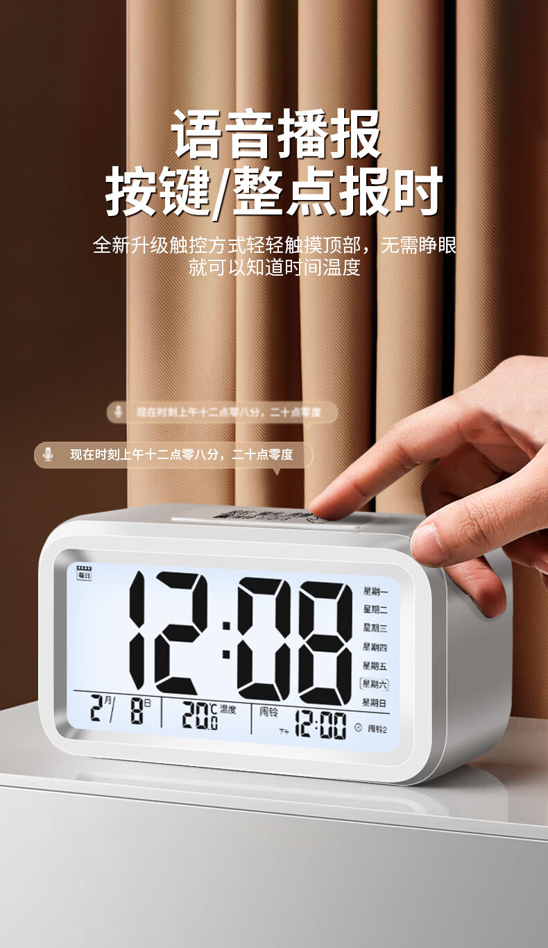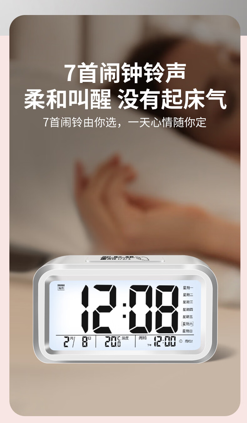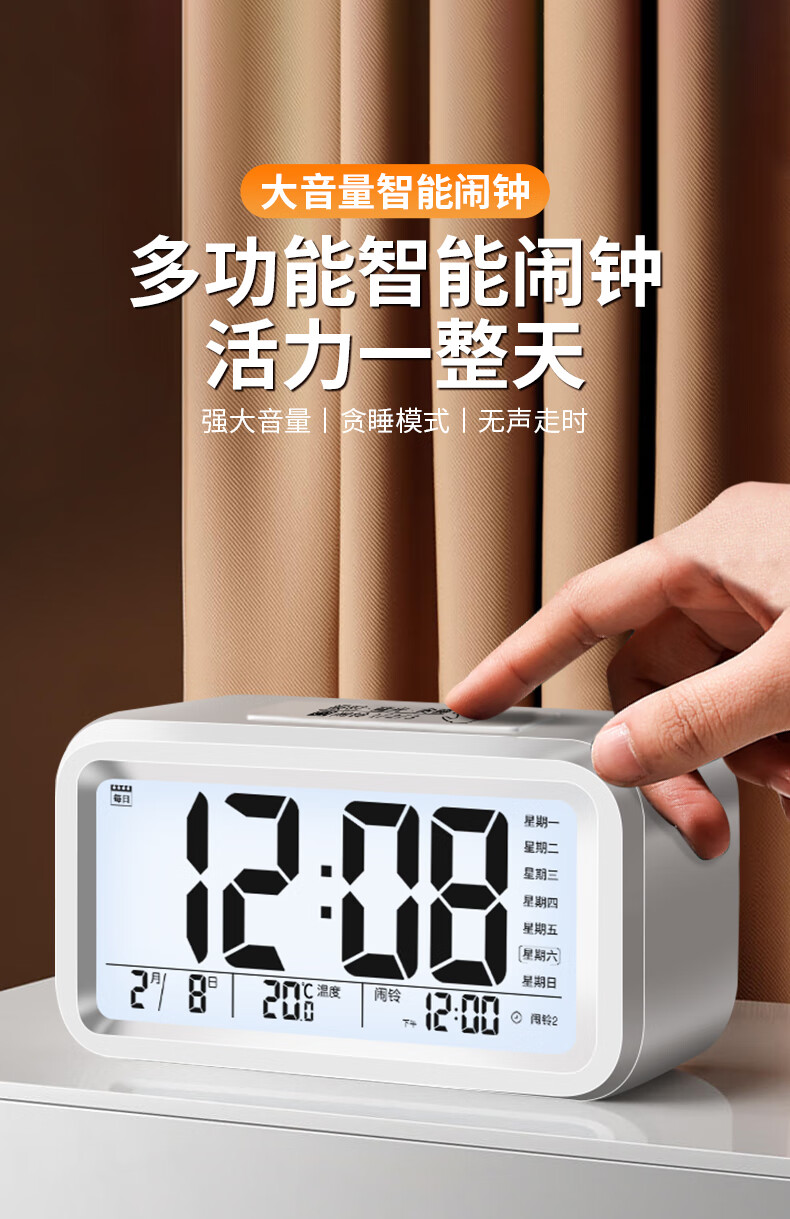 万梭 可充电多功能电子闹钟小孩学生用床头静音创意夜光小闹铃抖音 399充电版【顶配】白色