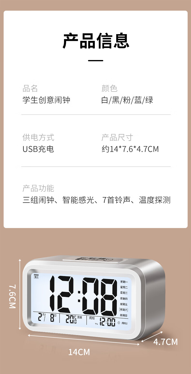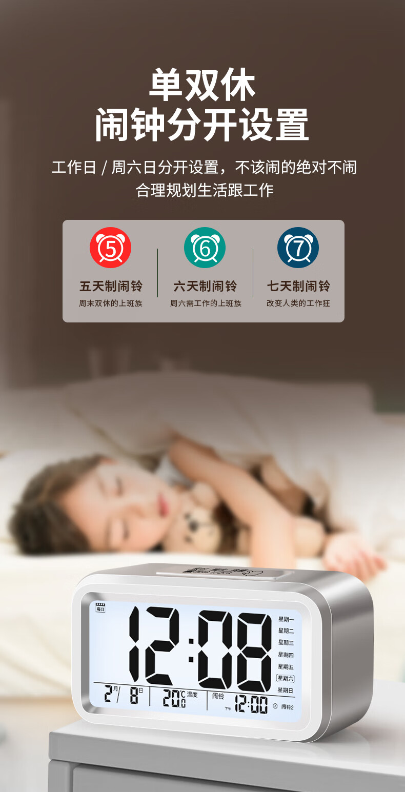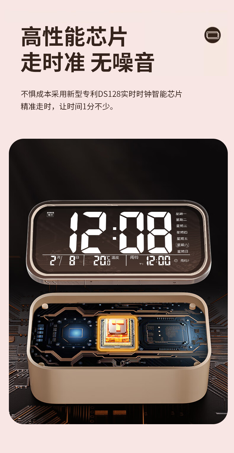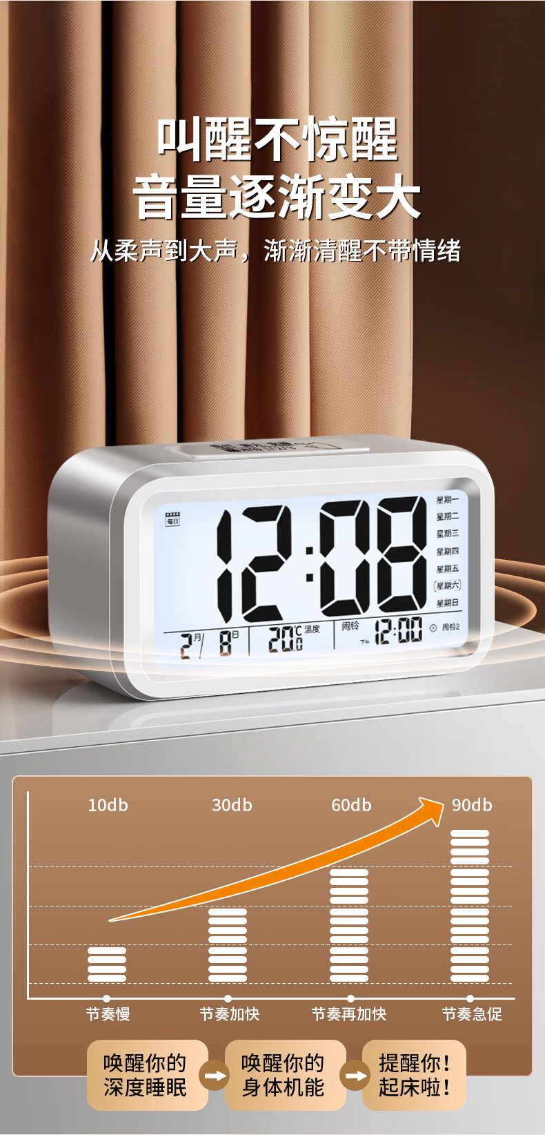 万梭 可充电多功能电子闹钟小孩学生用床头静音创意夜光小闹铃抖音 399充电版【顶配】白色