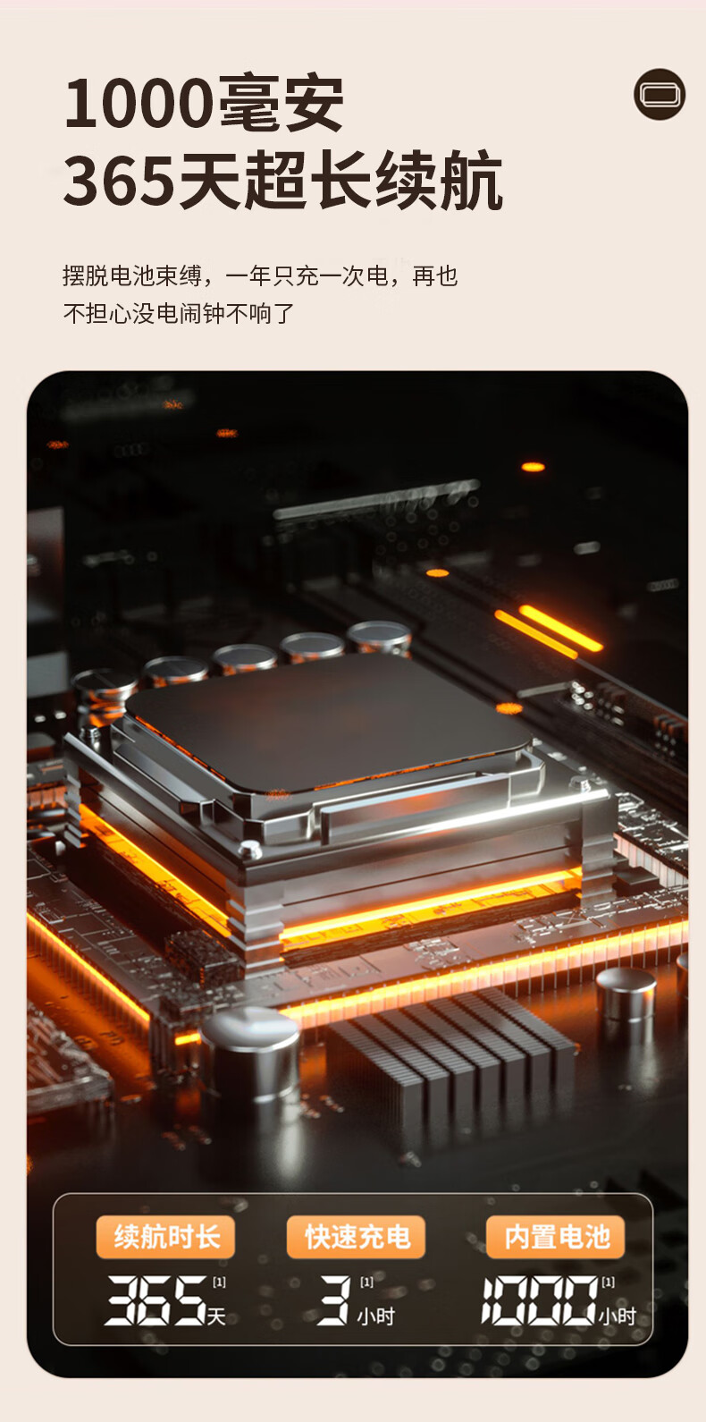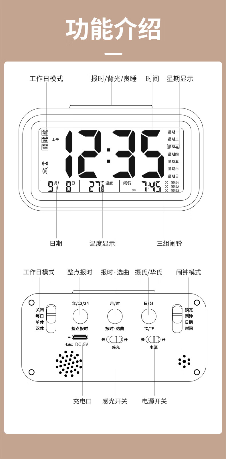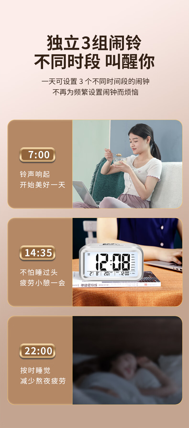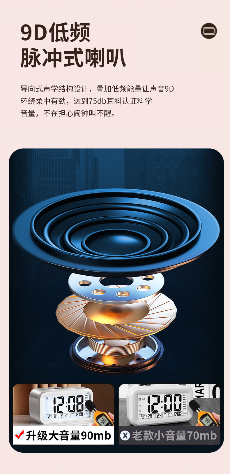万梭 可充电多功能电子闹钟小孩学生用床头静音创意夜光小闹铃抖音 399充电版【顶配】白色