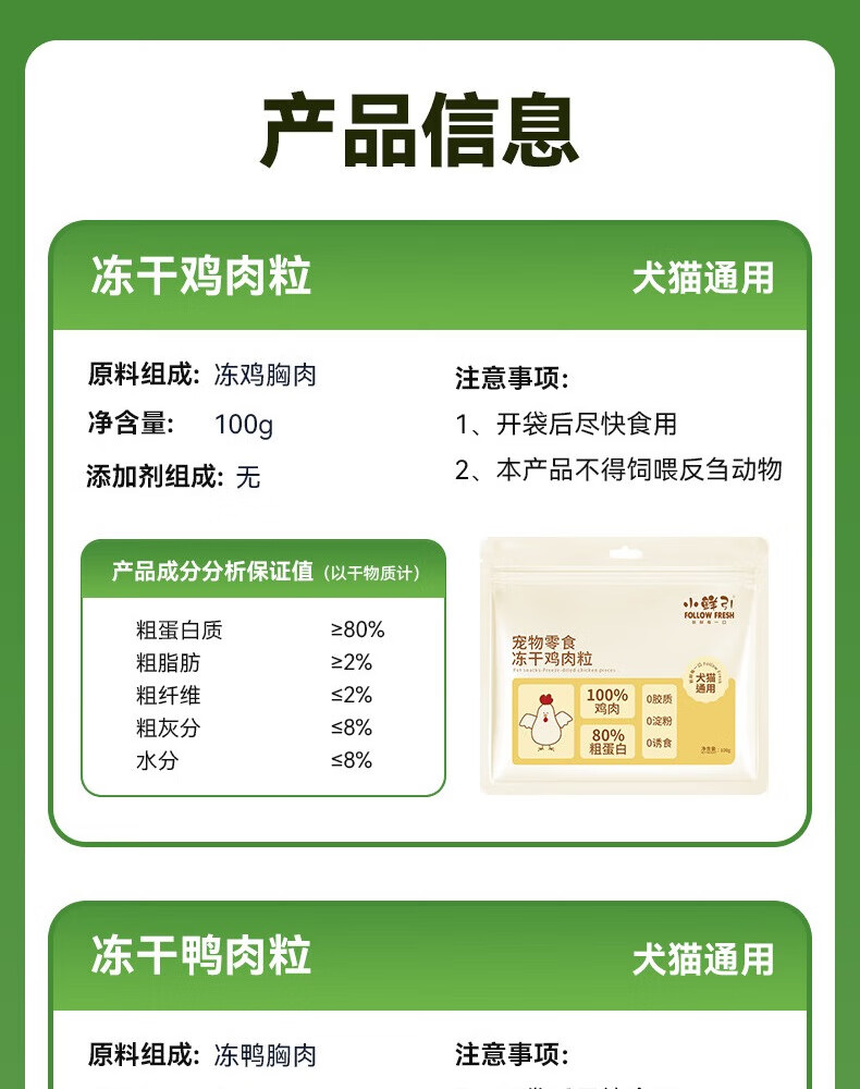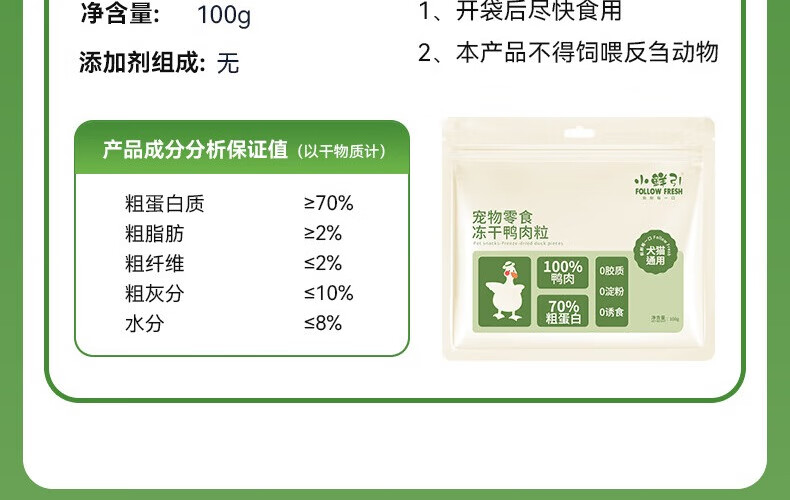 小鲜引;FOLLOW FRESH冻干鸭肉粒猫零食冻干成猫幼猫整块原切猫粮伴侣纯肉原切肉粒100g 冻干鸭肉粒
